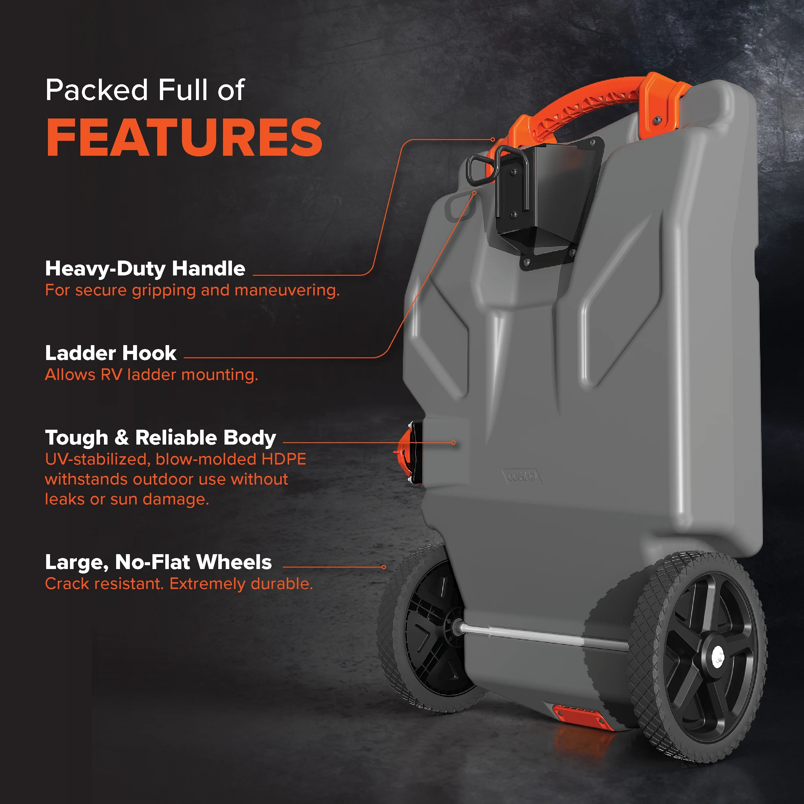 - RV TOTE TANK FEATURES: Rhino��s 21-Gallon Tote Tank is equipped with (2) oversized wheels, a large handle, tank rinser, and ladder hook.