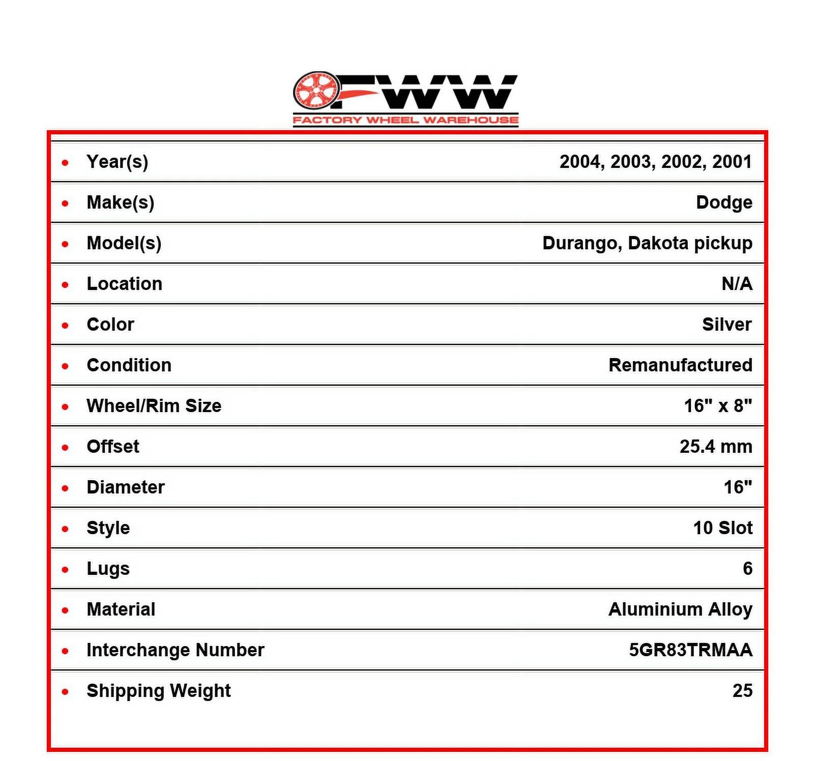 This Factory OEM DODGE Aluminium Alloy 10 SLOT wheel comes stock on 2004, 2003, 2002, 2001, 2001 DODGE DAKOTA PICKUP, DURANGO. The OEM part number(s) for the rim are 560, 5GR83PAKAB. This is a 6 lug wheel with a 16 inch diameter, width of 8 inch and an offset of 25.4 mm. The finish on the wheel is SILVER.