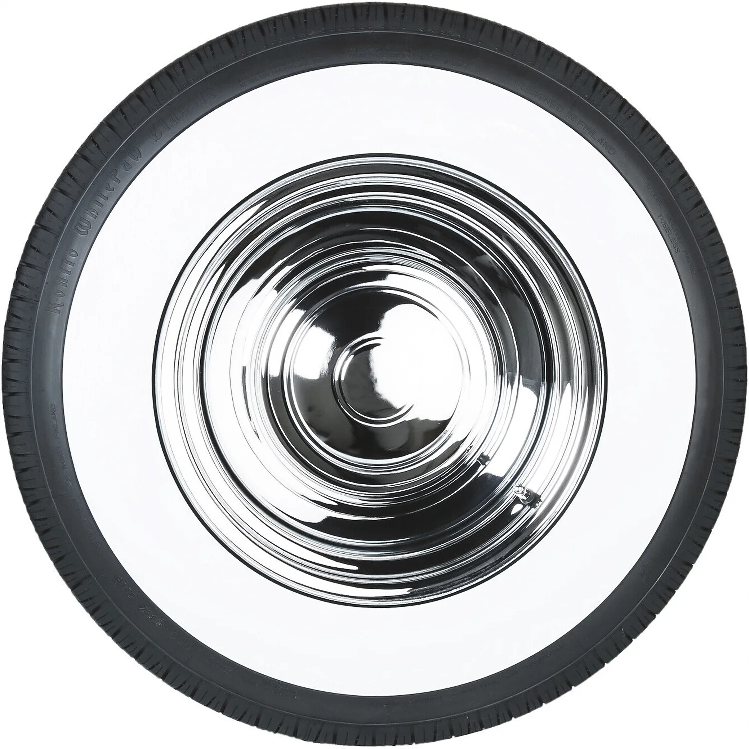 The Kontio Tyres WhitePaw Classic is a touring, summer tire manufactured for passenger vehicles and SUVs. This model features a wide white sidewall, which offers a vintage aesthetic.