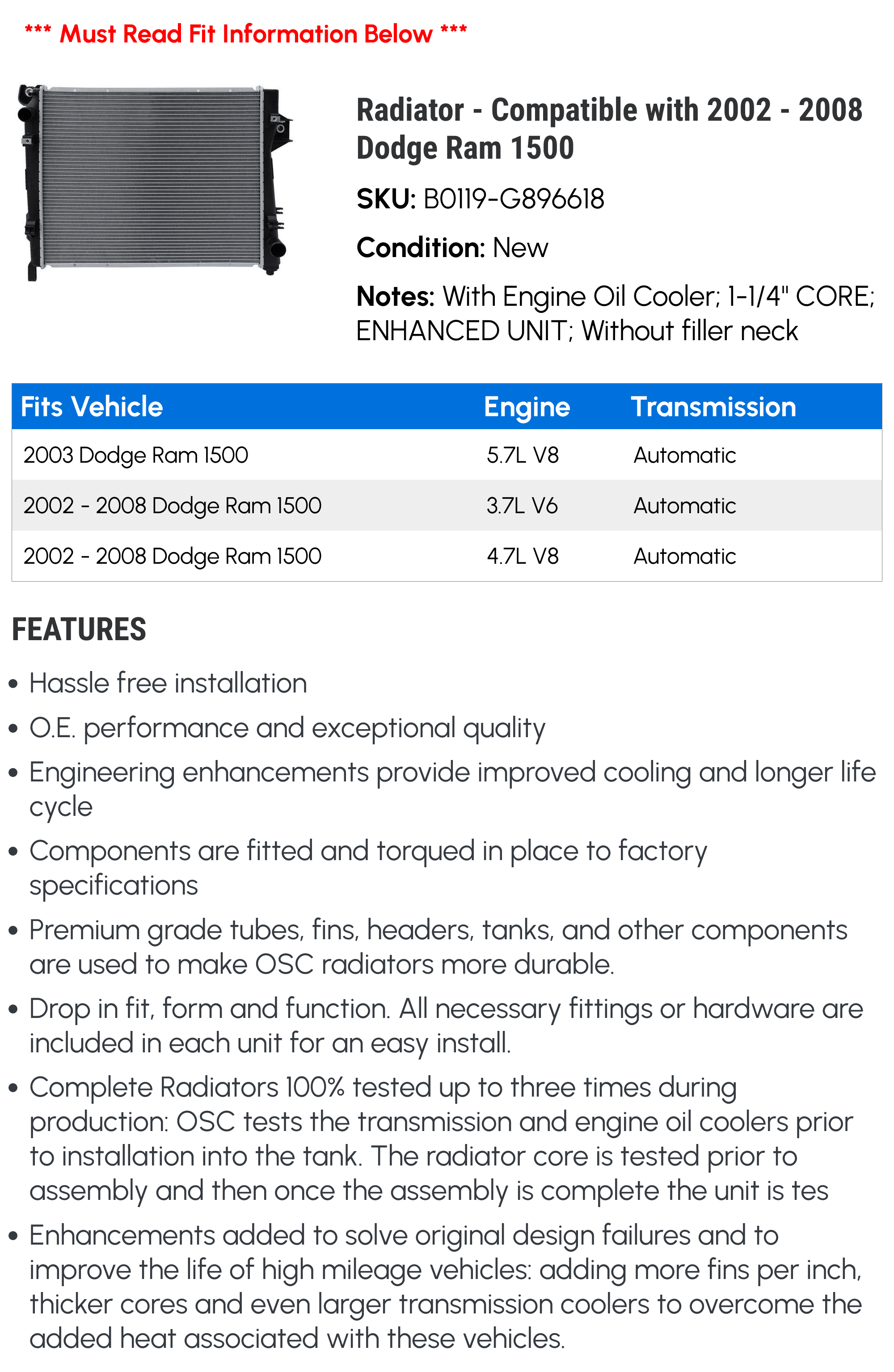 - 2002 - 2008 Dodge Ram 1500 3.7L V6 Automatic