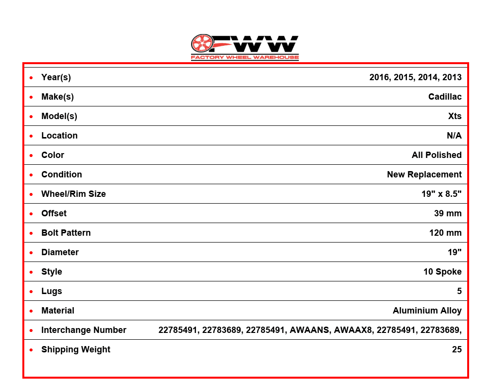 This new replacement Aluminium Alloy 10 SPOKE wheel is a match for your 2016, 2015, 2014, 2013 CADILLAC XTS. The OEM part number(s) for the rim are 22783689, 560-04775. This is a 5 lug wheel with a 19 inch diameter, width of 8.5 inch and an offset of 39 mm. The finish on the wheel is ALL POLISHED.