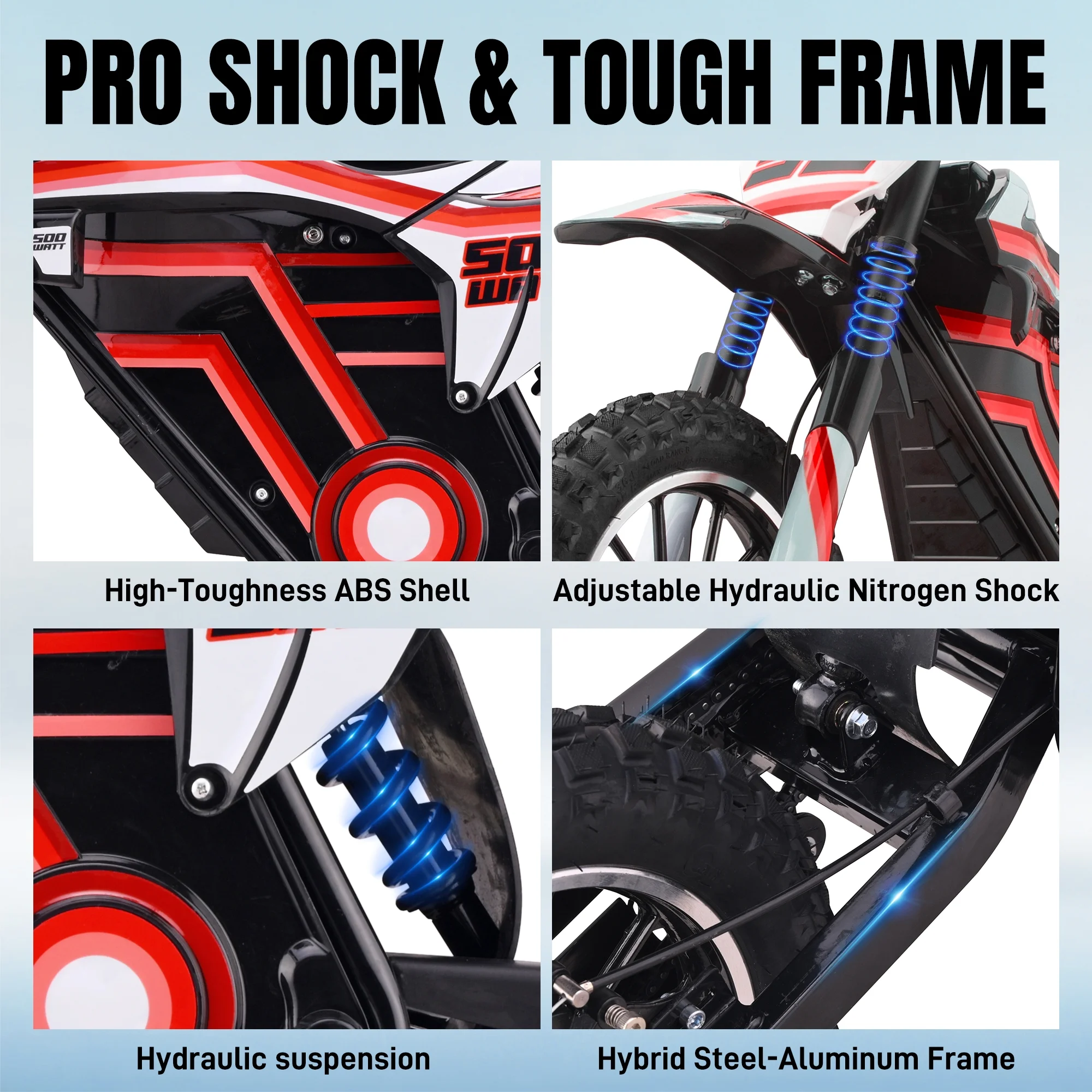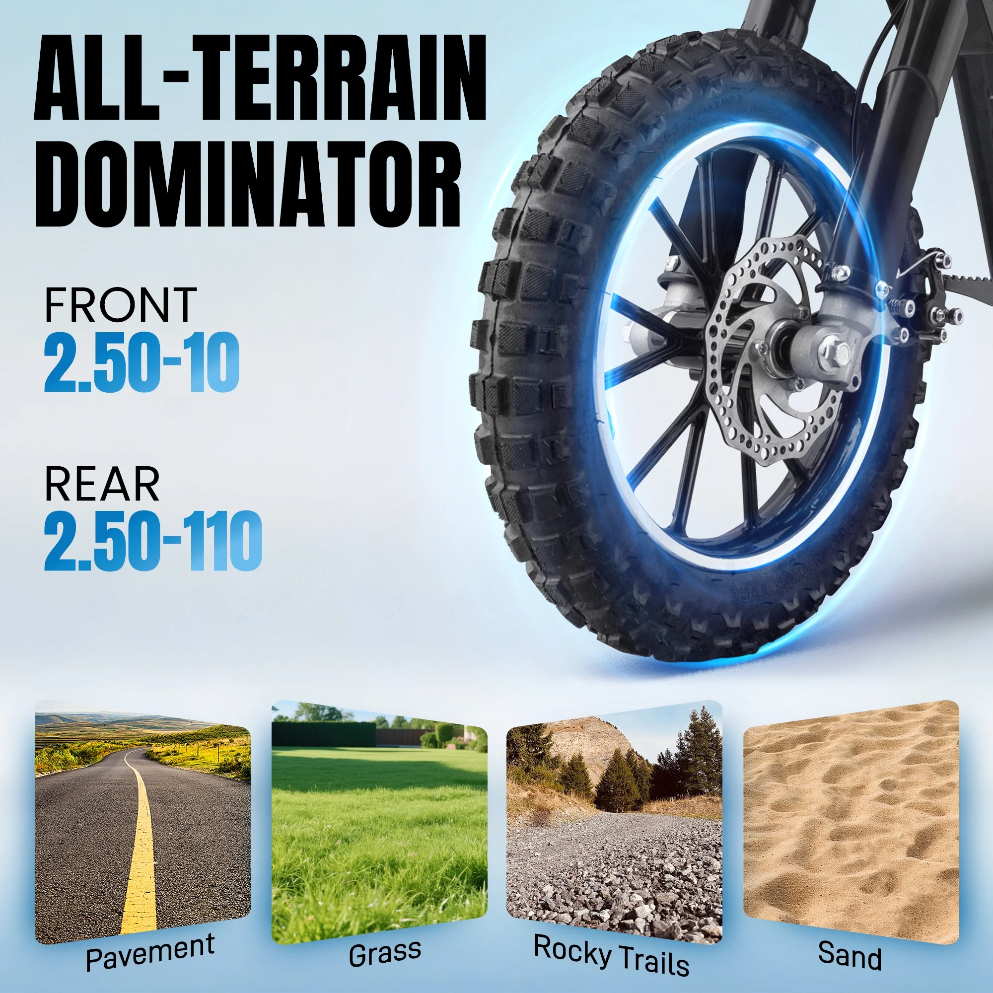 - ��All-Terrain Adaptability and Hydraulic Suspension System��Equipped with a front spring fork and rear hydraulic shock absorber, combined with 10-inch anti-slip tires, it easily handles a variety of surfaces, including grass and gravel, providing a smooth and comfortable ride.