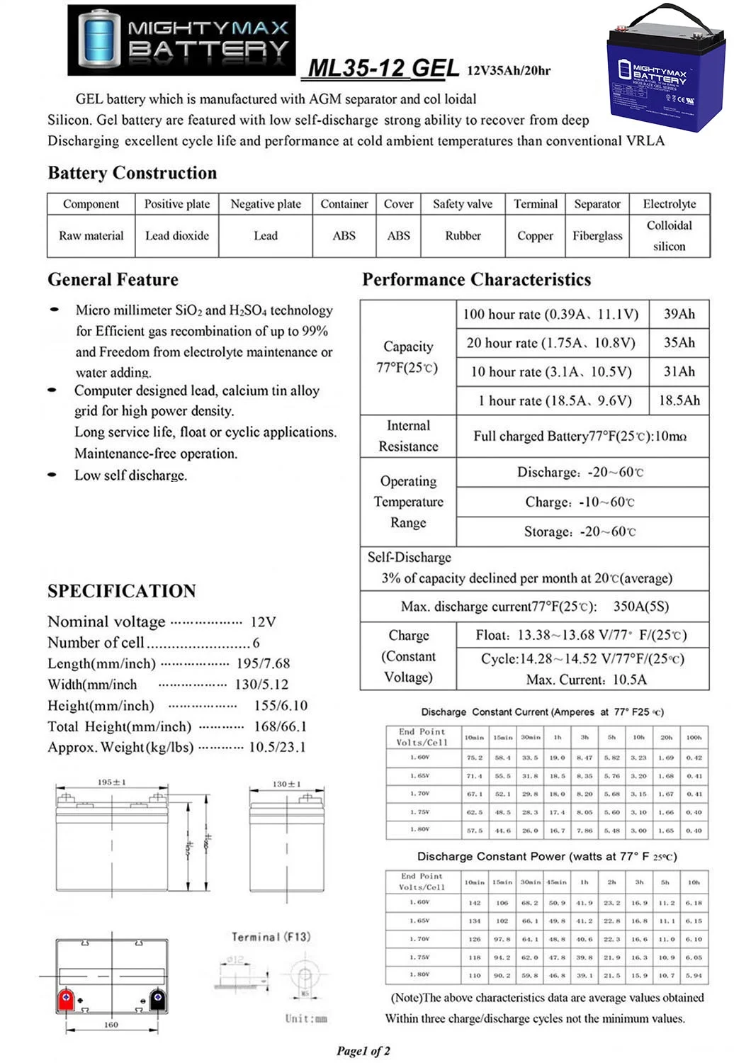- ML35-12GEL is a 12V 35AH GEL rechargeable maintenance free battery.