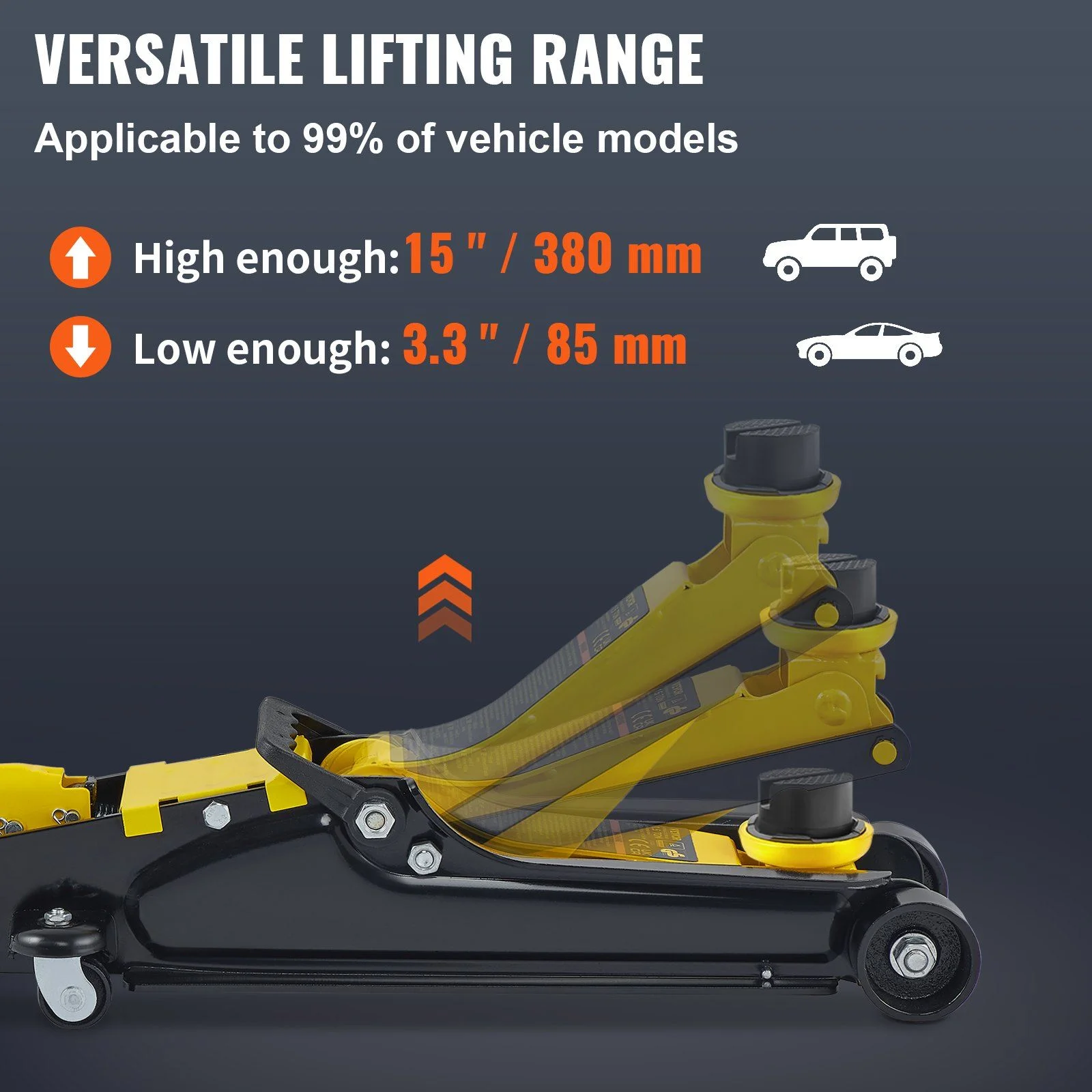 - For All Your Lifting Needs: Min. Height: 3.35"/85 mm. Max. Height: 14.96"/380 mm. The wide lifting range meets your lifting needs of family cars, trucks, SUVs, etc. And a single piston hydraulic pump allows you to pump the jack to the desired height easily.