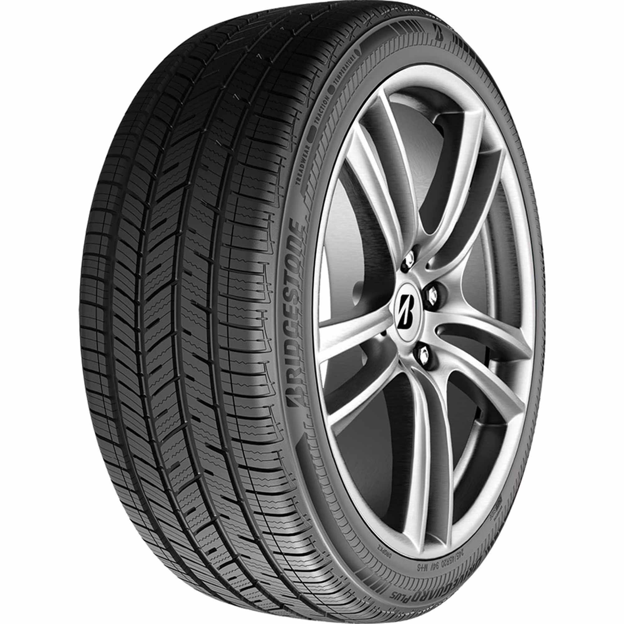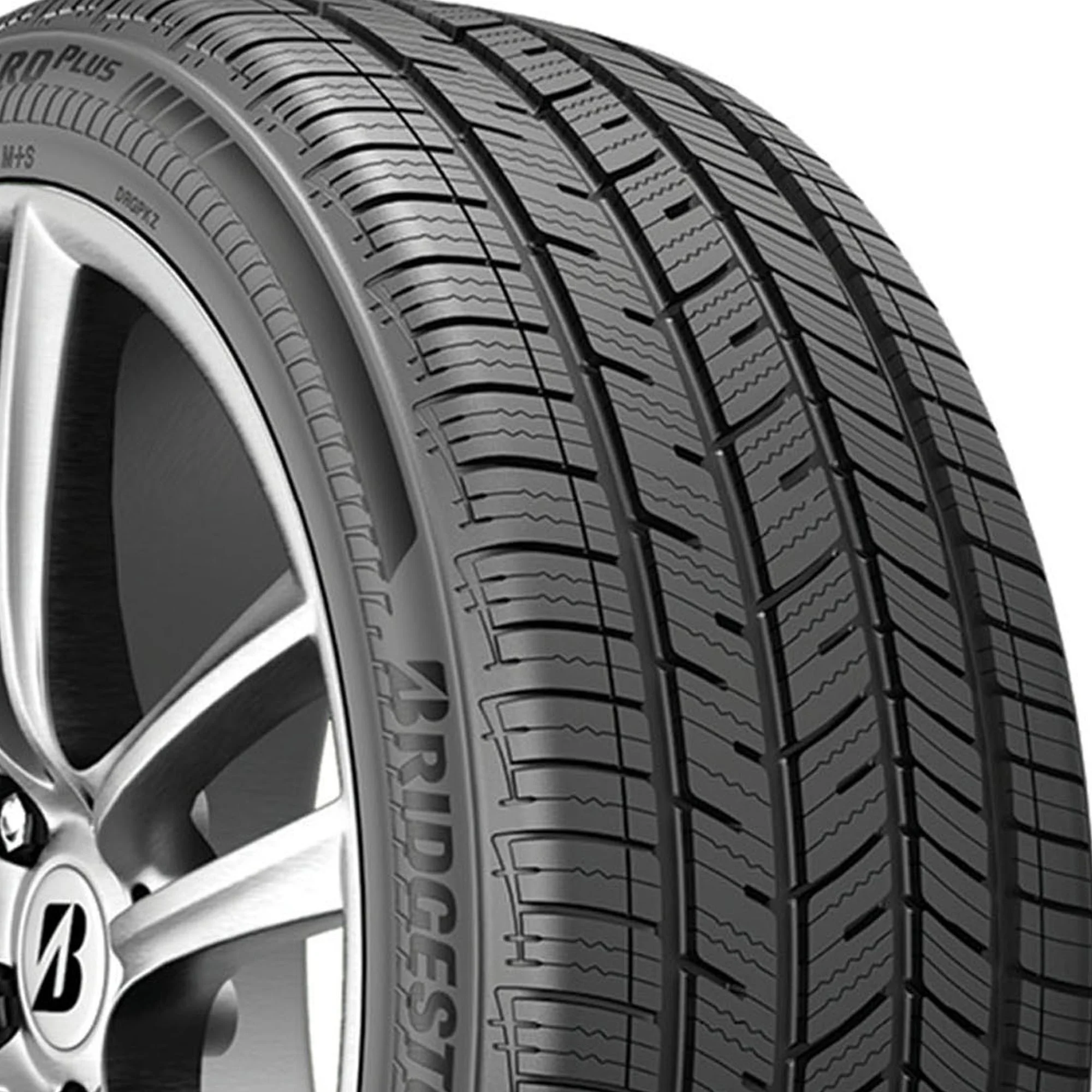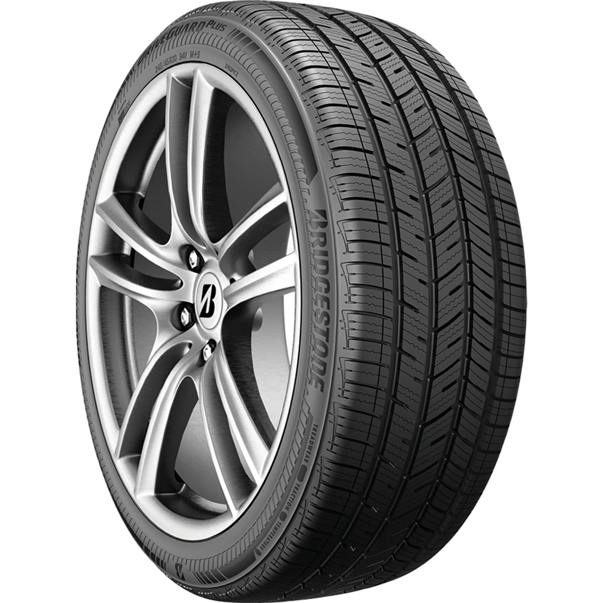 The Bridgestone DriveGuard Plus is an all-season tire for drivers of coupes, sedans, CUVs, SUVs, and minivans. Backed by a 65,000 mile limited manufacturer tread life warranty, the DriveGuard Plus features Bridgestone's DriveGuard technology that allows drivers to go up to 50 miles at speeds less than 50 MPH after a puncture or pressure loss. An asymmetric tread pattern enhances handling performance while also reducing road noises and vibrations for a quiet, comfortable ride, and the DriveGuard Plus utilizes open shoulders and wide grooves that drain water from the tread to reduce the risk of hydroplaning on wet roads.