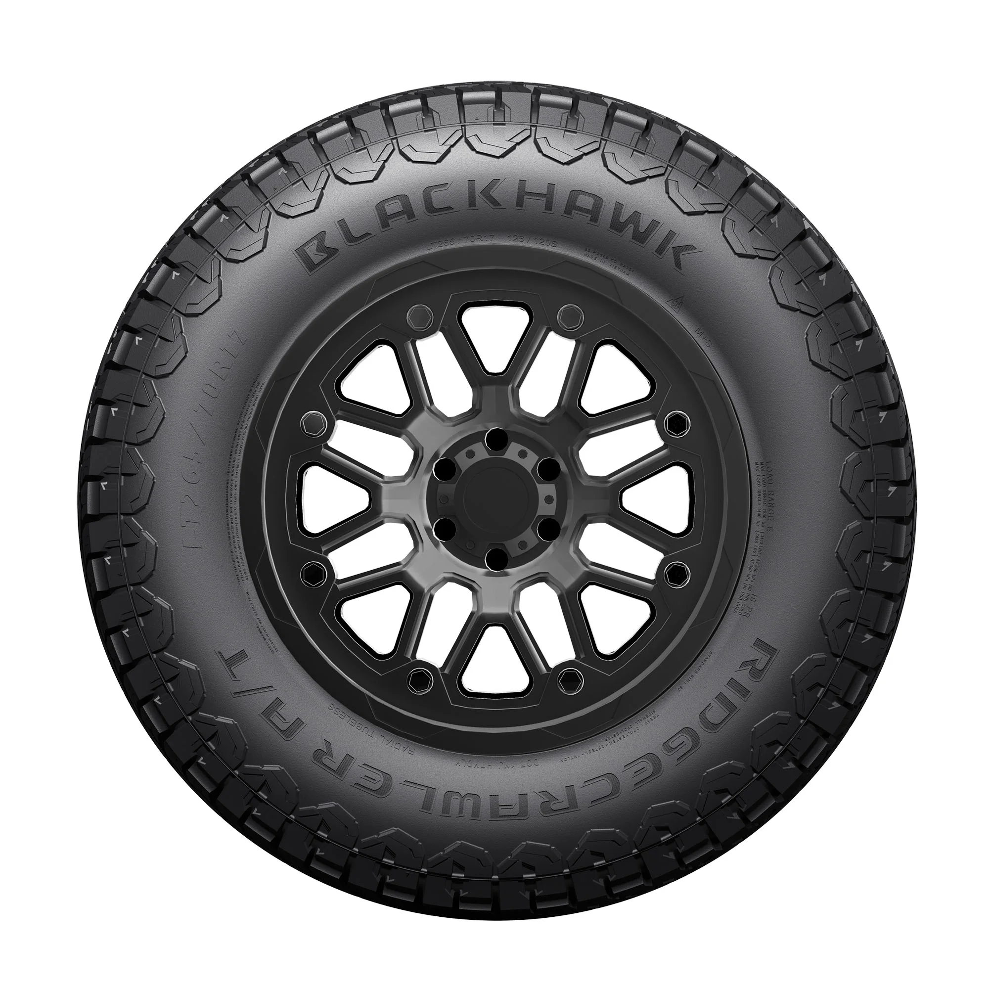 The BlackHawk Ridgecrawler A/T is a rugged and versatile all-terrain tire engineered for reliable performance across diverse conditions. Its aggressive deep lugs and staggered shoulder blocks provide exceptional grip, earning it the Three Peak Mountain Snowflake rating for severe winter service. With a wide footprint and reinforced shoulders, the Ridgecrawler A/T delivers stability, while its tread pitch, optimized through Finite Element Analysis, ensures a quieter ride. Backed by a 50,000 mile limited manufacturer tread life warranty, this tire offers durability and comfort for both on-road and off-road adventures.