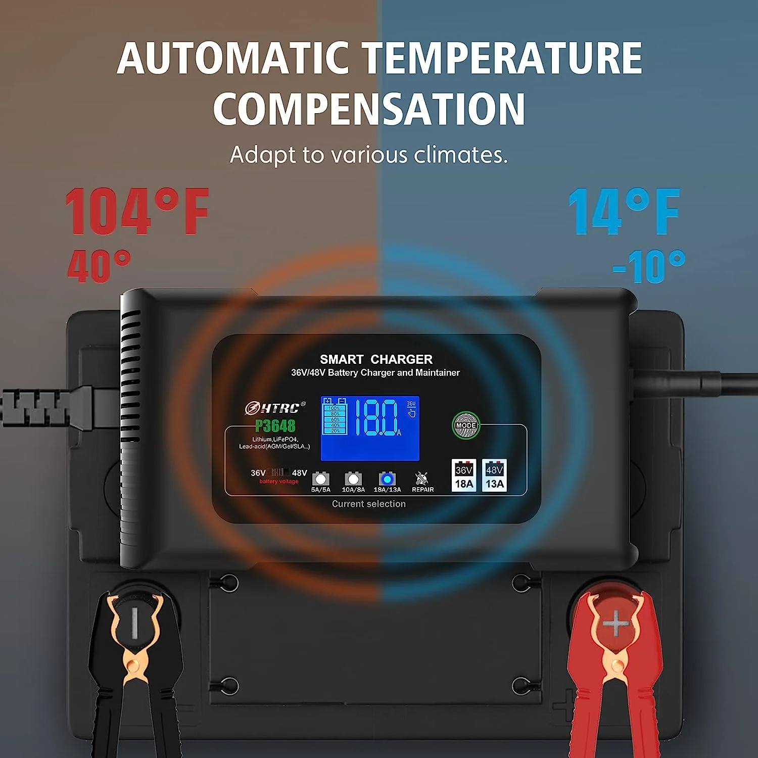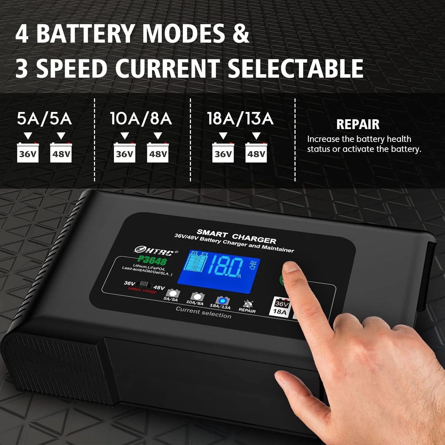 ?? [Automatic charging]Switch to choose 36V and 48V batteries,CPU monitors the charging process intelligently. When fully charged, it automatically enters trickle charging, detects sulfate layer and acid layer, and adopts the latest pulse repair function to restore lost performance and extend battery life. Optional charging current. When the battery is seriously low, the maximum charging current can be adjusted intelligently up to18 amps.