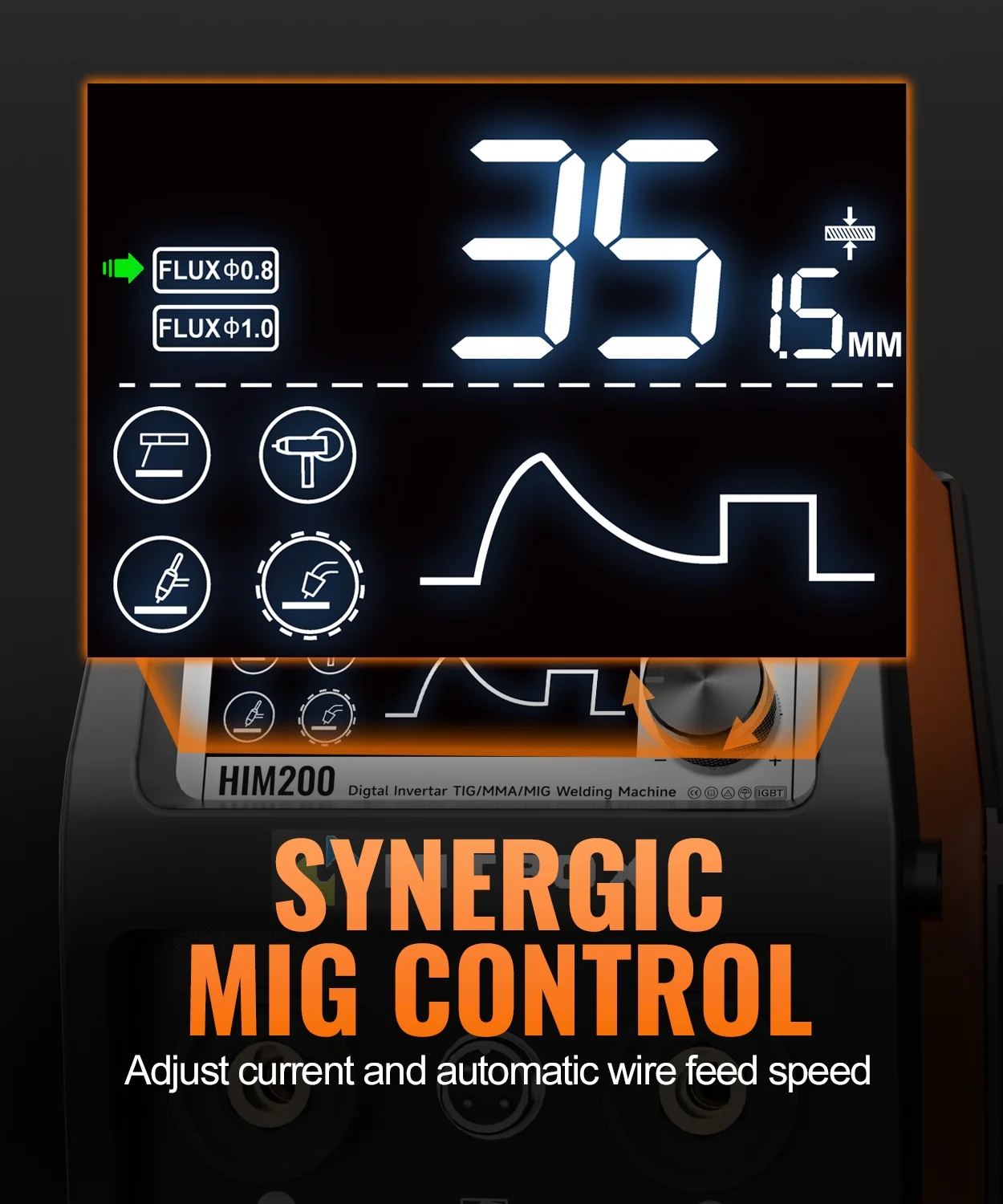 - ��Switchable Digital LCD screen��HIM200 Mig Welder has a exclusive HMI-designed display screen. When selecting the corresponding welding mode will switch the corresponding welding screen display and provide you with accurate welding data as a reference value. You can check and adjust the current, wire feed speed and arc starting parameters at any time.