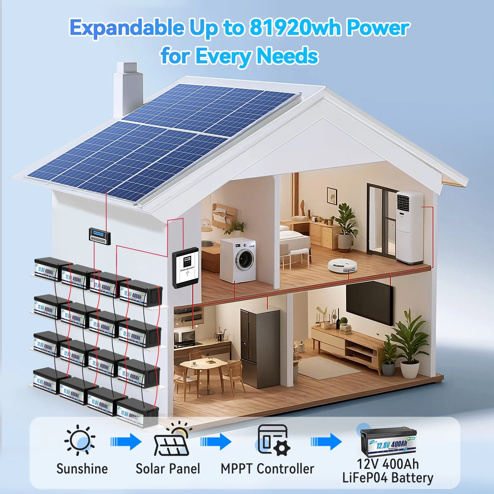 - Our 400ah lifepo4 battery Can Connect 4 units via 4P2S configuration for 51.2V 400Ah (20.48kWh) capacity, supporting 48V solar inverters and whole-home backup. Low self-discharge ensures readiness for seasonal use.
