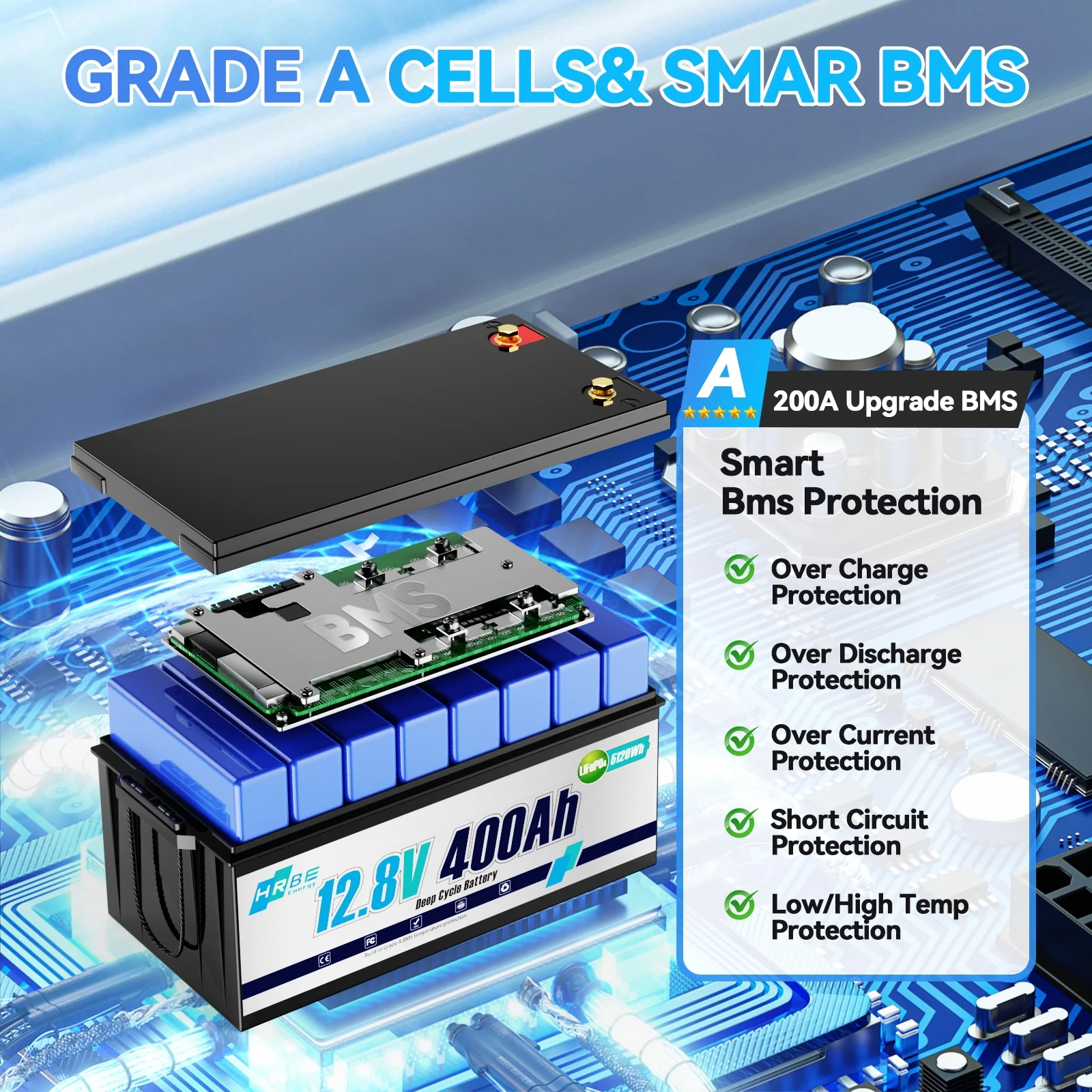 - This 12V 400Ah LiFePO4 battery has built-in 250A BMS (Battery Management System) to protect it from overcharge, over-discharge, over-current (250A), over temp (167 ��F) and short circuit. Without memory effect, no matter what state the battery is, it can be used as soon as it is charged. A 12V 80A/40A LiFePO4 battery charger is recommended; the lithium battery will be fully charged within 5hrs/10hrs.