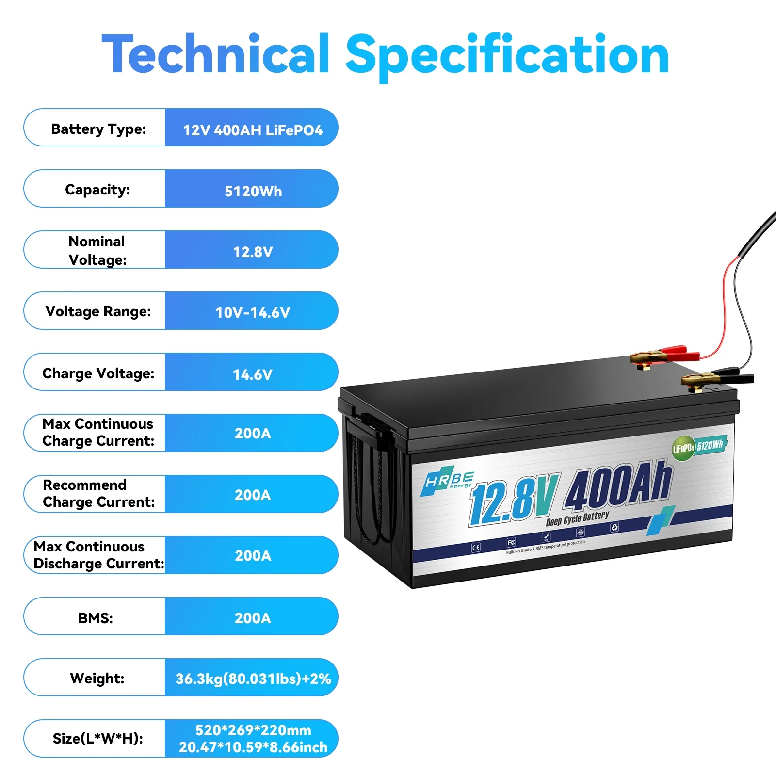 - 12.8V 400Ah Lithium iron phosphate battery features: the dimension of 12.8V 400Ah battery is: L25.2*W9.65*H9.06 inch, the max continuous discharging current is 200A. the inrush current is 400A within 3-5 seconds. charging voltage we recommend for 12.8V LiFePO4 Battery is 14.6V. an 7A charger as a tester comes with the battery in free.