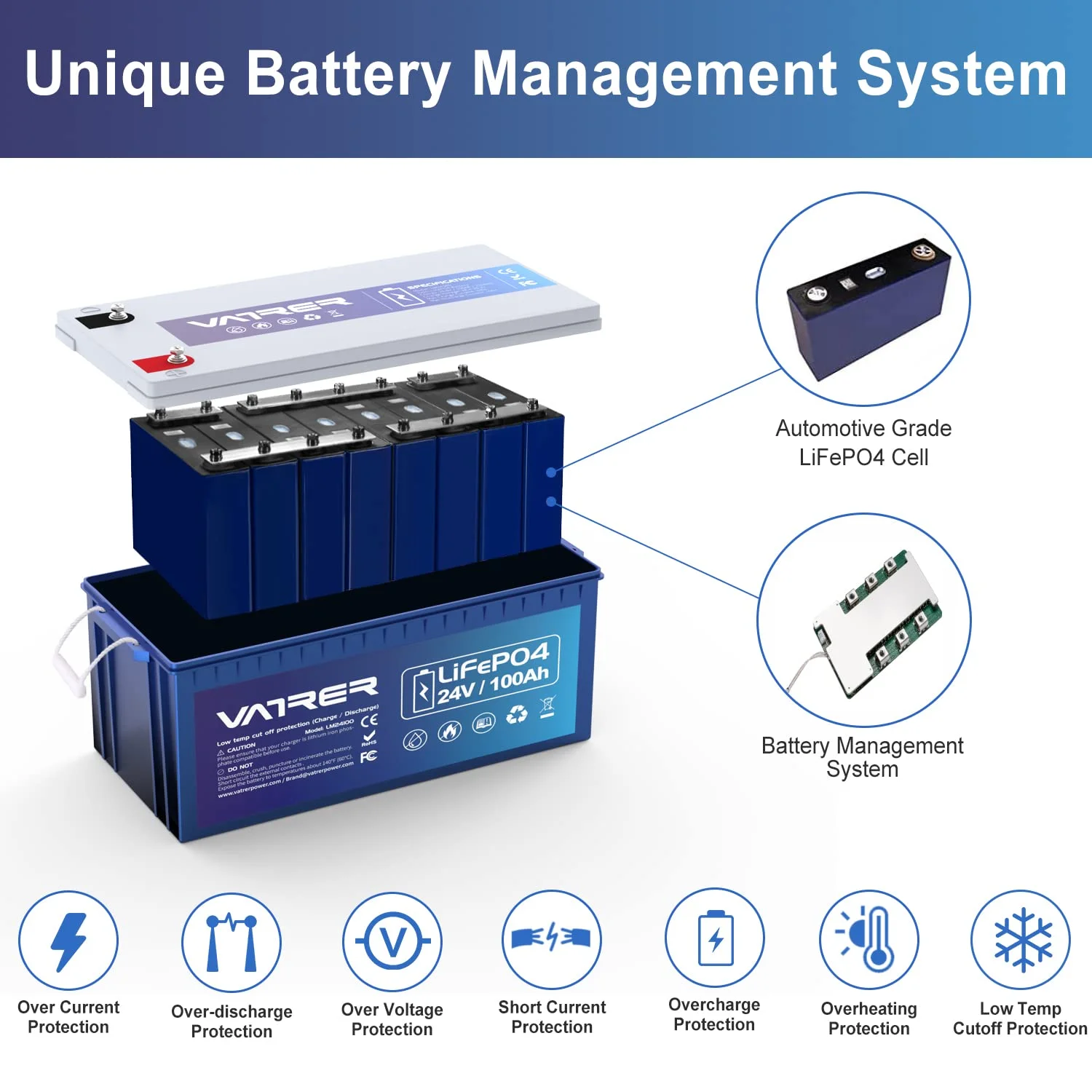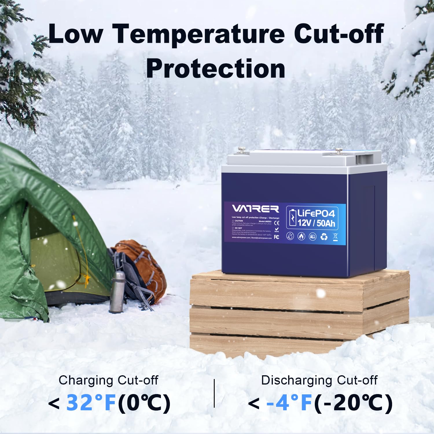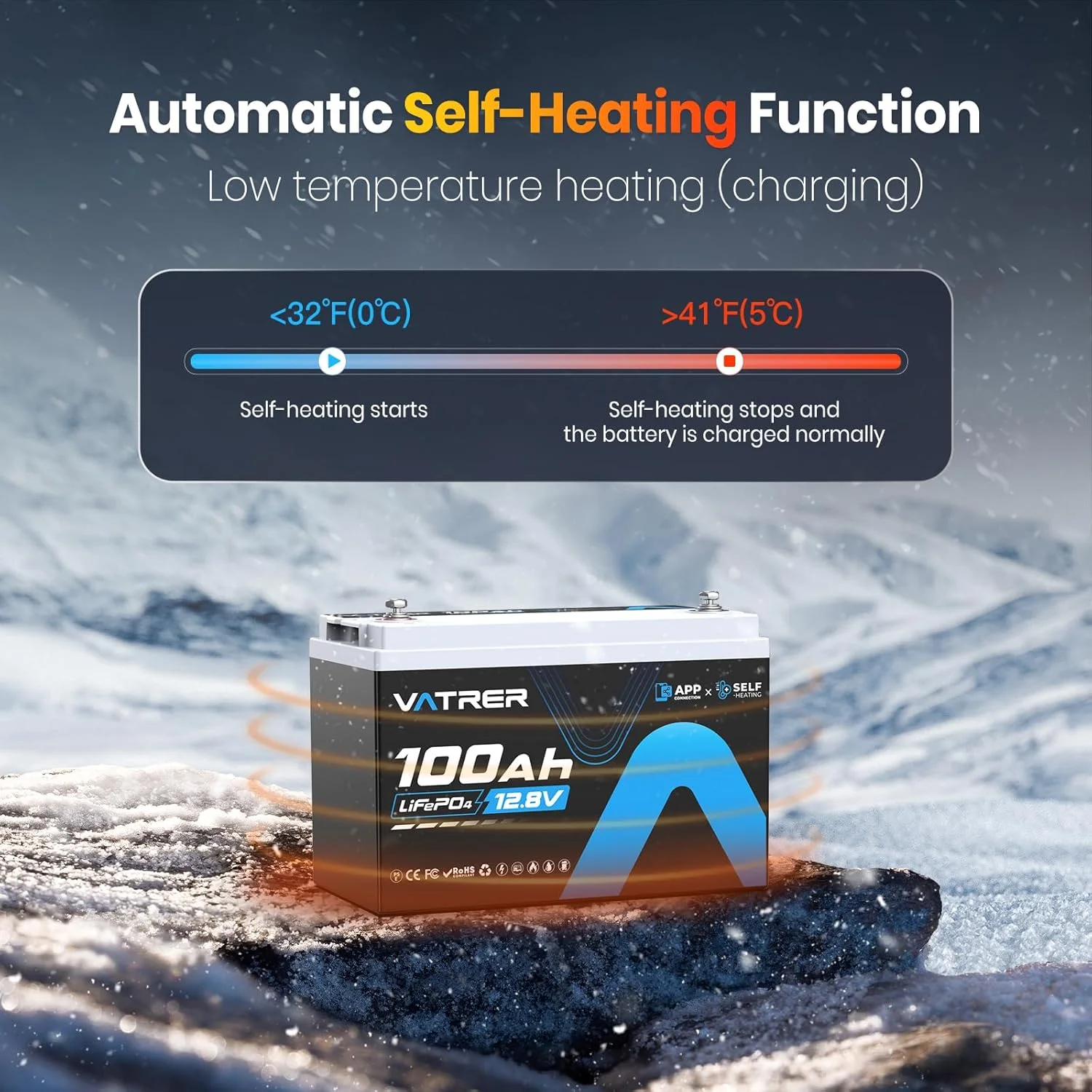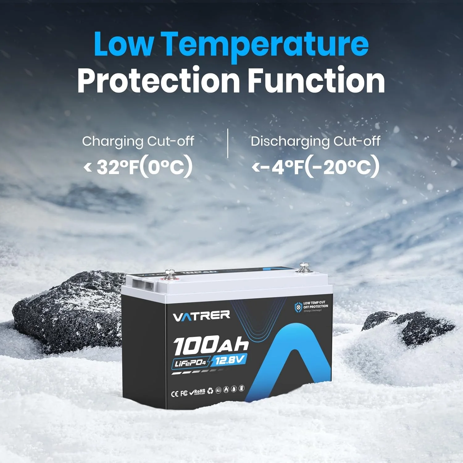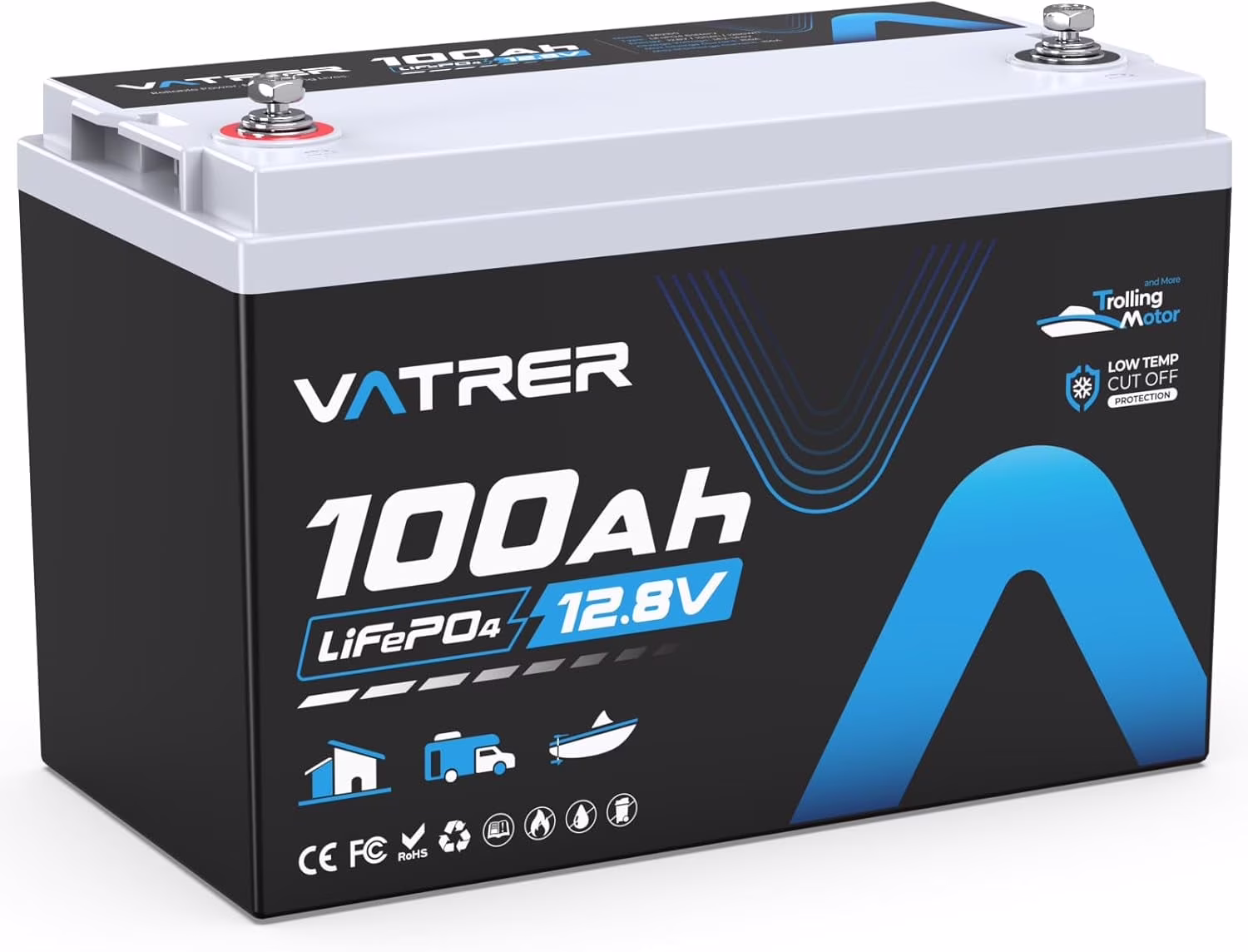 VATRER POWER 12V 100AH Low Temp Cutoff LiFePO4 Deep Cycle Battery with 1280W, Built - in 100A BMS, 5000+ Cycles Rechargeable Lithium Battery, Perfect for RV/Camper, Marine, Solar