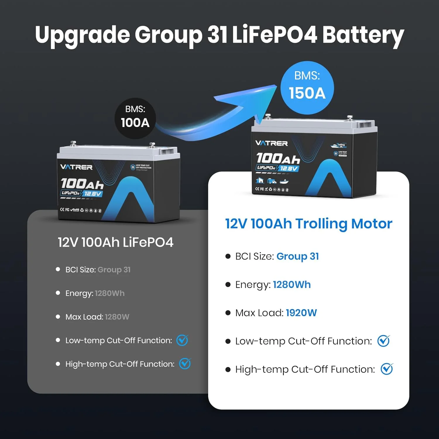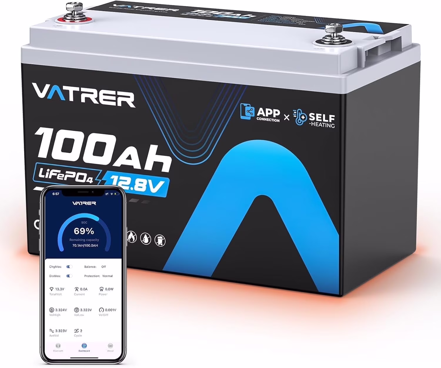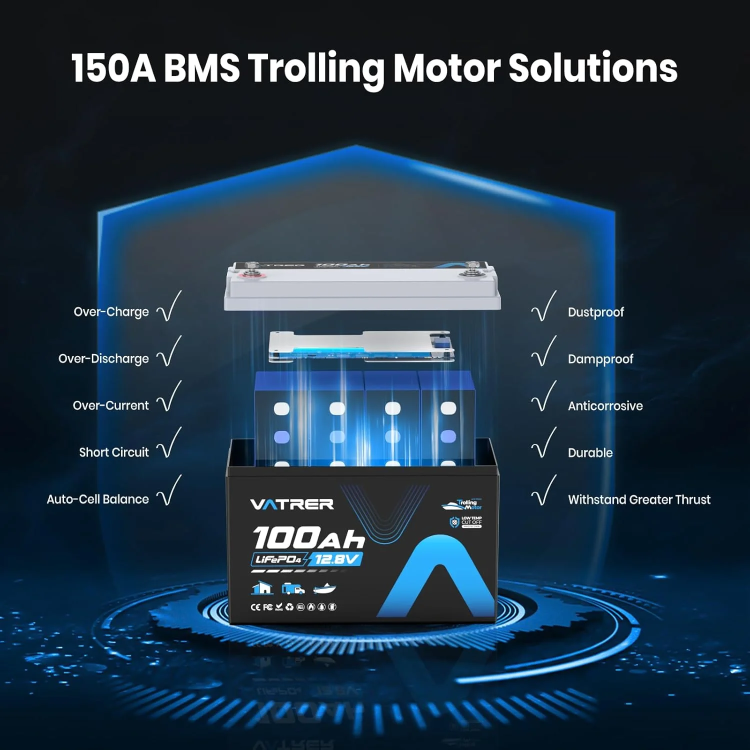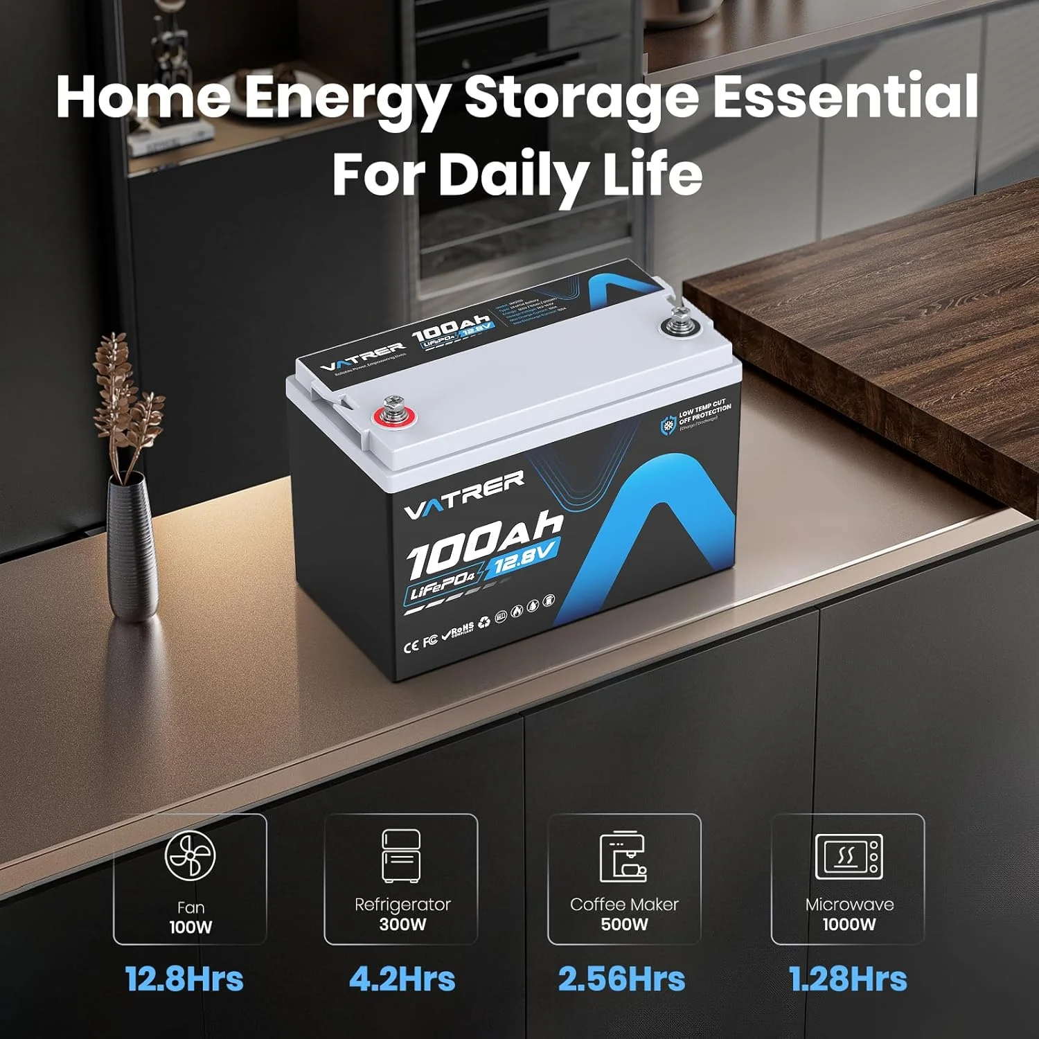 VATRER POWER 12V 100AH Low Temp Cutoff LiFePO4 Deep Cycle Battery with 1280W, Built - in 100A BMS, 5000+ Cycles Rechargeable Lithium Battery, Perfect for RV/Camper, Marine, Solar