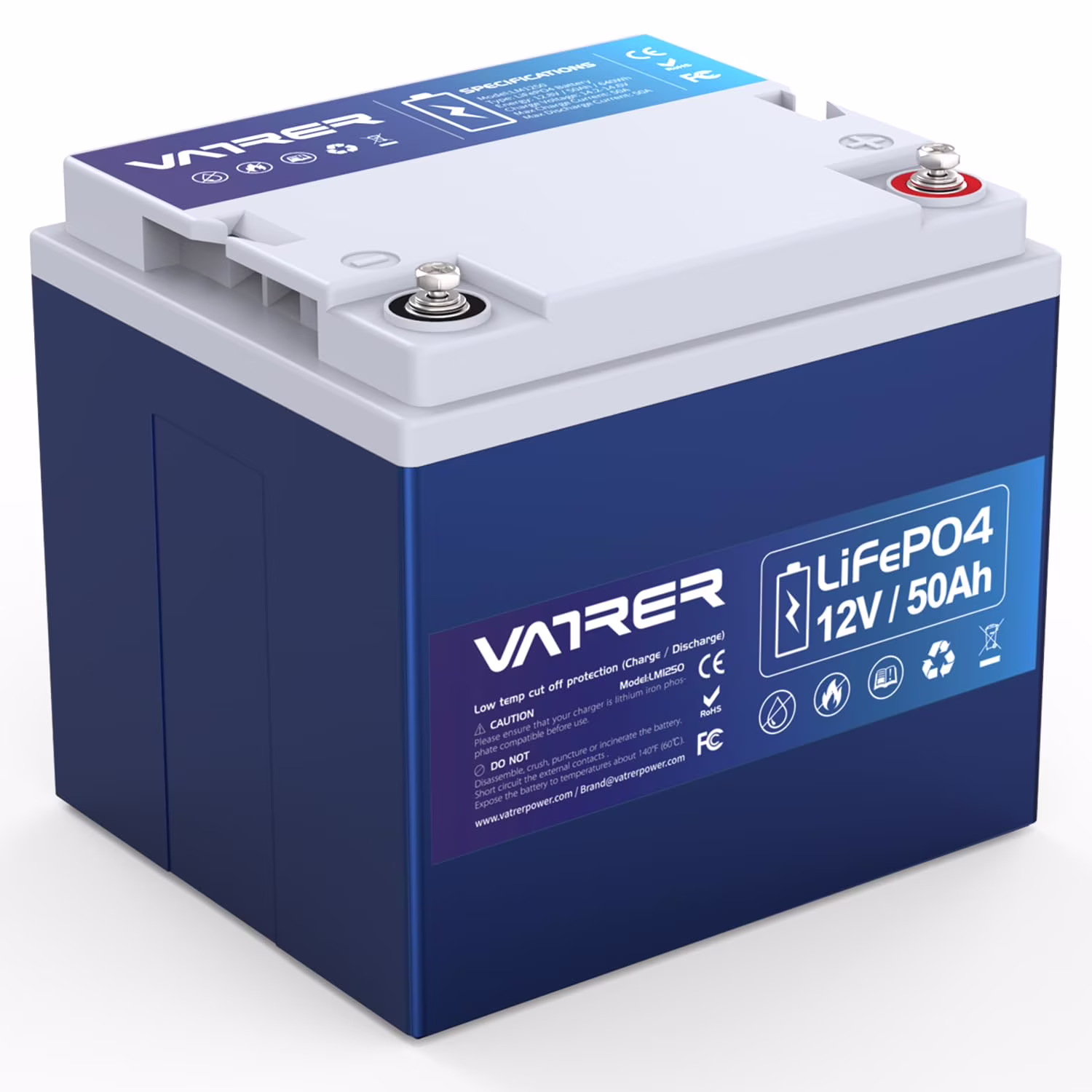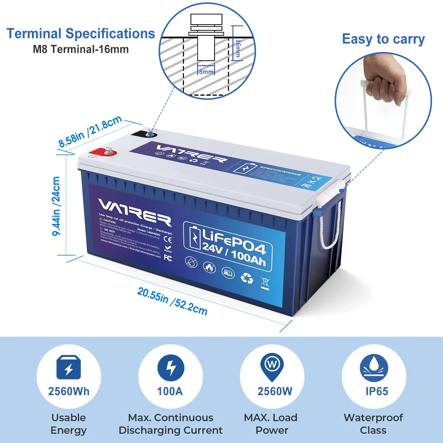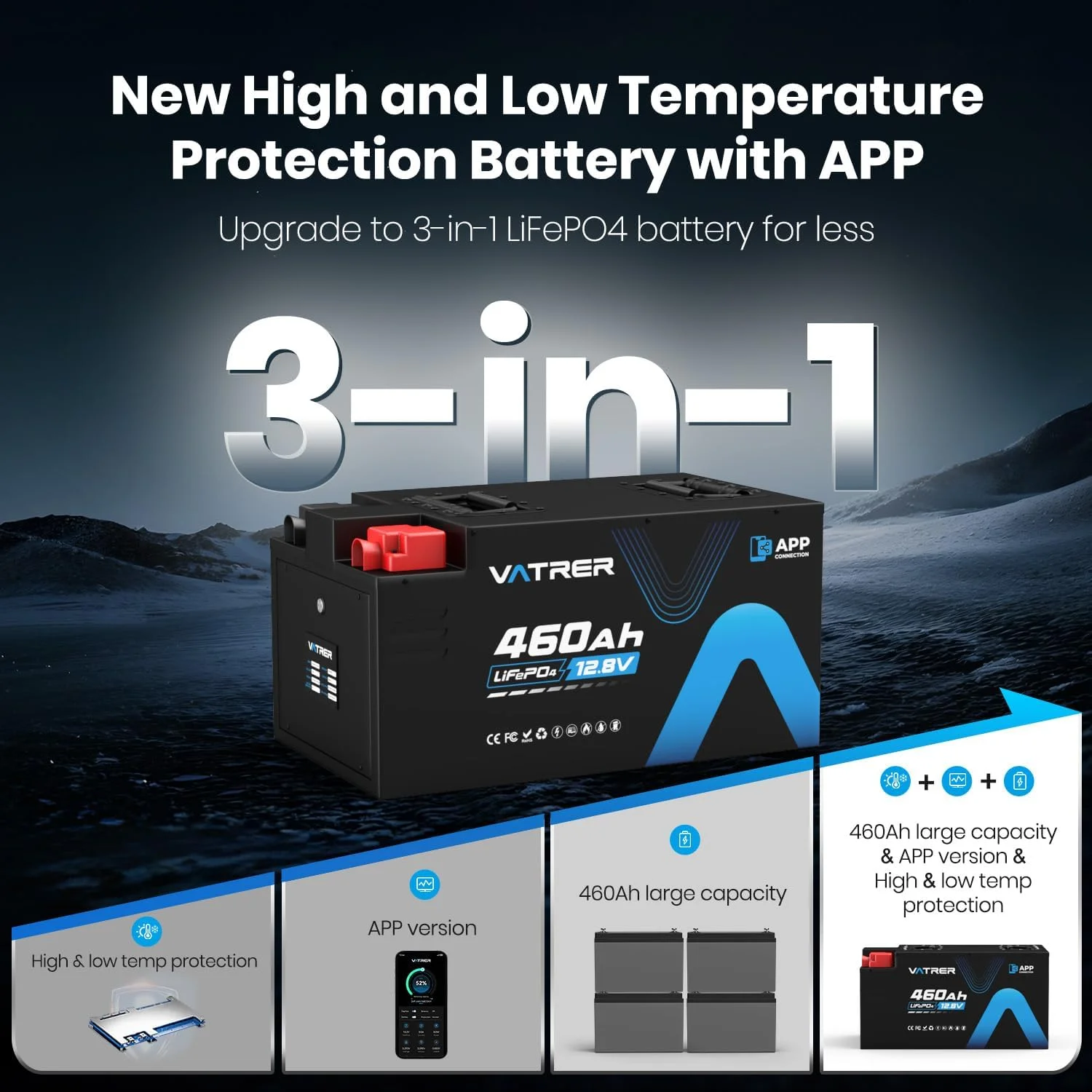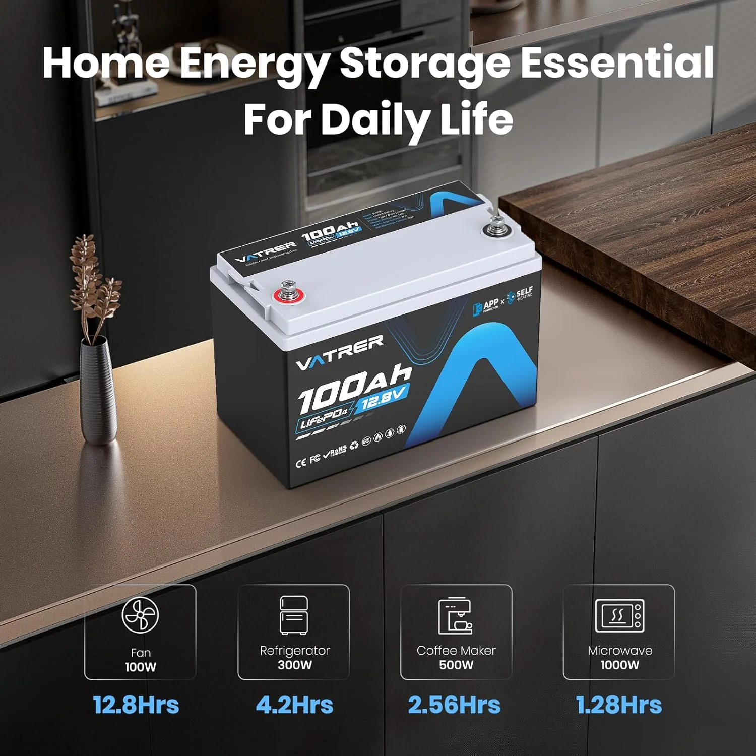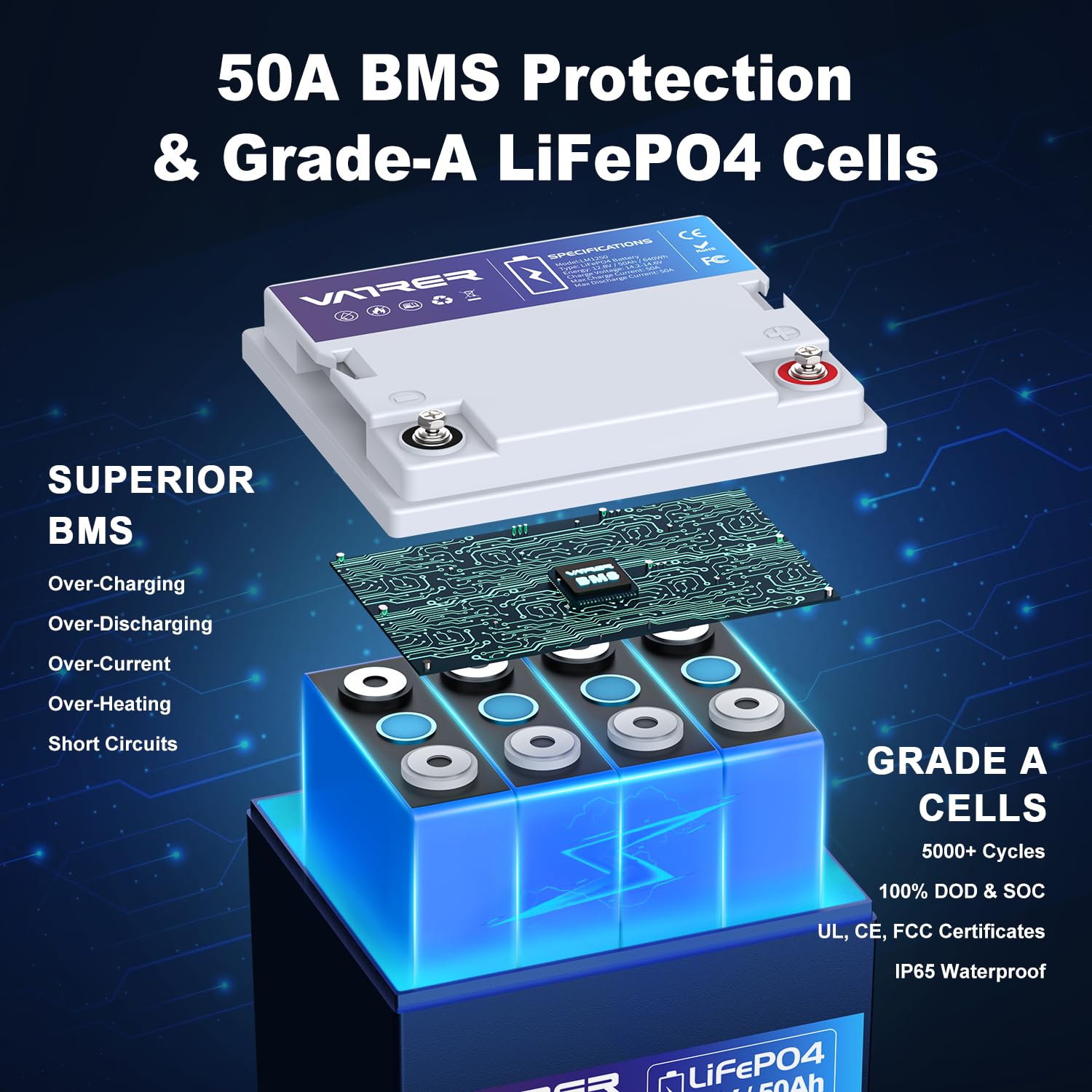 VATRER POWER 12V 100AH Low Temp Cutoff LiFePO4 Deep Cycle Battery with 1280W, Built - in 100A BMS, 5000+ Cycles Rechargeable Lithium Battery, Perfect for RV/Camper, Marine, Solar