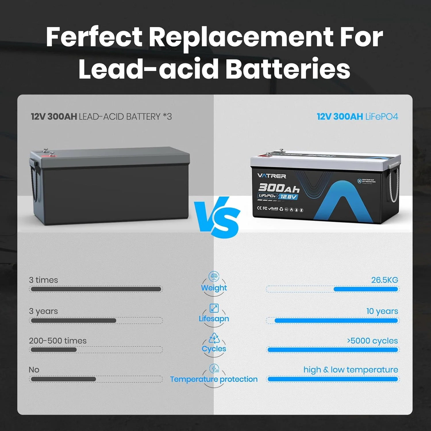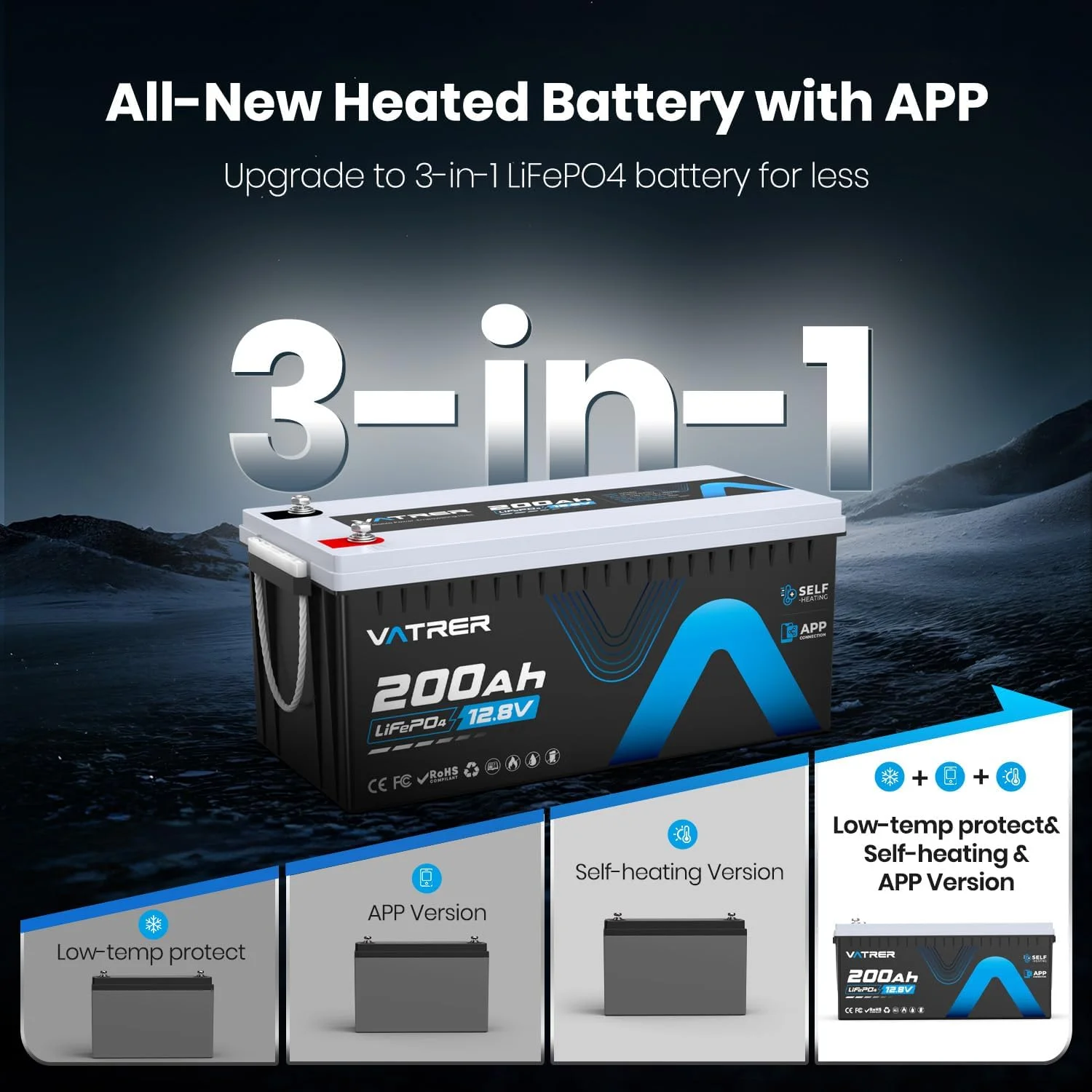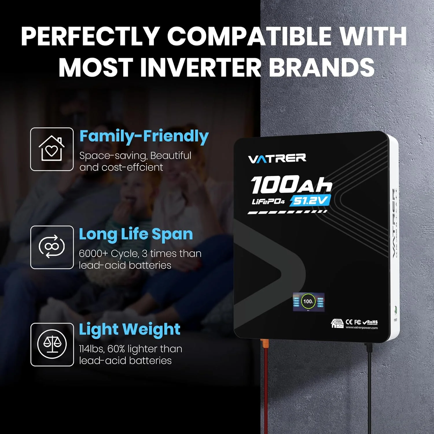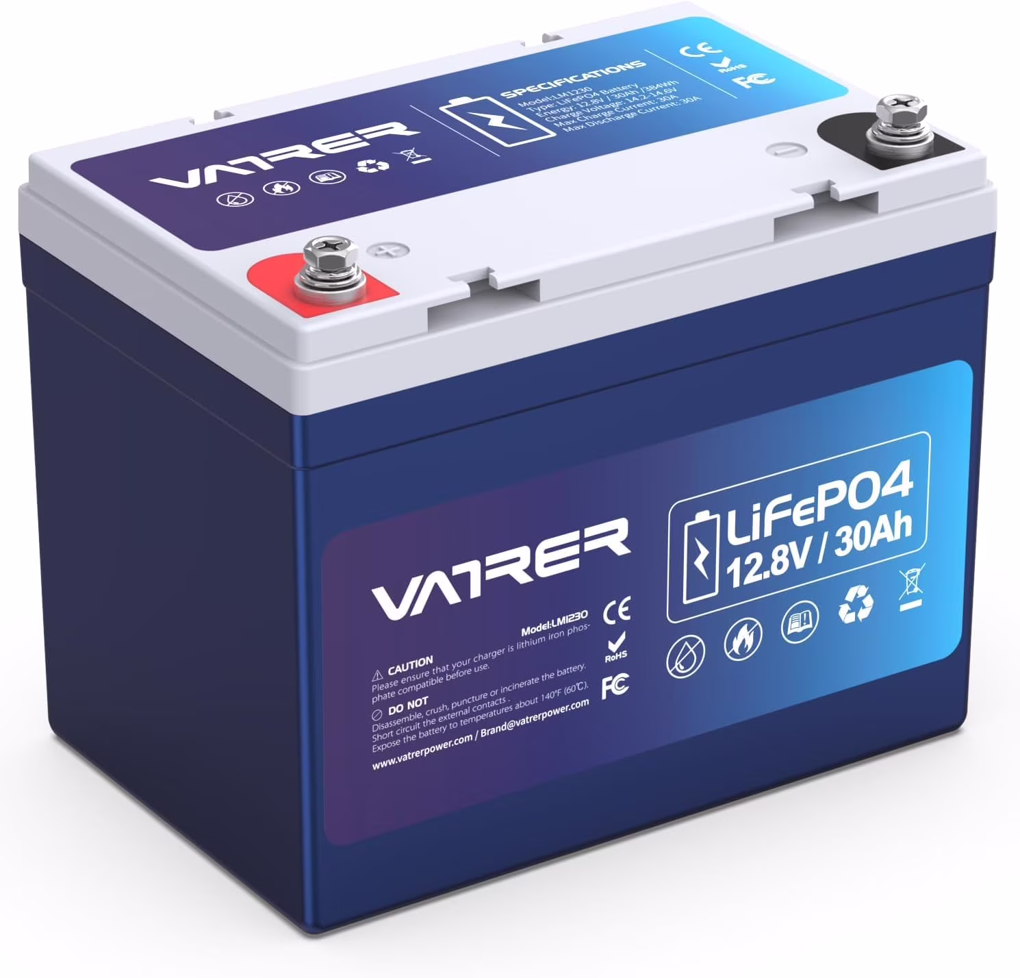 VATRER POWER 12V 100AH Low Temp Cutoff LiFePO4 Deep Cycle Battery with 1280W, Built - in 100A BMS, 5000+ Cycles Rechargeable Lithium Battery, Perfect for RV/Camper, Marine, Solar