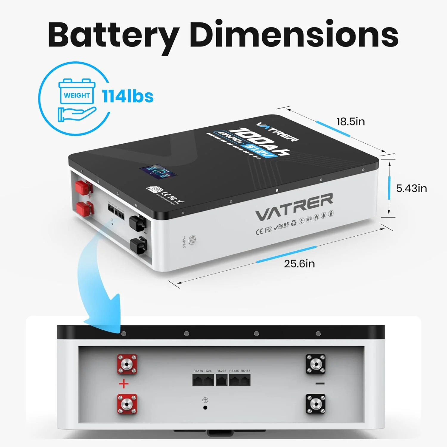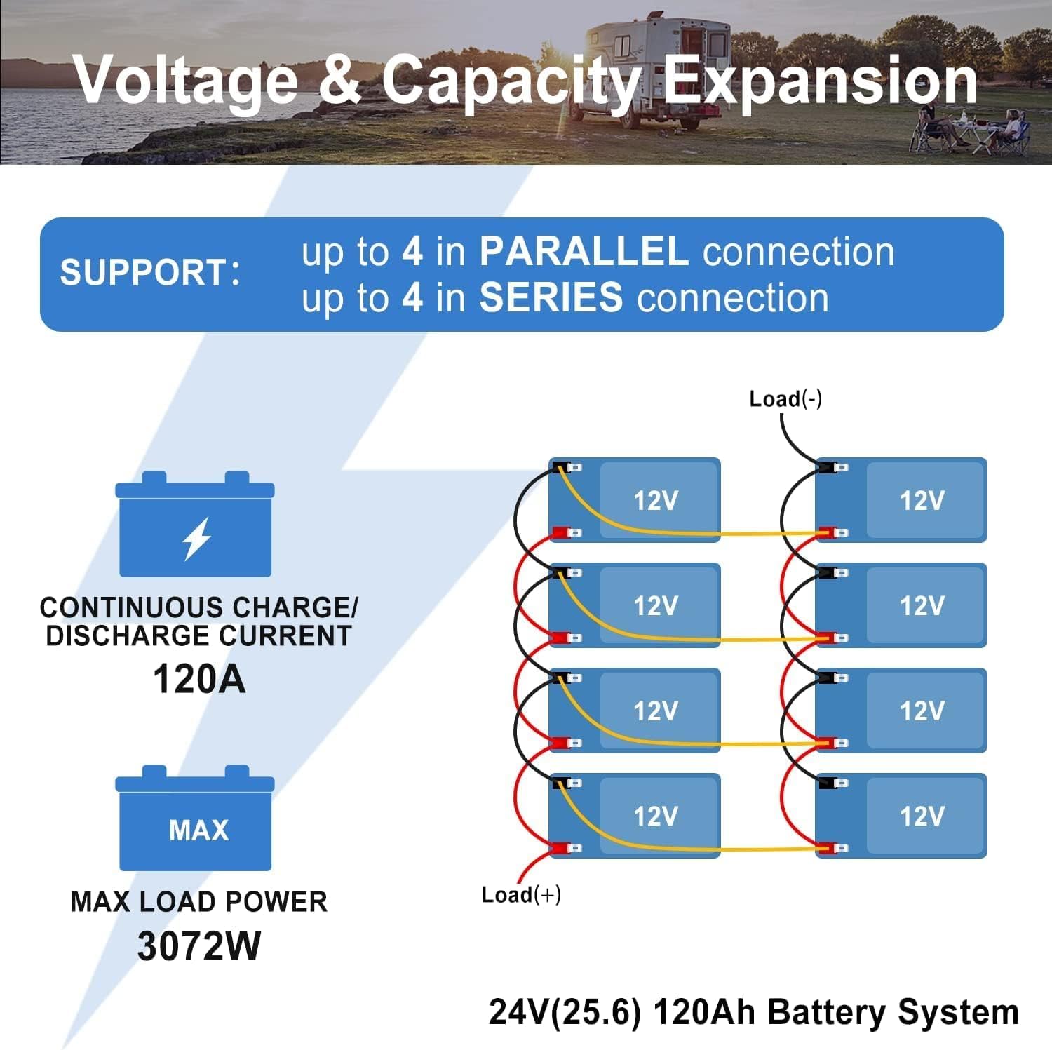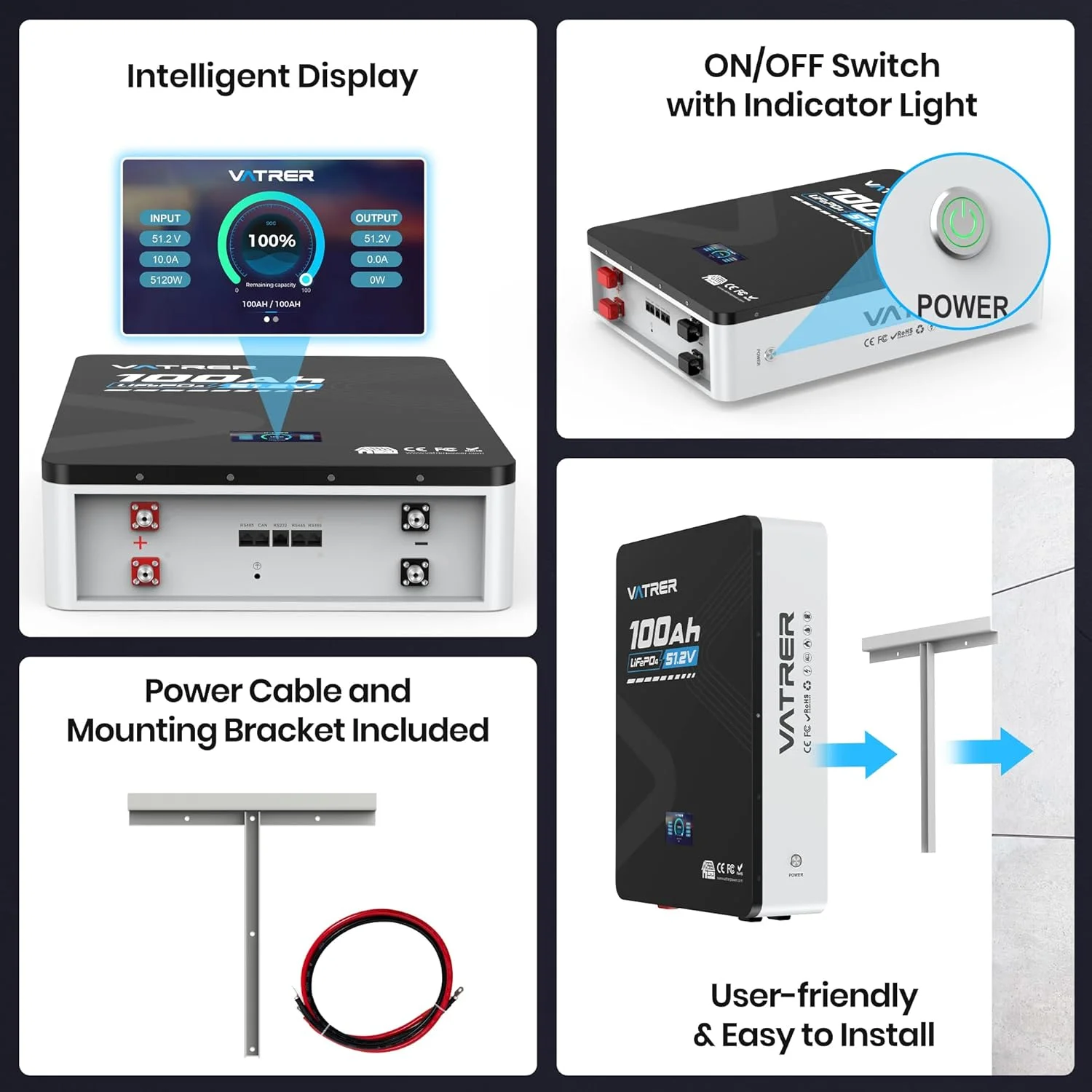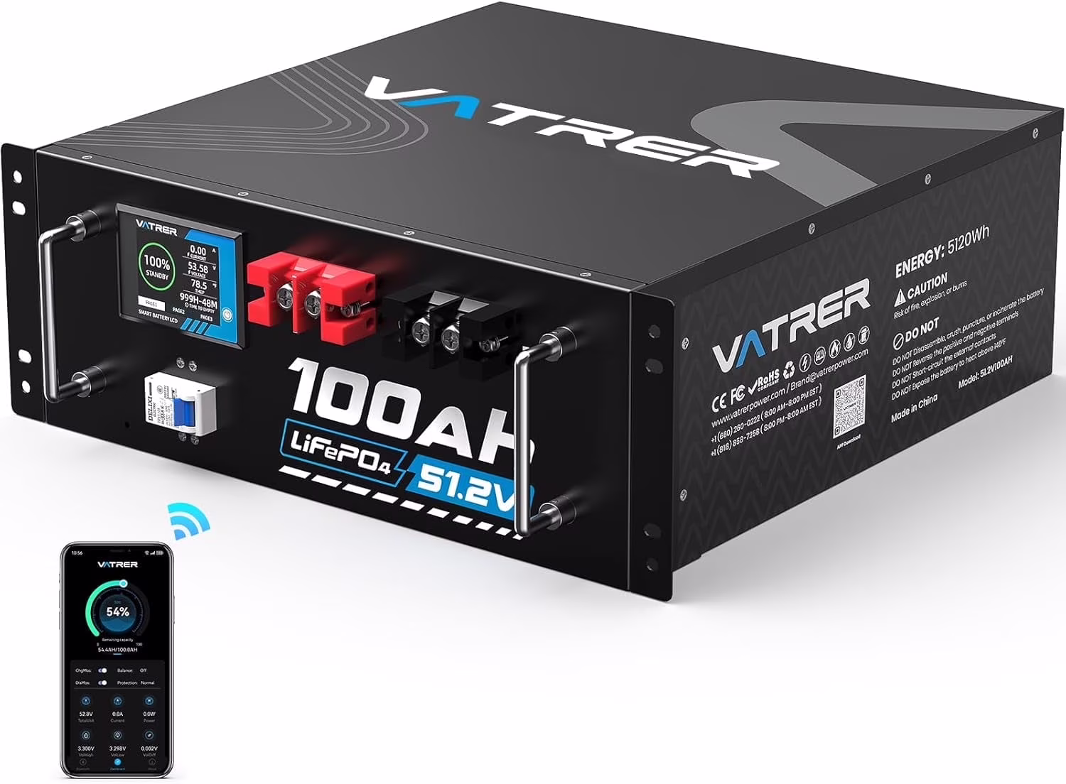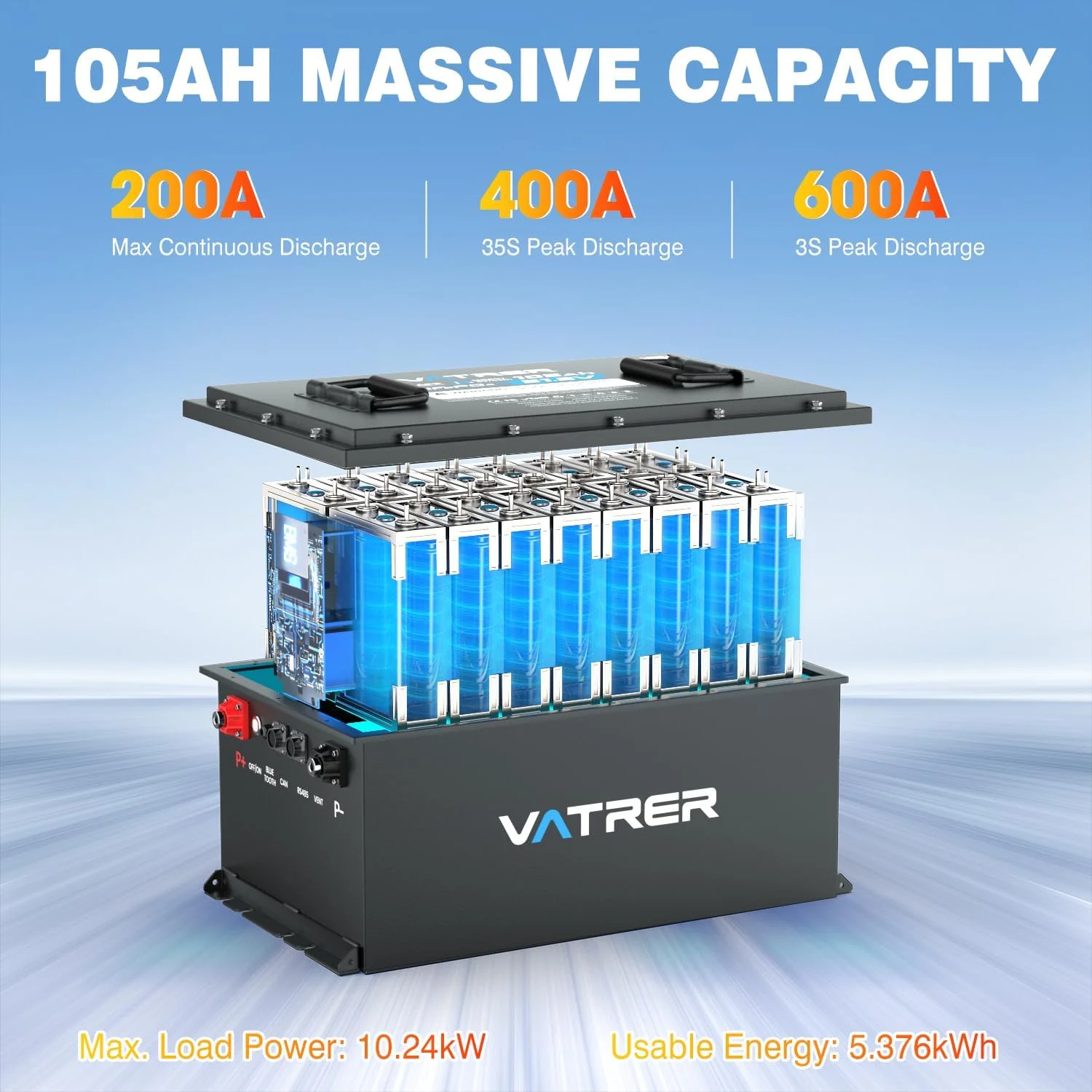 - Equipped with a built-in 100A Battery Management System (BMS) for protection against overcharge, over-discharge, over-current, and short circuits.