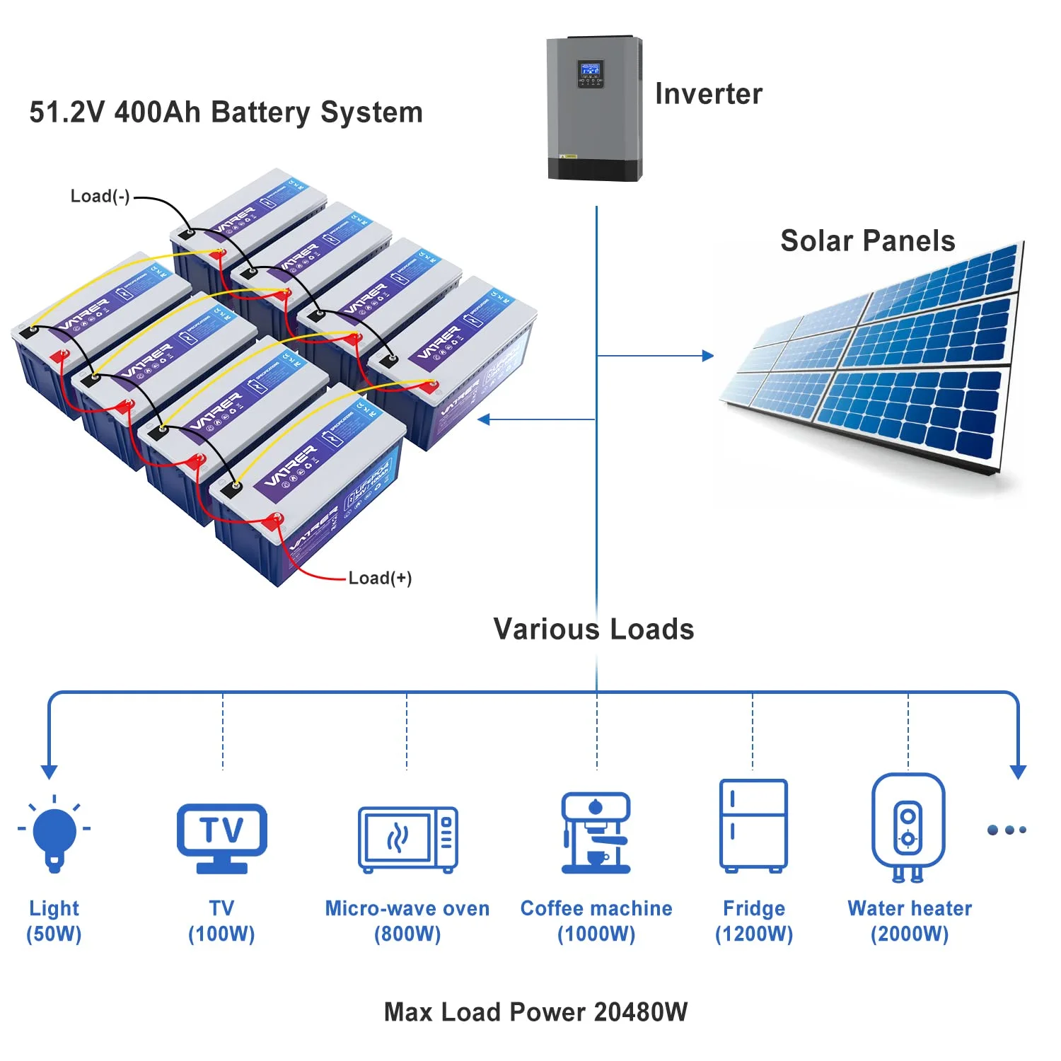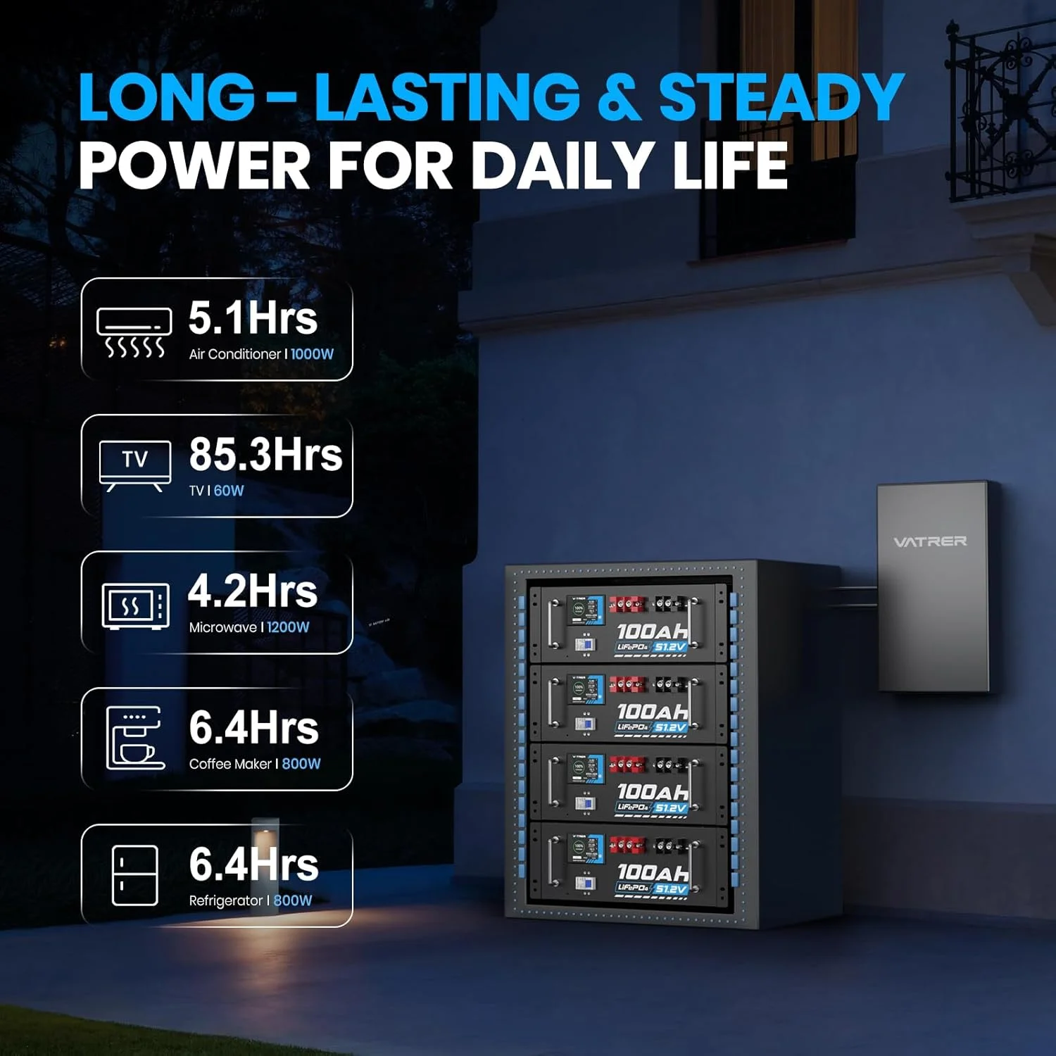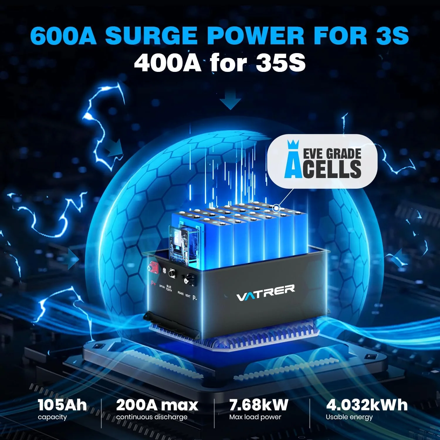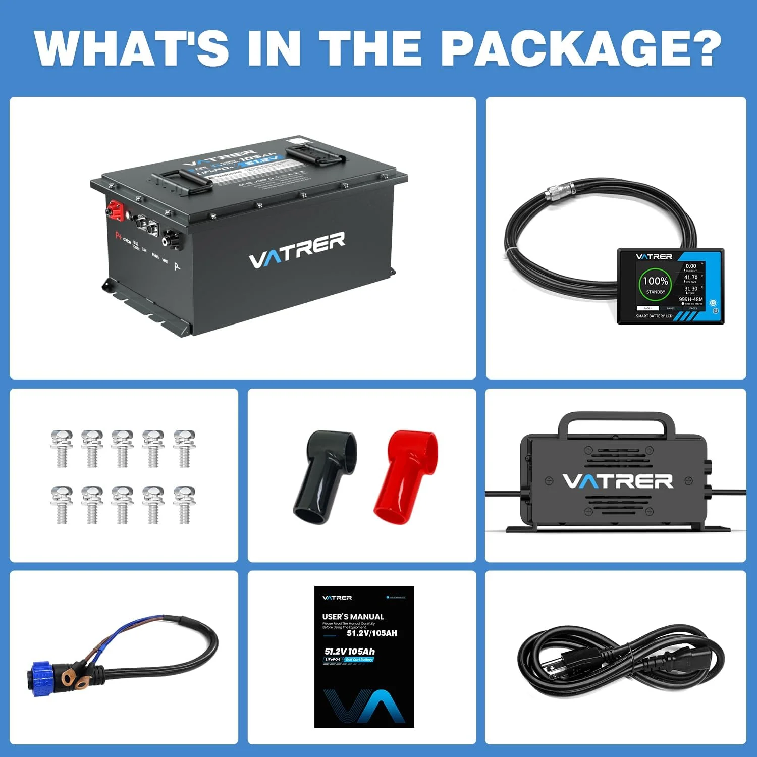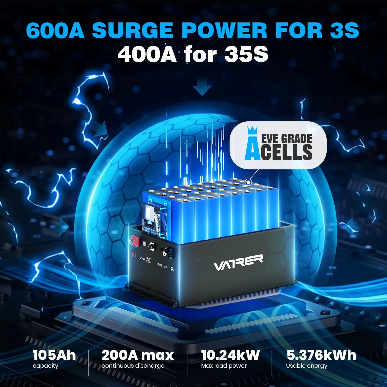 - Equipped with a built-in 100A Battery Management System (BMS) for protection against overcharge, over-discharge, over-current, and short circuits.