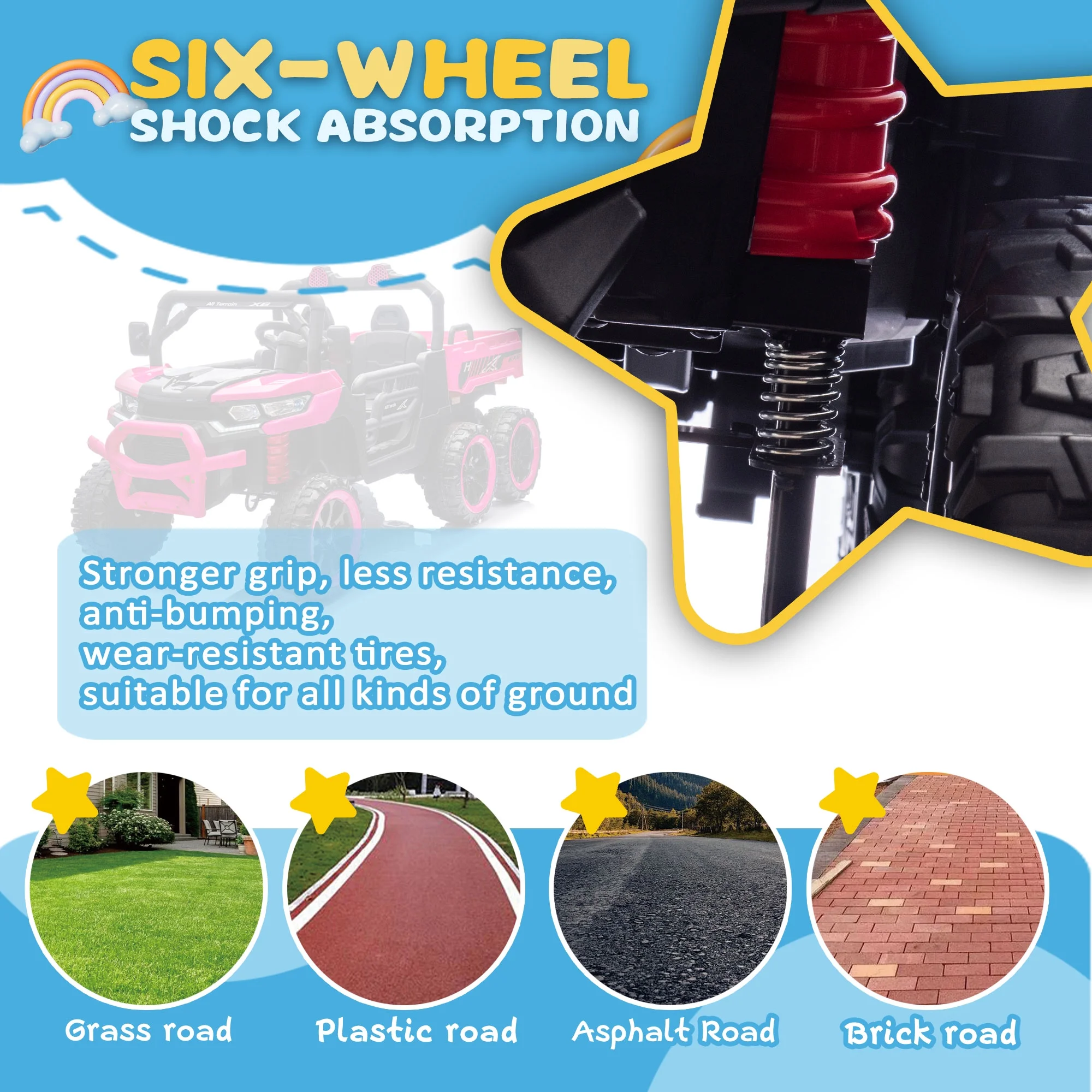 - This 24V ride on truck for kids is equipped with rechargeable batteries and a powerful 200W motor, making it easy to drive on different terrains, providing your child with a good driving experience. At the same time, four wear-resistant wheels with a powerful spring suspension system. Suitable for various roads, including asphalt roads, brick roads, and cement roads. In addition, our 200W motor not only has higher power, but also is very quiet.