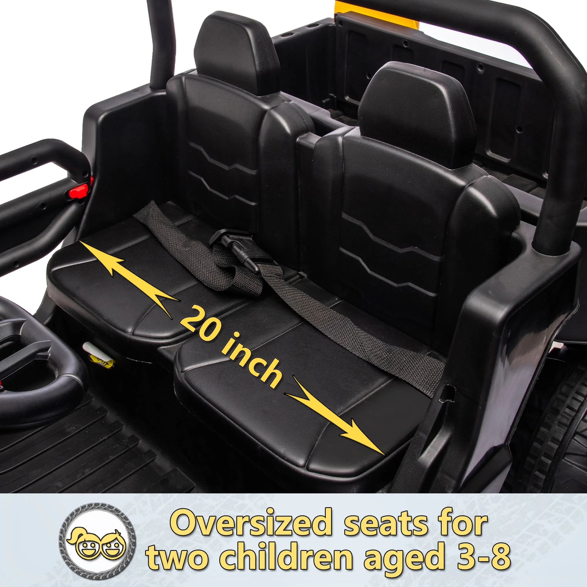 - This 2 seat ride on utv features a true two seater design and can accommodate up to two children aged 3 to 8 to drive. Seat is equipped with a seat belt to protect children. It has two driving modes: parental remote control and child manual control. Children can drive electric cars alone to experience fun, and parents can also control them through a remote control to ensure safety.