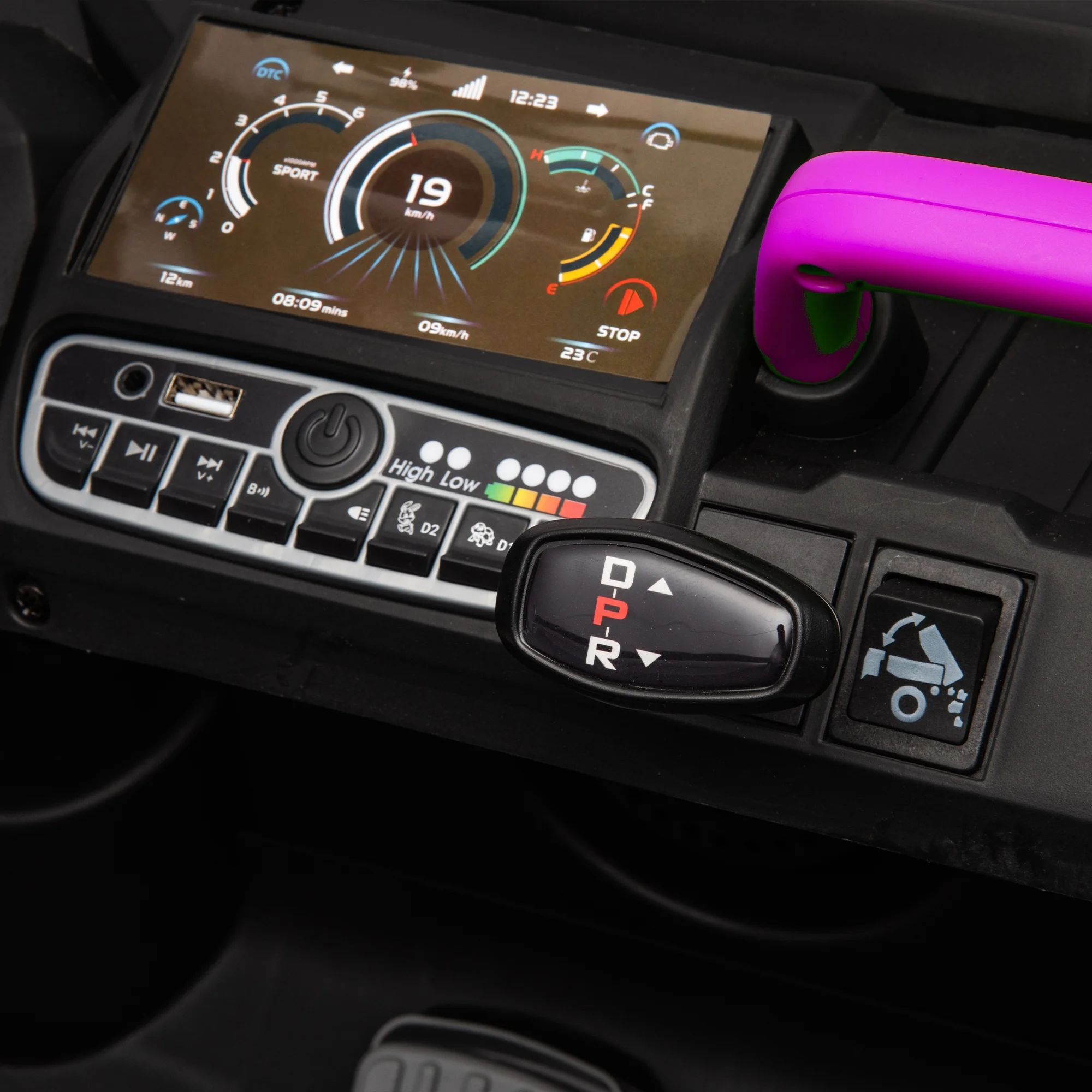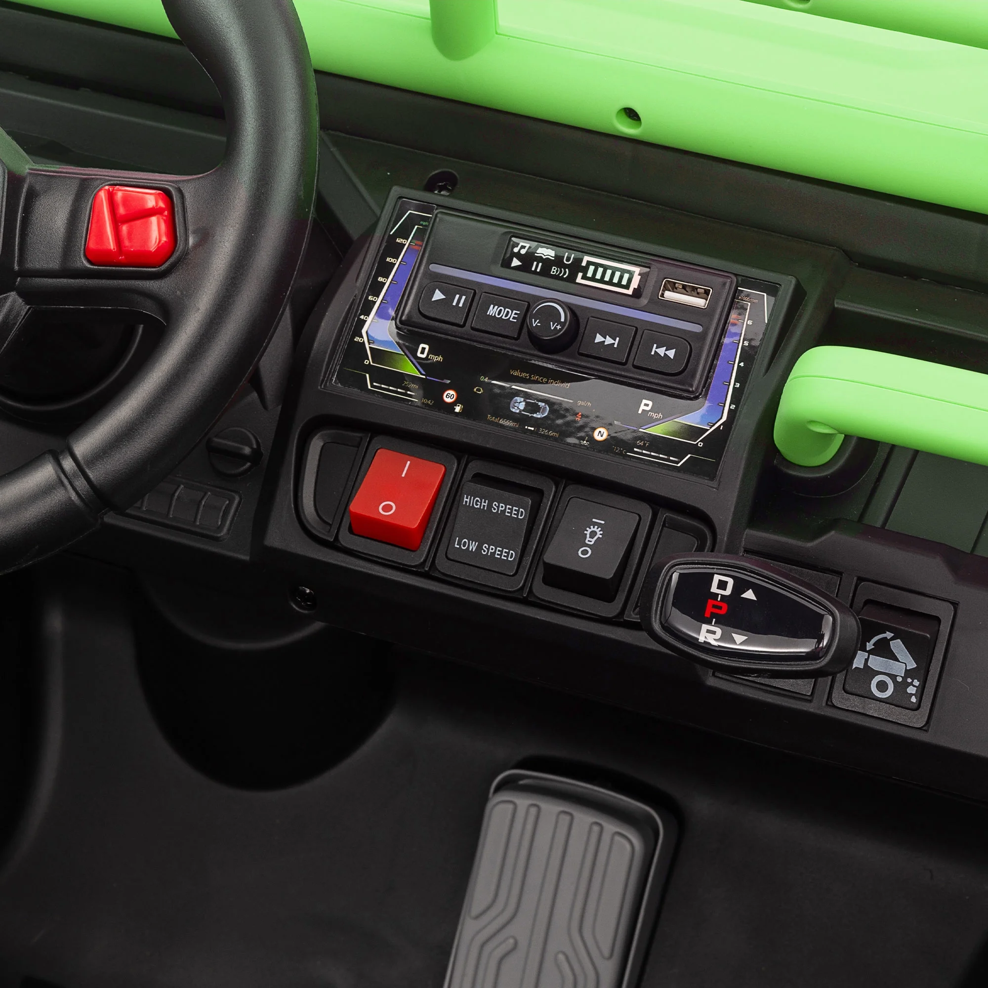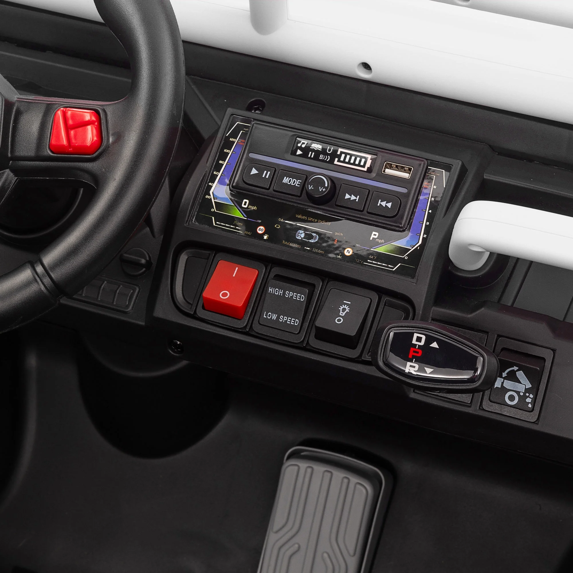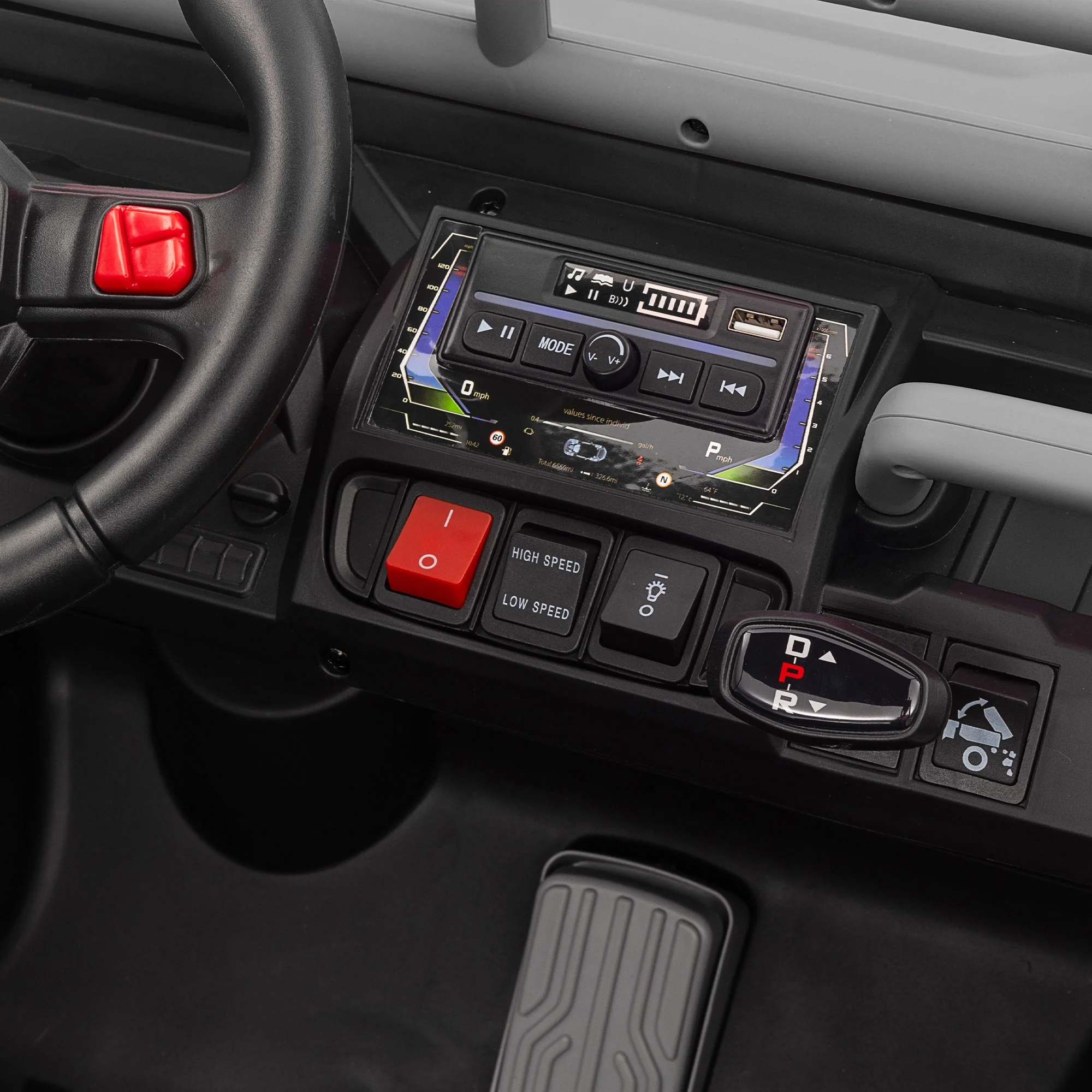 - FUNCTION: Electron assisted steering wheel, Forward and backward, RC, Three speed adjustable, Power display, slow start, USB,MP3 ,Bluetooth, LED light, Rear wheel suspension, safety belt, Two open door, Parent Control, Small central control, electric dump bed with extra shovel