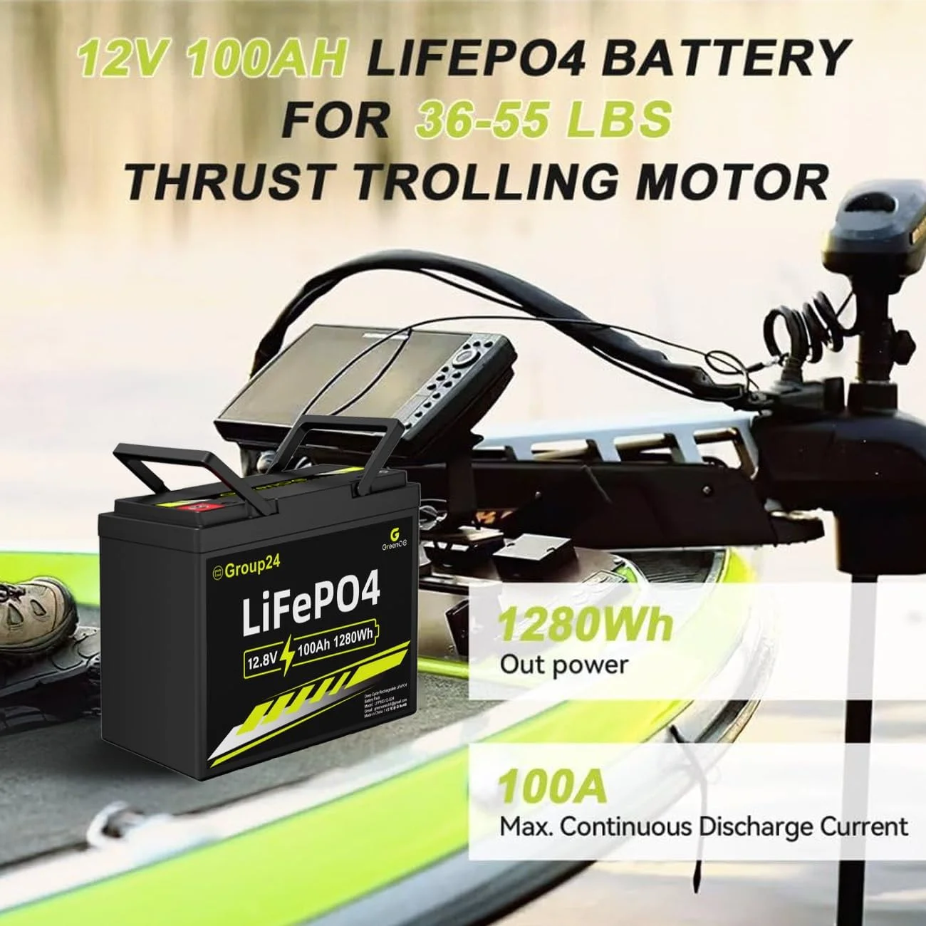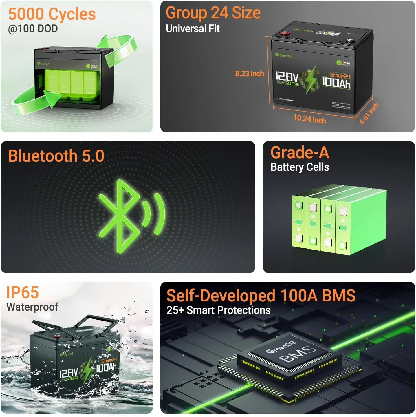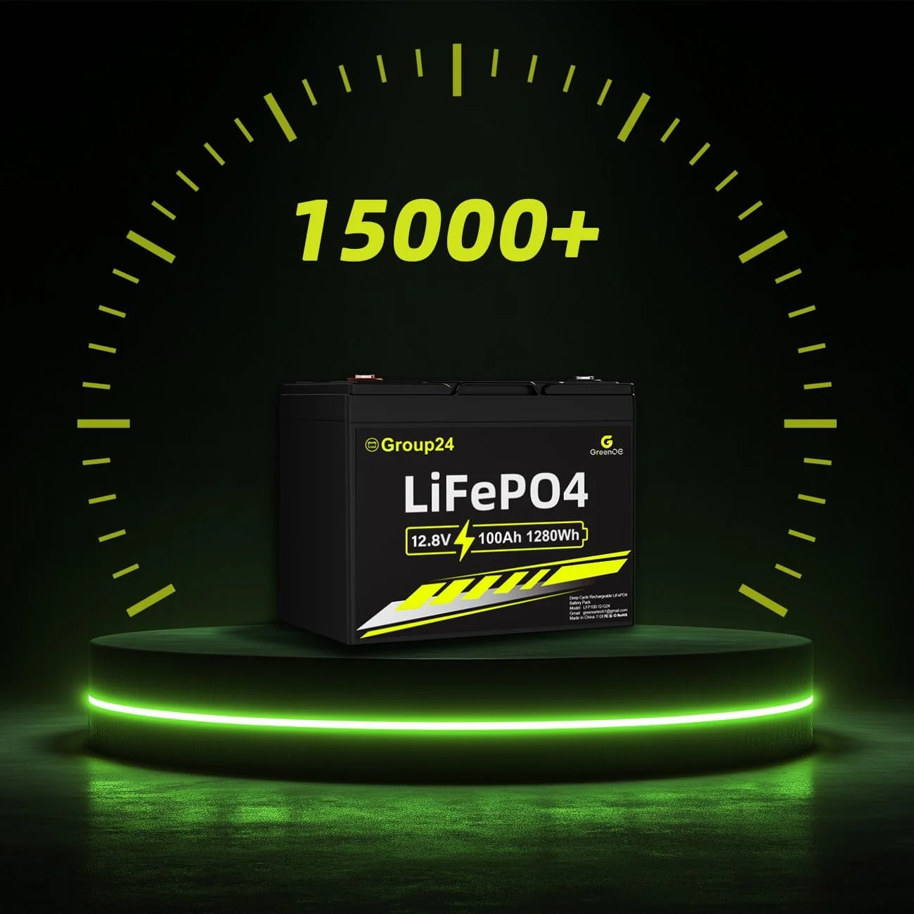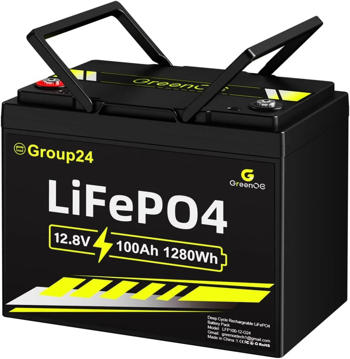 Greenoe 12V 100ah LiFePO4 Battery Group 24 with Built - in 100A BMS, 15000 Deep Cycles Rechargeable Lithium Battery Perfect for Solar System, Rvs, Marine, Vans, Trailer, Backup