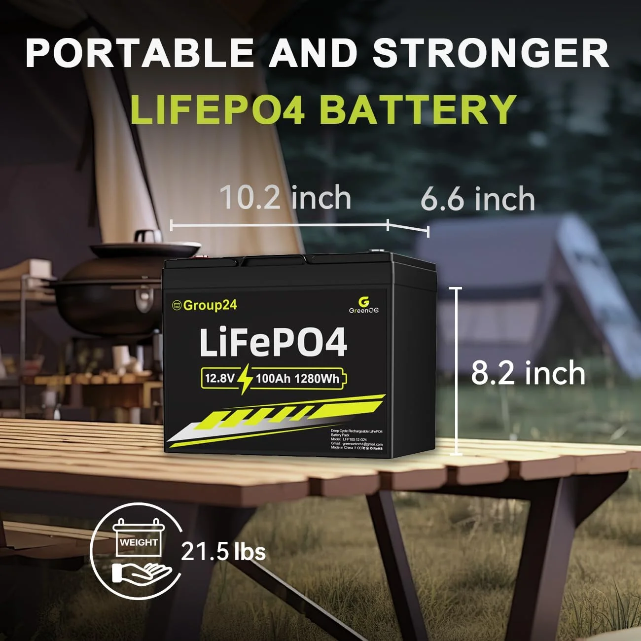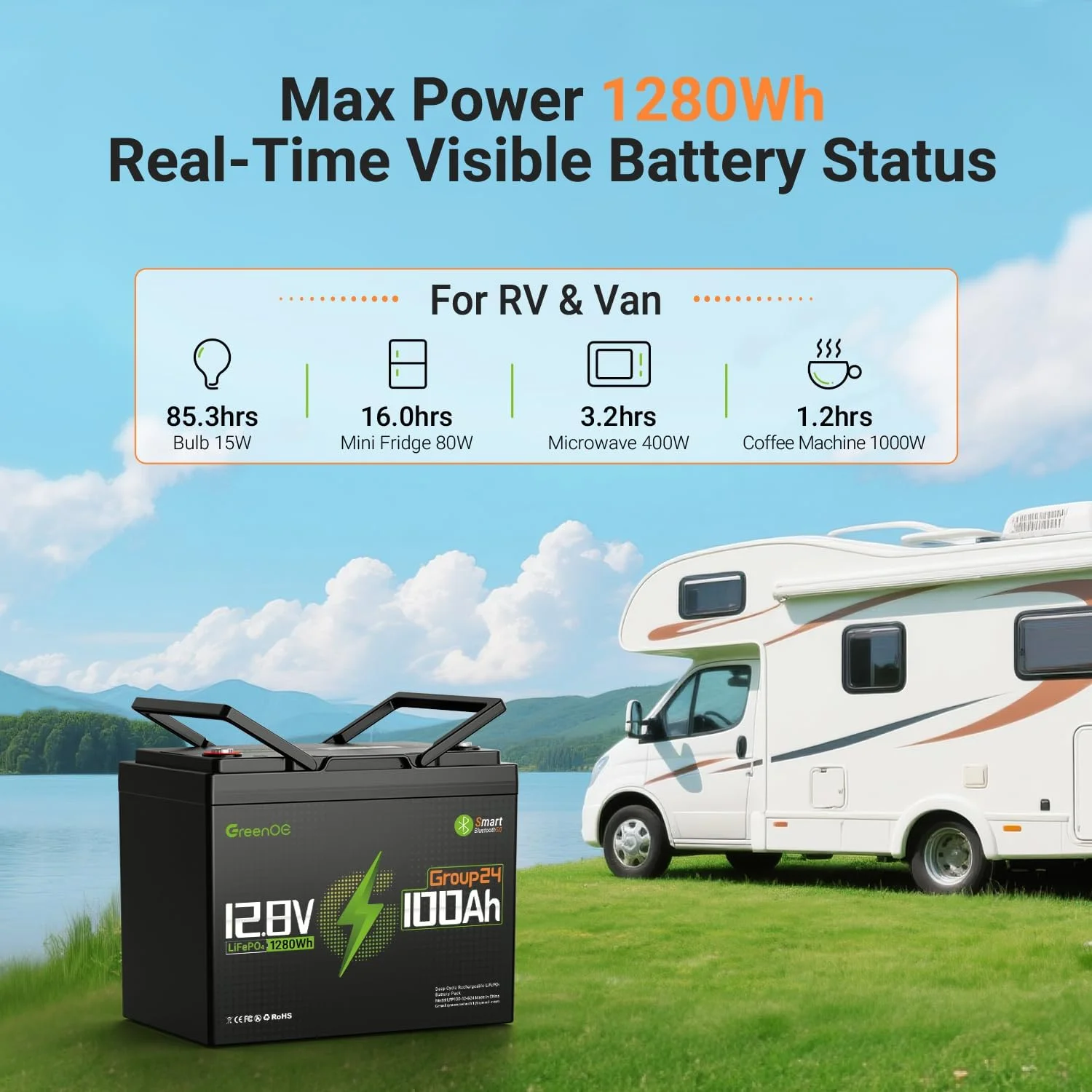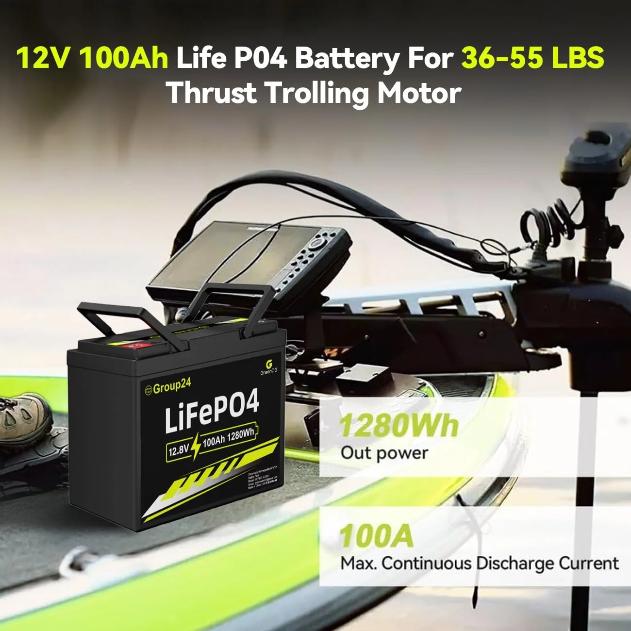Greenoe 12V 100ah LiFePO4 Battery Group 24 with Built - in 100A BMS, 15000 Deep Cycles Rechargeable Lithium Battery Perfect for Solar System, Rvs, Marine, Vans, Trailer, Backup