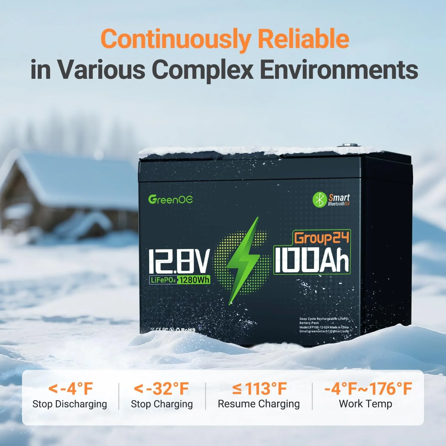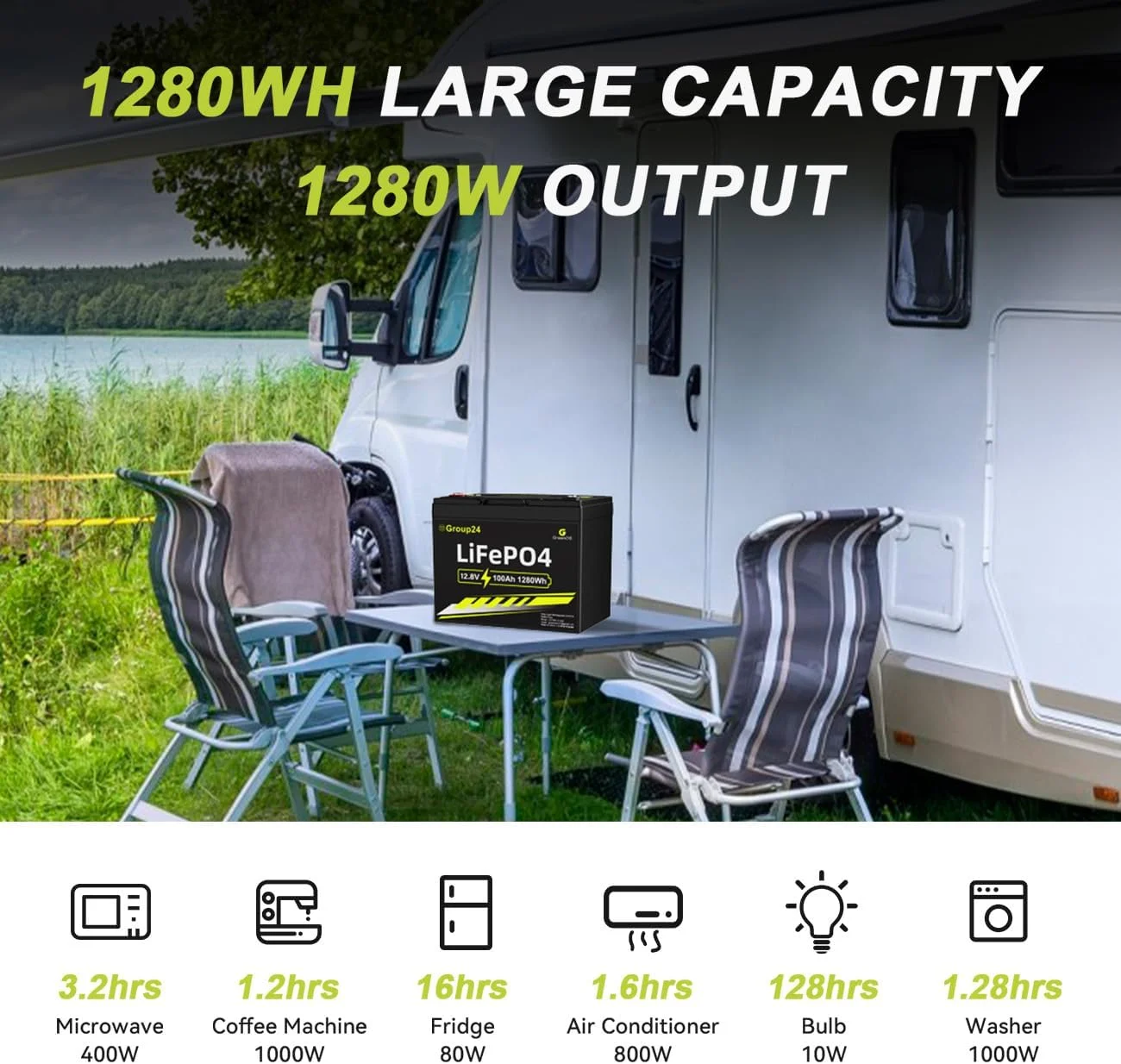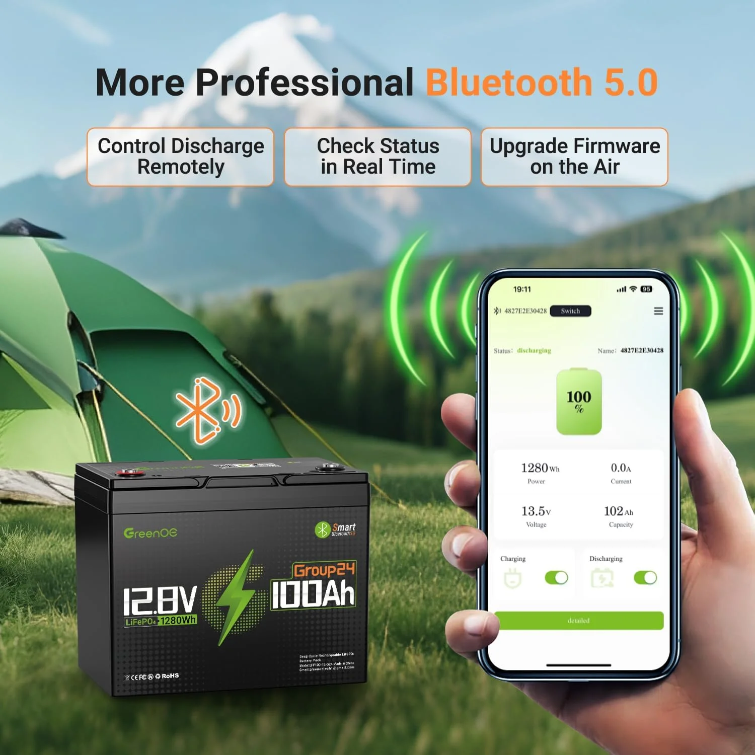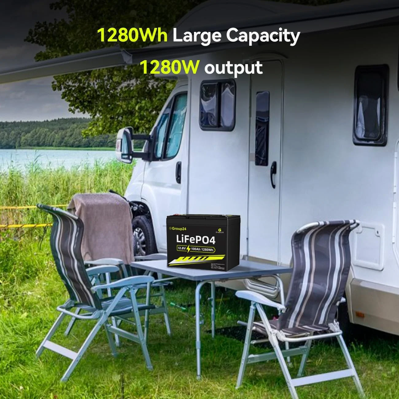 GreenOE 12V 100Ah Group 24 LiFePO4 Battery features advanced LiFePO4 technology, delivering superior performance, longer cycle life, and enhanced safety over traditional lead-acid batteries. This 12V deep-cycle battery is ideal for RVs, solar systems, marine use, and off-grid power storage, providing 100Ah of reliable power with consistent output. Its maintenance-free design includes a built-in battery management system (BMS) for optimal performance and protection. Engineered for a long lifespan, it supports thousands of charging cycles while maintaining stable capacity retention. A durable, high-efficiency power solution for demanding applications.