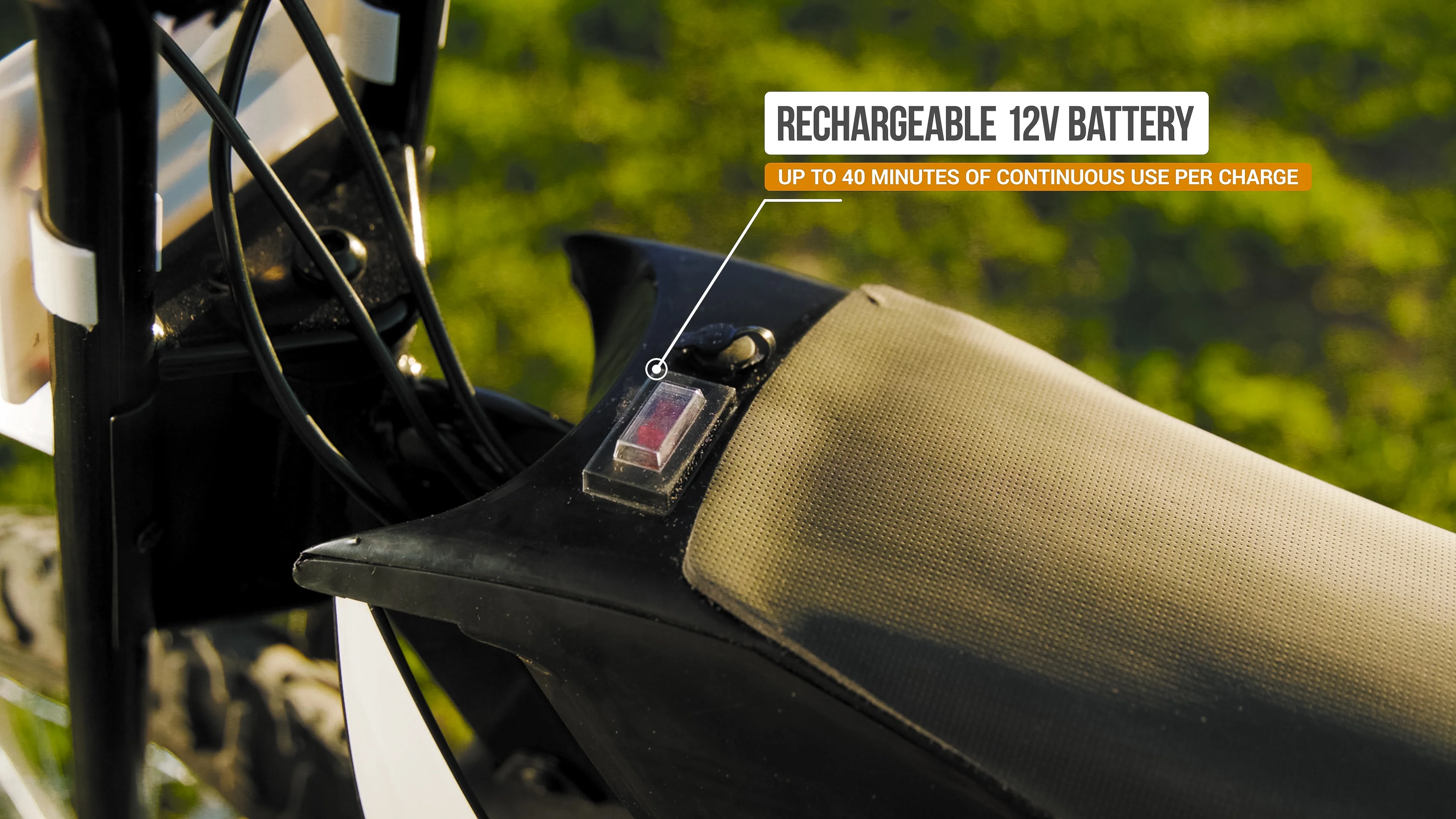 - Battery: 12V sealed lead-acid, rechargeable (battery charger included)