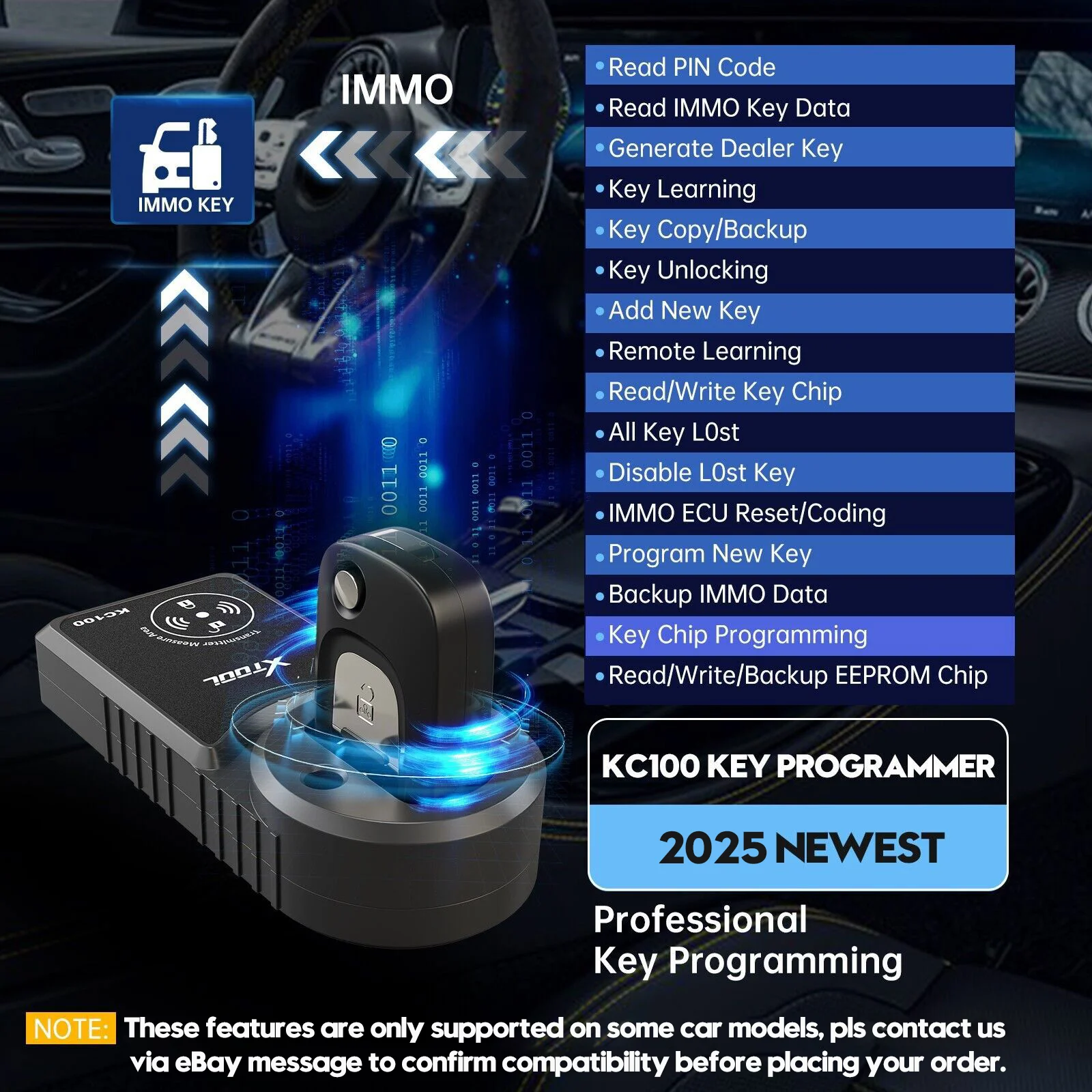 �?XTOOL KC100 DON'T do key programming for all vehicles. Please send us your cars' details for compatibility (Brand, Model, Year, and VIN#).