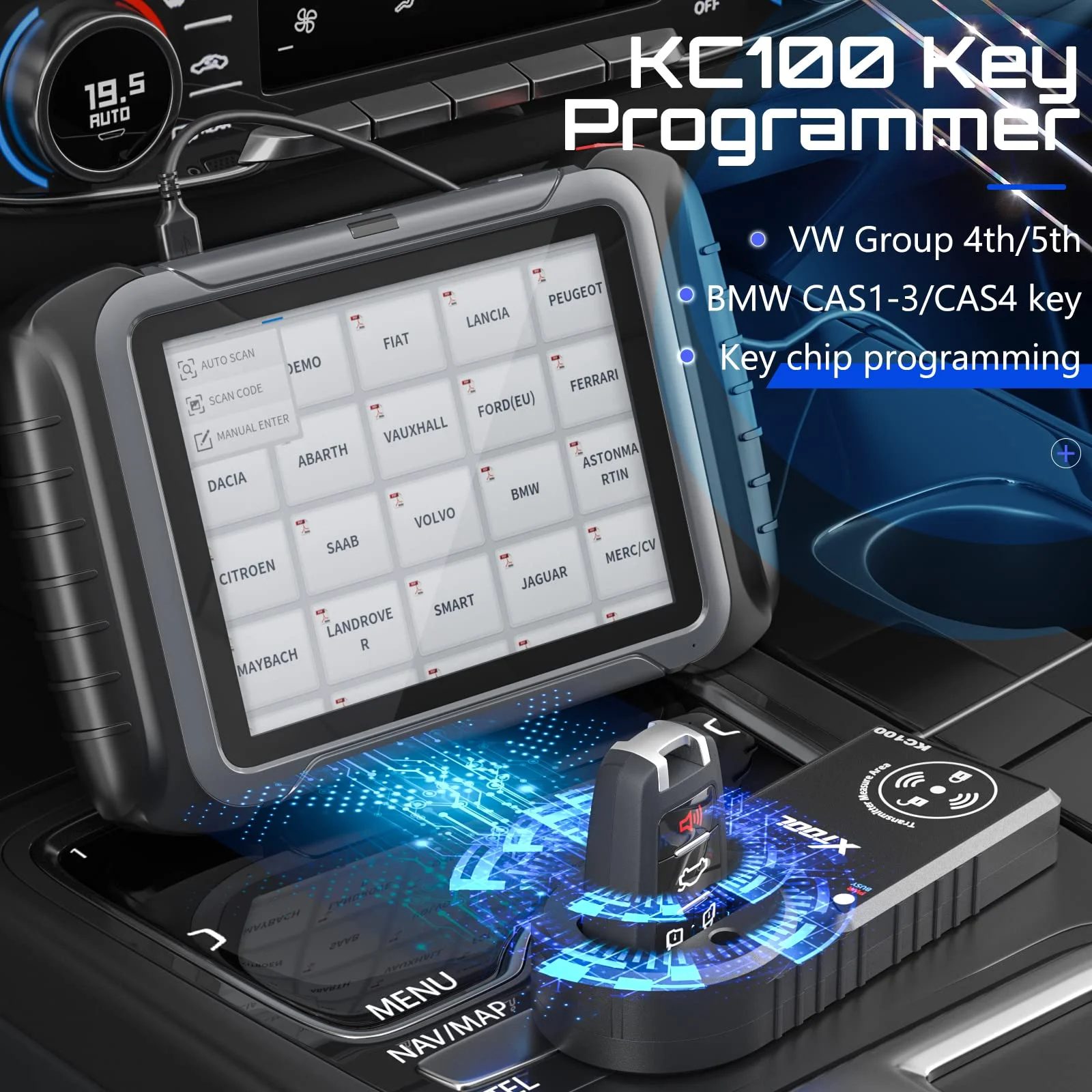 The XTOOL KC100 is a professional automotive key programming adapter that enhances the IMMO and key programming functions of compatible XTOOL diagnostic tools such as X100PAD3, D8, D9, IP616, and IP819. It supports VW/Audi/Skoda 4th & 5th IMMO, BMW CAS1-CAS4, Fiat 500, and Land Rover smart keys. When used with the optional KS-1 simulation card (not included), it enables All-Key-Lost functions for Toyota/Lexus/Scion (94/98/88/A8/A9/39). Ideal for automotive locksmiths and technicians handling car key programming for various brands and models. Suitable for professional use, workshop, or mobile diagnostics. Great tool for Father's Day or as a gift for car repair pros.