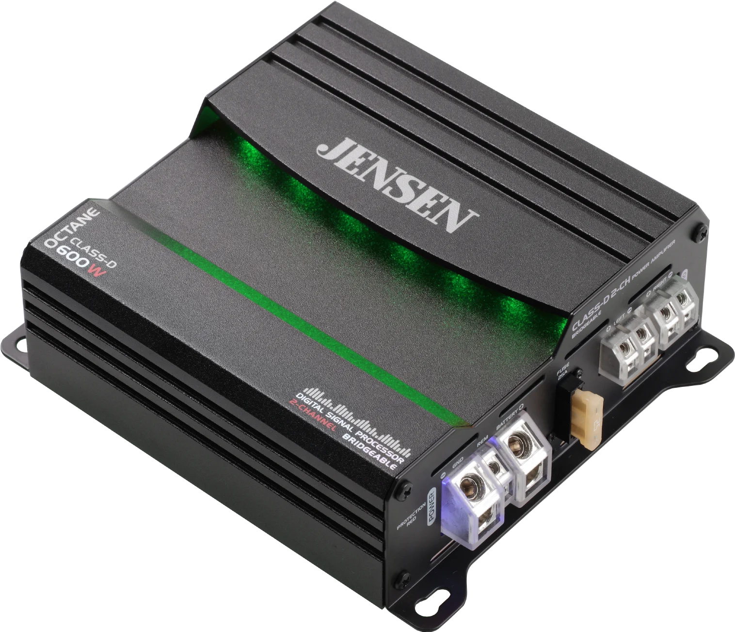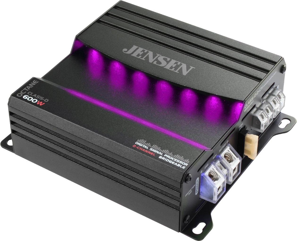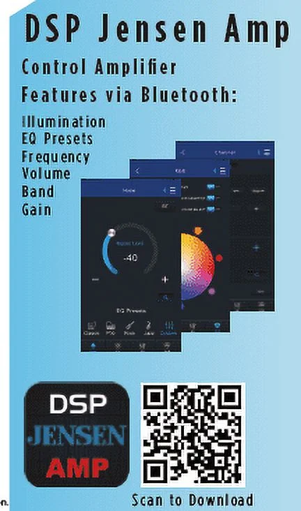 - RGB ILLUMINATION VIA BLUETOOTH APP the Jensen DSP app allows you to have full control over your amplifiers various functions such as: Illumination, Remote Bass, Frequency, Volume and Gain