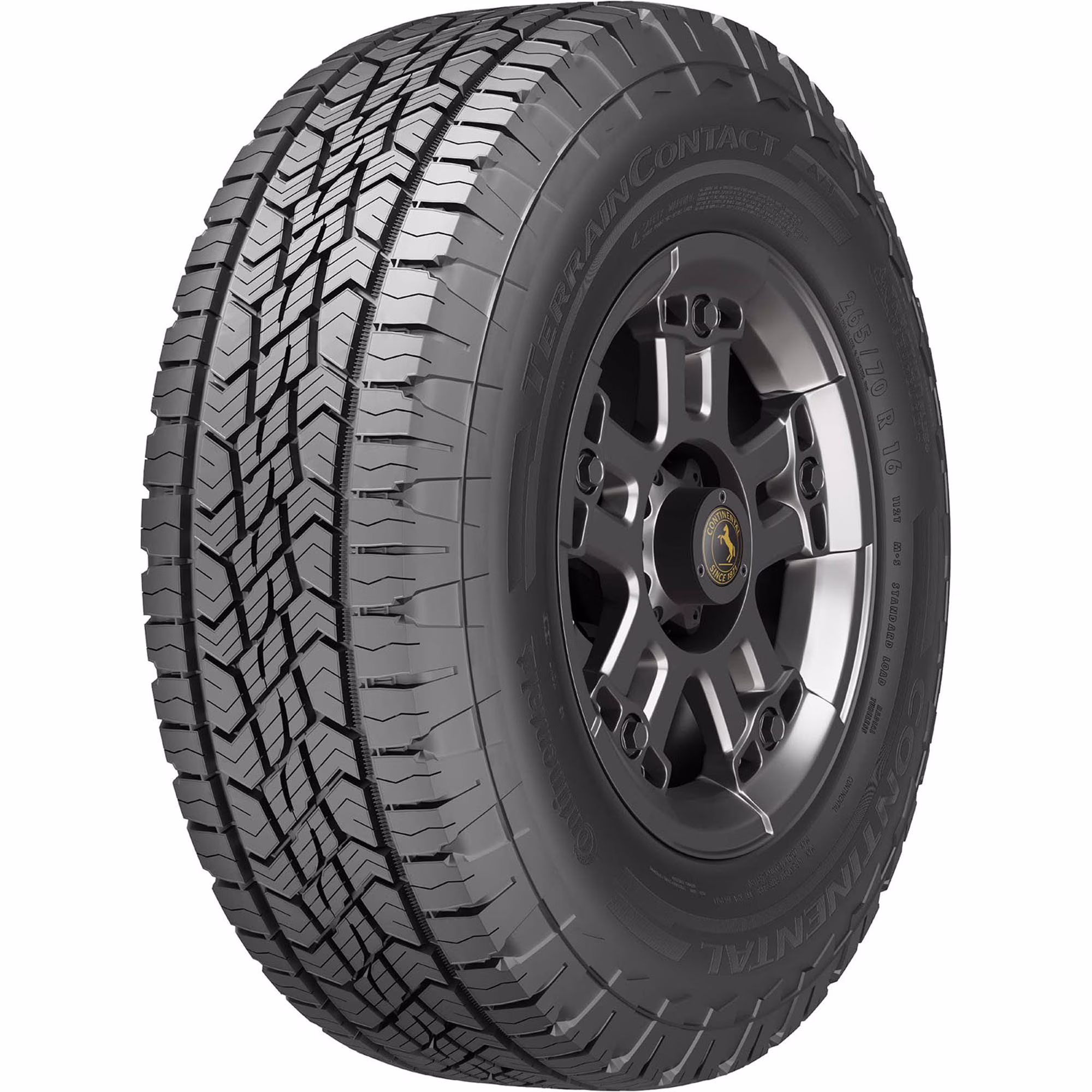The Continental TerrainContact A/T is an all-terrain tire that is designed for use on light trucks and SUVs and is backed by a 60,000 mile limited manufacturer tread life. With the durability to conquer dirt, gravel and grass, the TerrainContact A/T features TractionPlus Technology for improved traction and durability, better grip on wet roads, and quiet road noise.