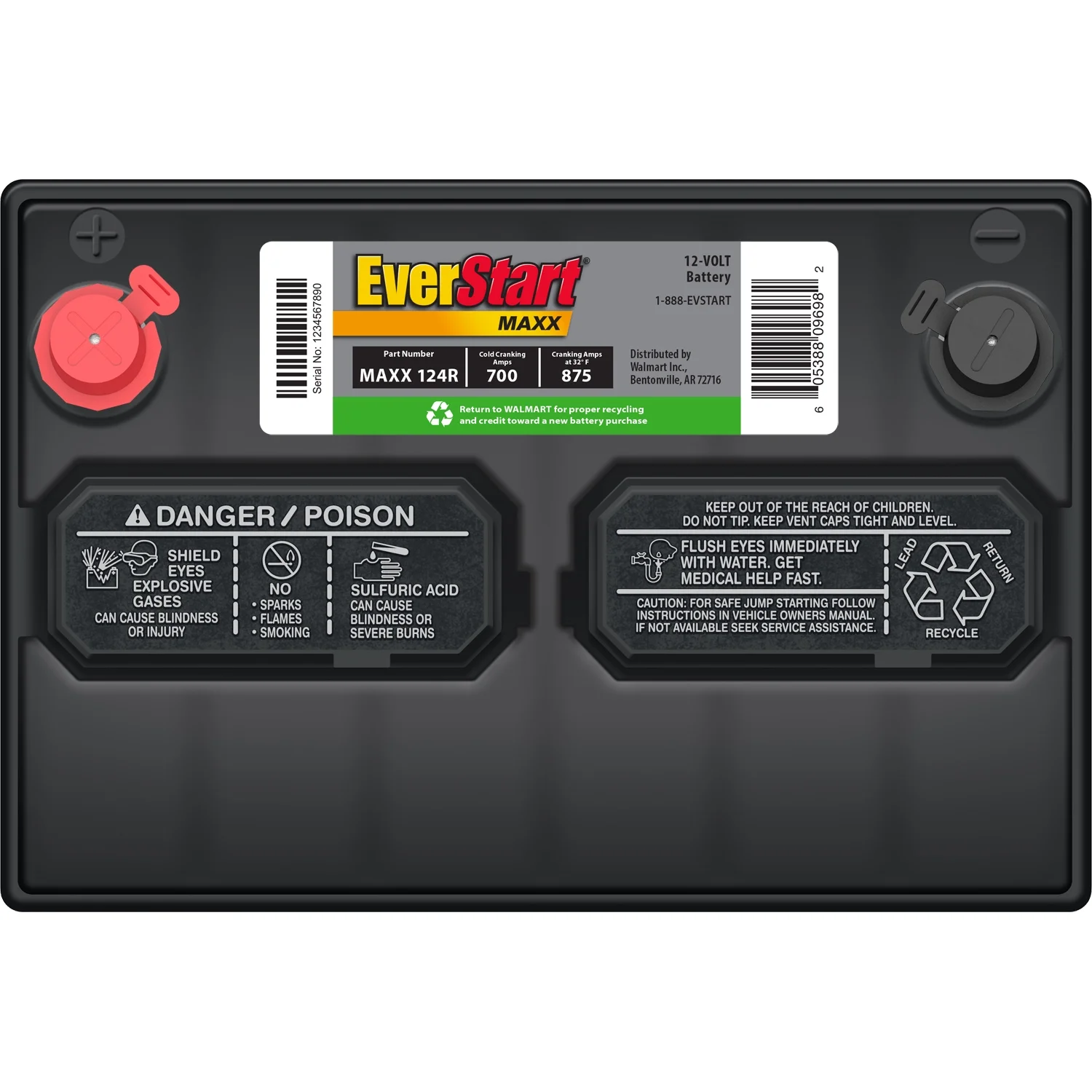 Get your car started and running again with the installation of the EverStart Maxx Automotive Battery, Group Size 124R. With a three year warranty this battery will not let you down. Compatible with a range of makes, models and years, it has conveniently located top posts for easily connecting positive and negative terminals. This 12 volt lead acid automotive battery delivers 700 cold cranking amps with 120 minutes of reserve capacity for reliable starts in all weather. This battery is maintenance free and can be conveniently installed and tested at a local Walmart Auto Care Center.