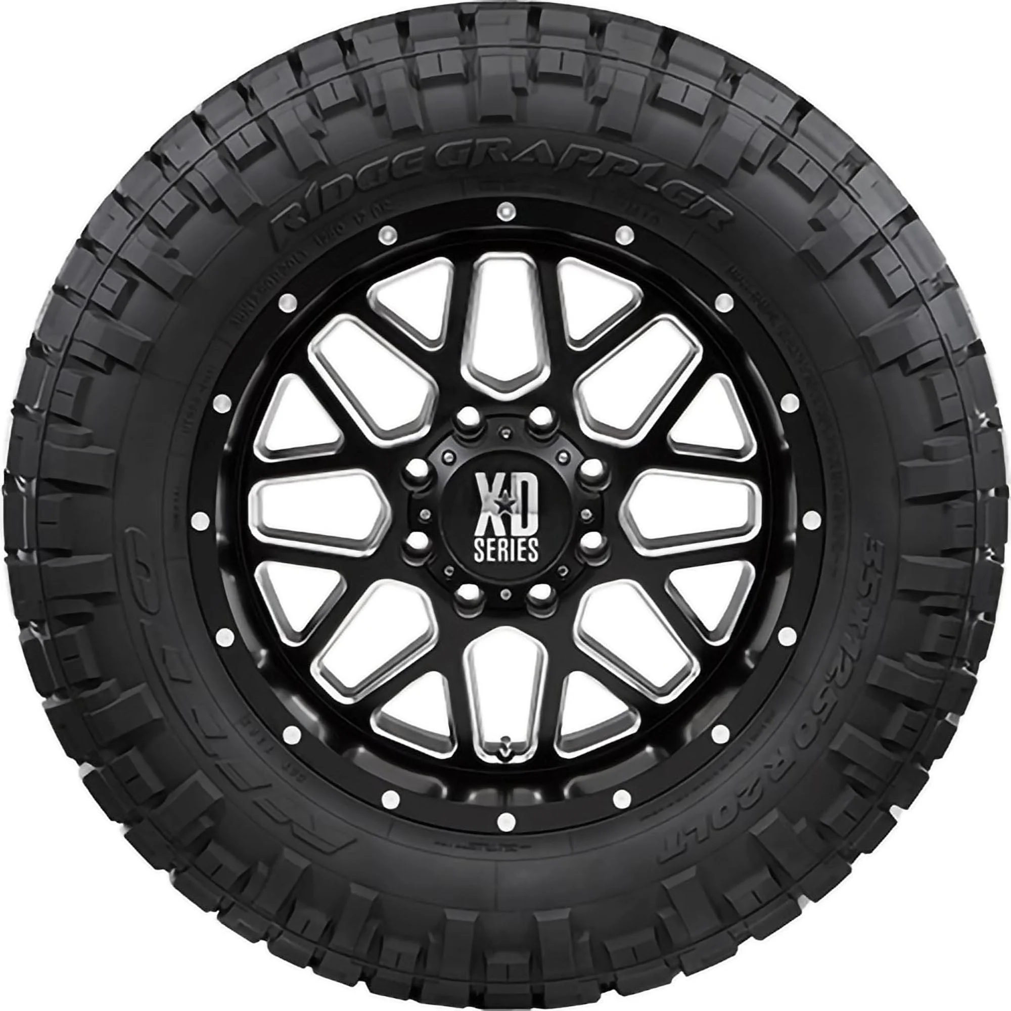 The Nitto Ridge Grappler is a hybrid-terrain light truck tire engineered to deliver a quiet on-road ride with capable off-road performance. Highway comfort is provided by a Variable Pitch Tread Pattern that reduces road noise. A key feature is its dual-sidewall design with two different looks for a customizable appearance. For off-road traction, aggressive shoulder grooves clear mud, while staggered shoulder lugs and lateral Z-grooves provide biting edges. Durability is enhanced by a reinforced block foundation that reduces flex and stone ejectors that protect the tread, while step block edges create additional traction.
