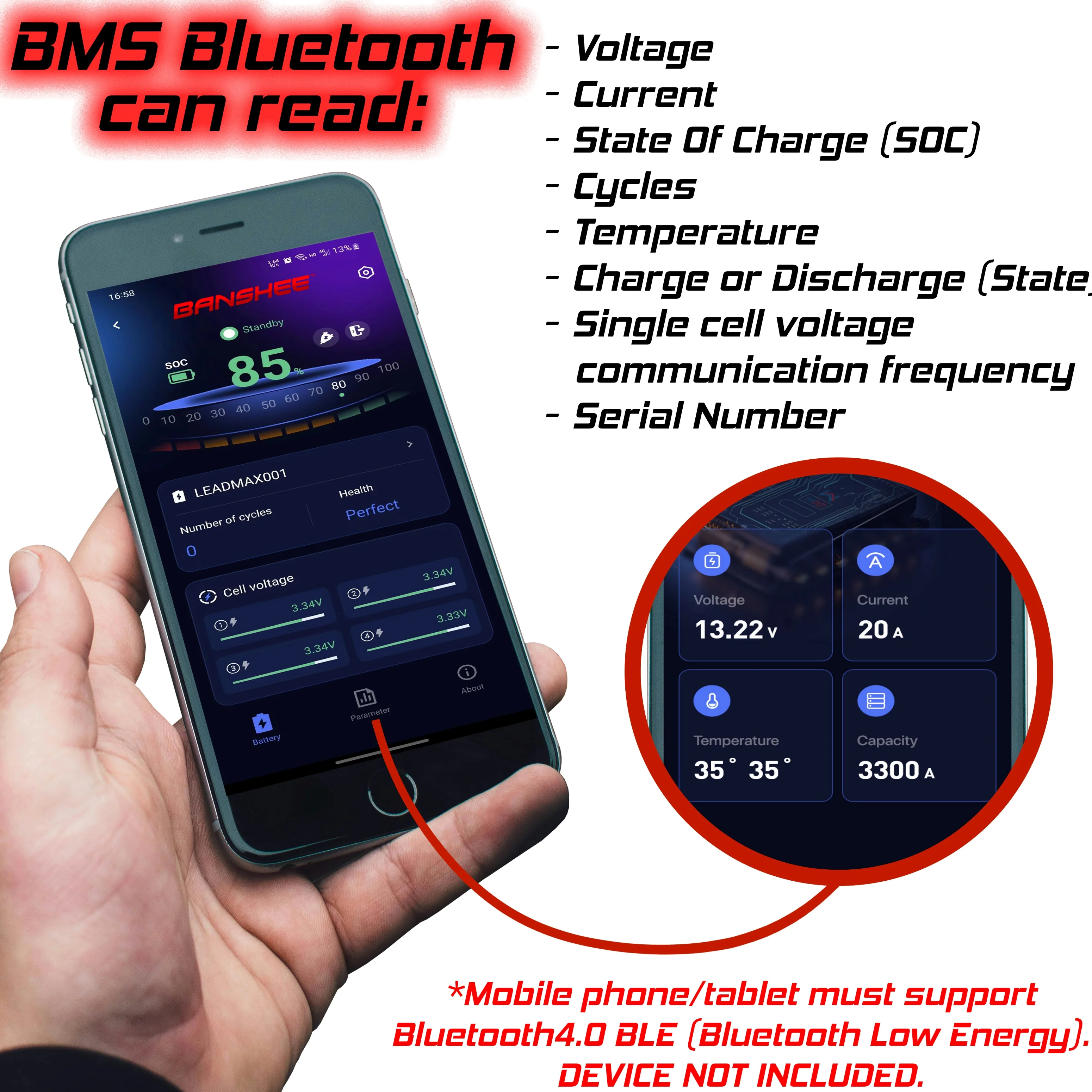 - Download the "BANSHEE" App onto any bluetooth compatible phone or tablet, and see: voltage, current, State Of Charge (SOC), cycles, temperature, Charge or Discharge (State), single cell voltage communication frequency, & serial number.