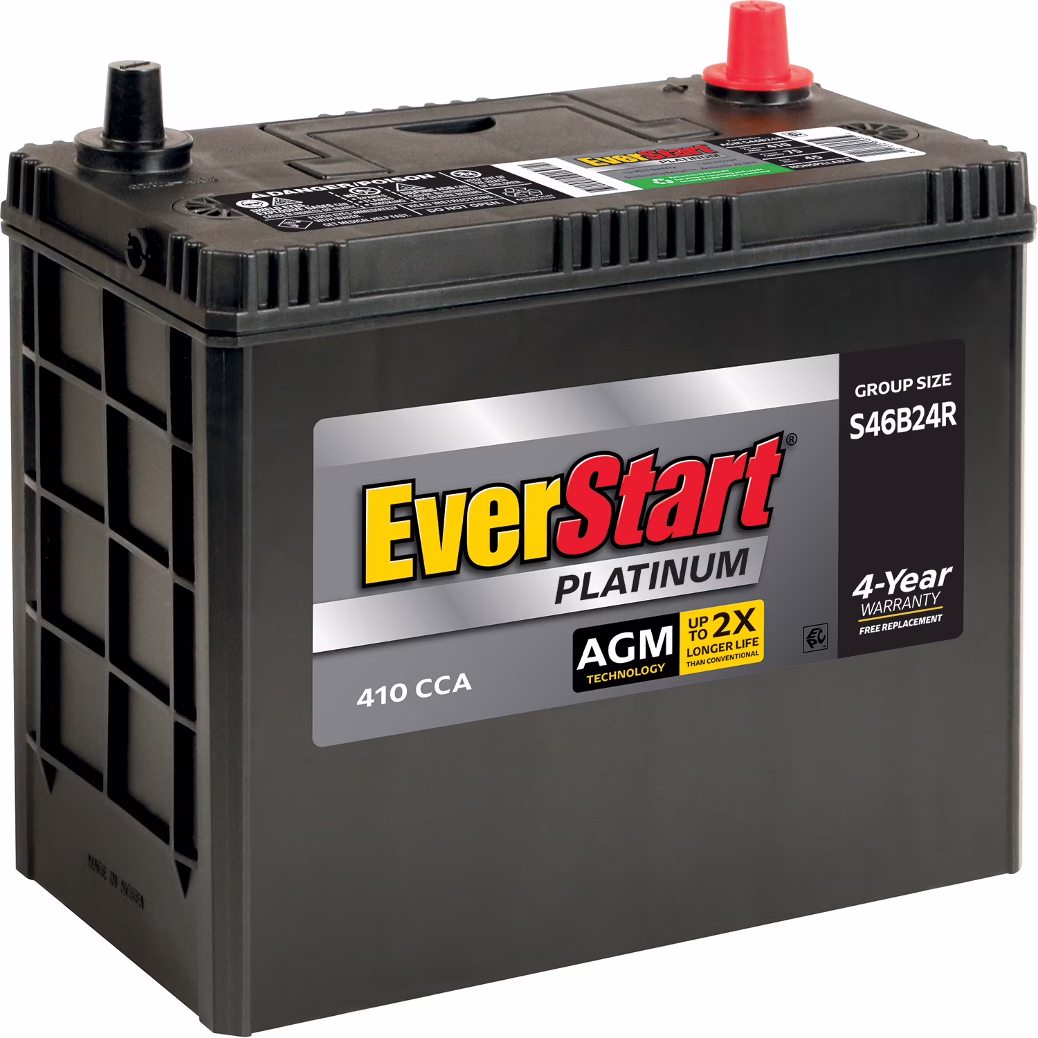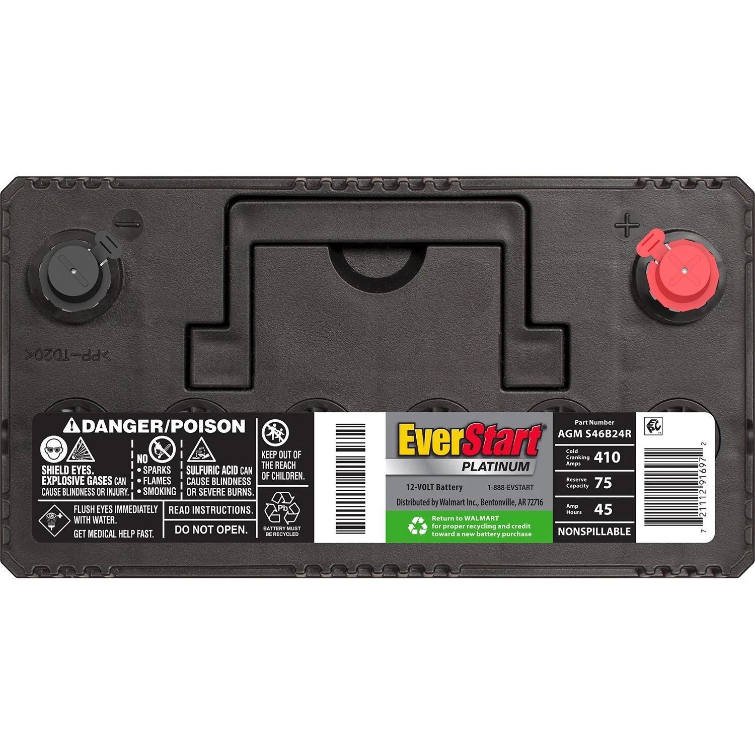 Stay on the go with this The EverStart Platinum AGM battery, Group Size S46B24R. It is the best choice for your power-hungry vehicle and comes with a four year warranty. Electronic features such as DVD players, GPS systems, heated seats, audio systems and start-stop technology all add to the demand on a battery. Every additional electronic component creates a power draw, which leads to more discharge and recharge cycles, which shorten the lifespan of ordinary batteries. This 12 volt EverStart Platinum AGM battery delivers 410 cold cranking amps with 75 minutes of Reserve Capacity. They are precision engineered to offer the ultimate combination of reliability, durability, and safety, even under the most demanding applications.