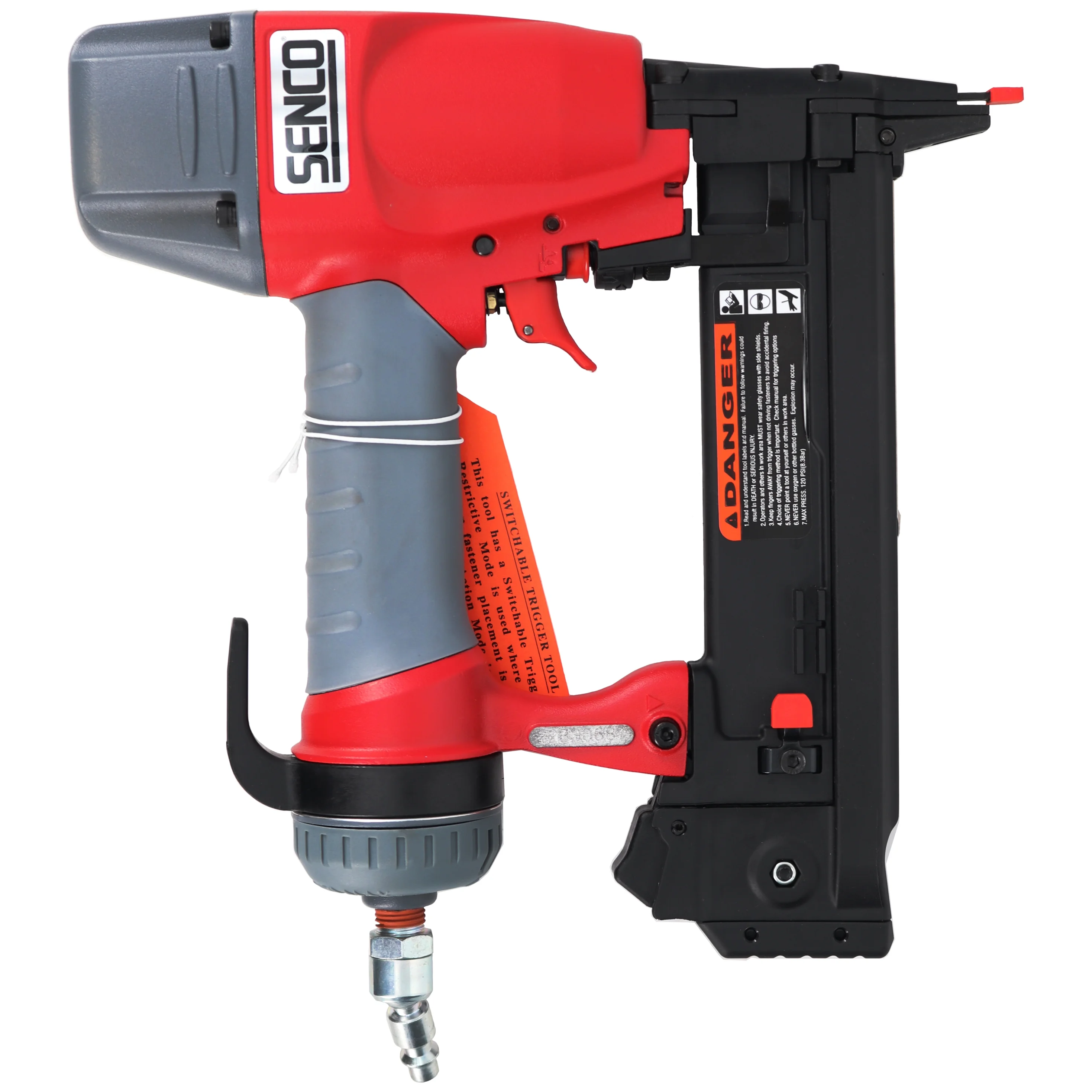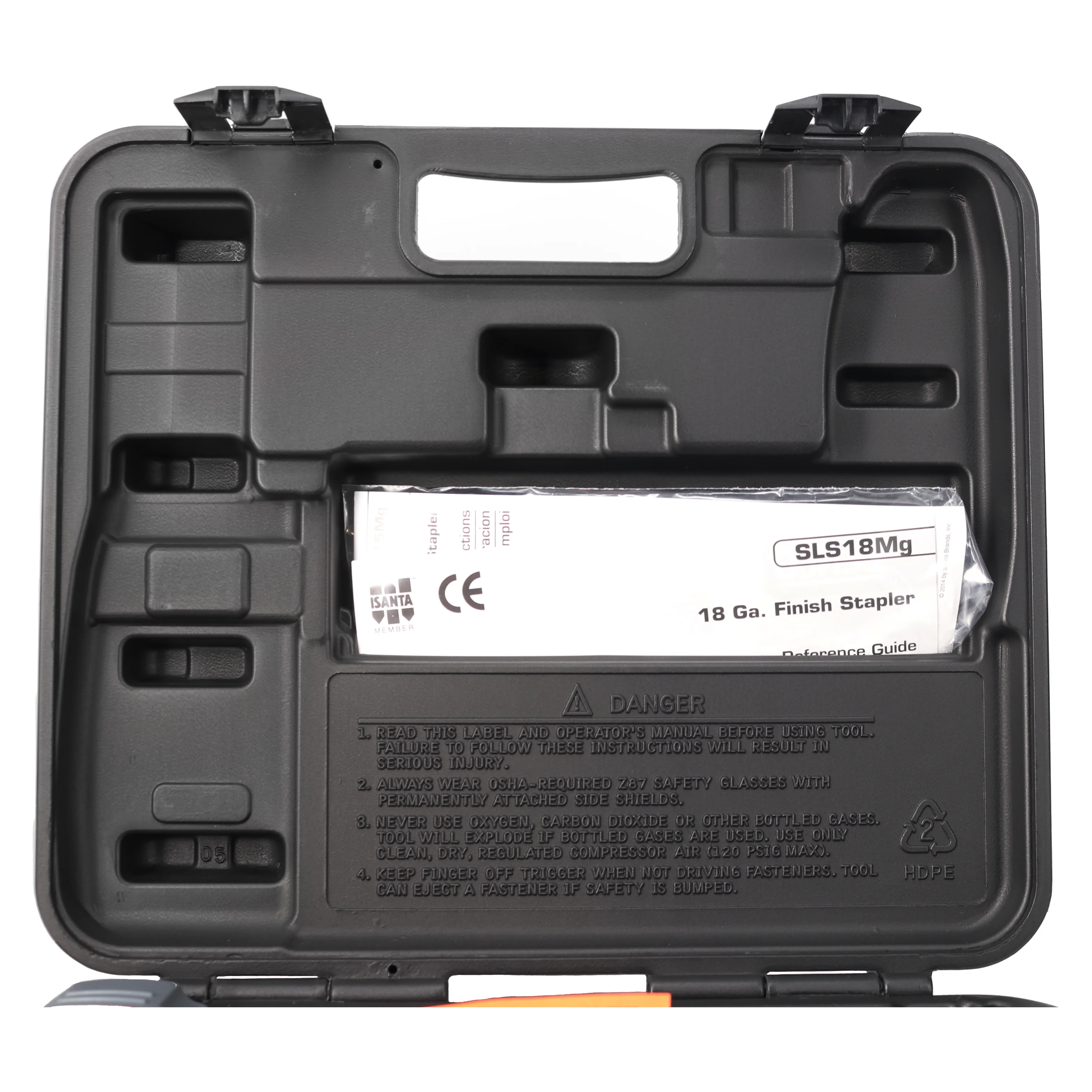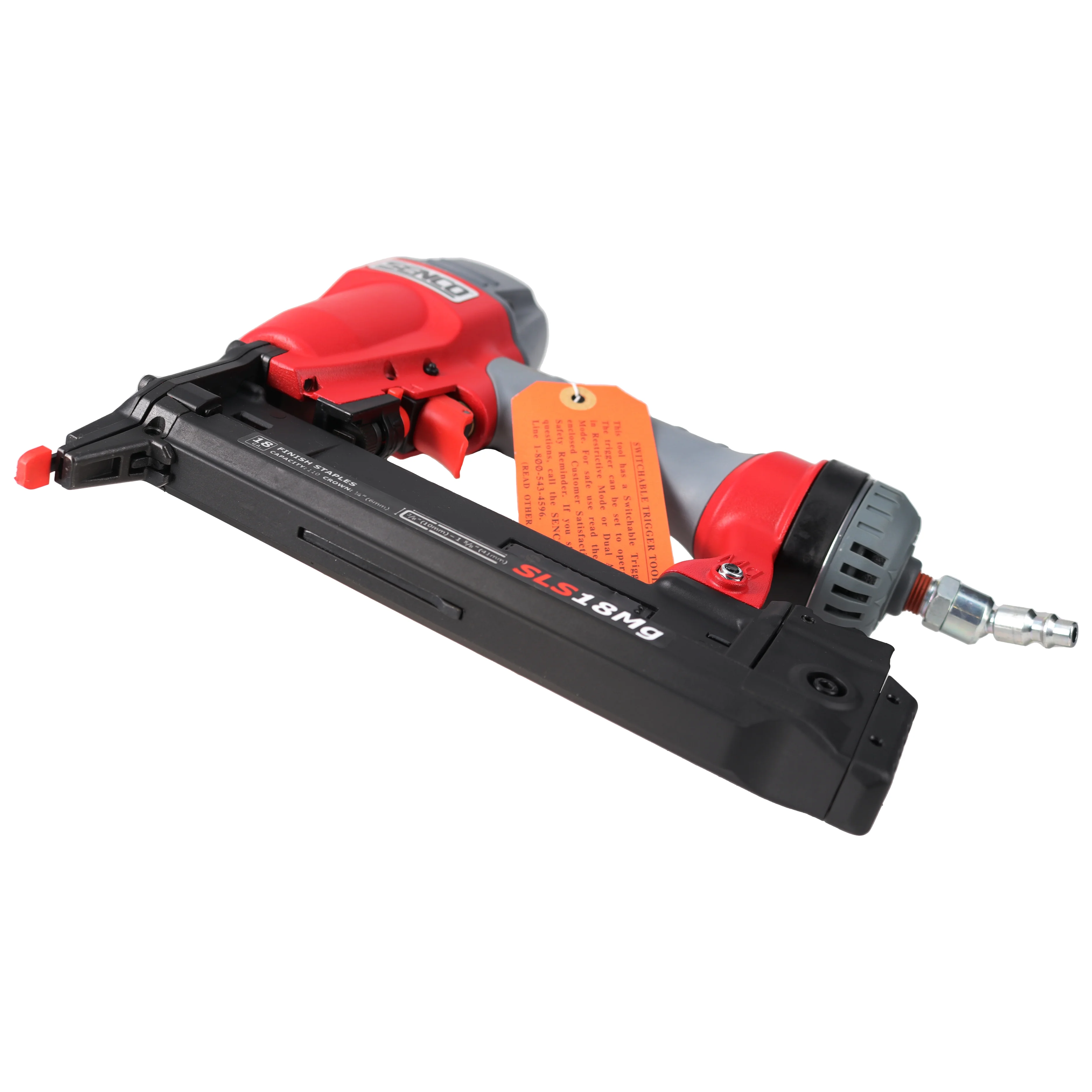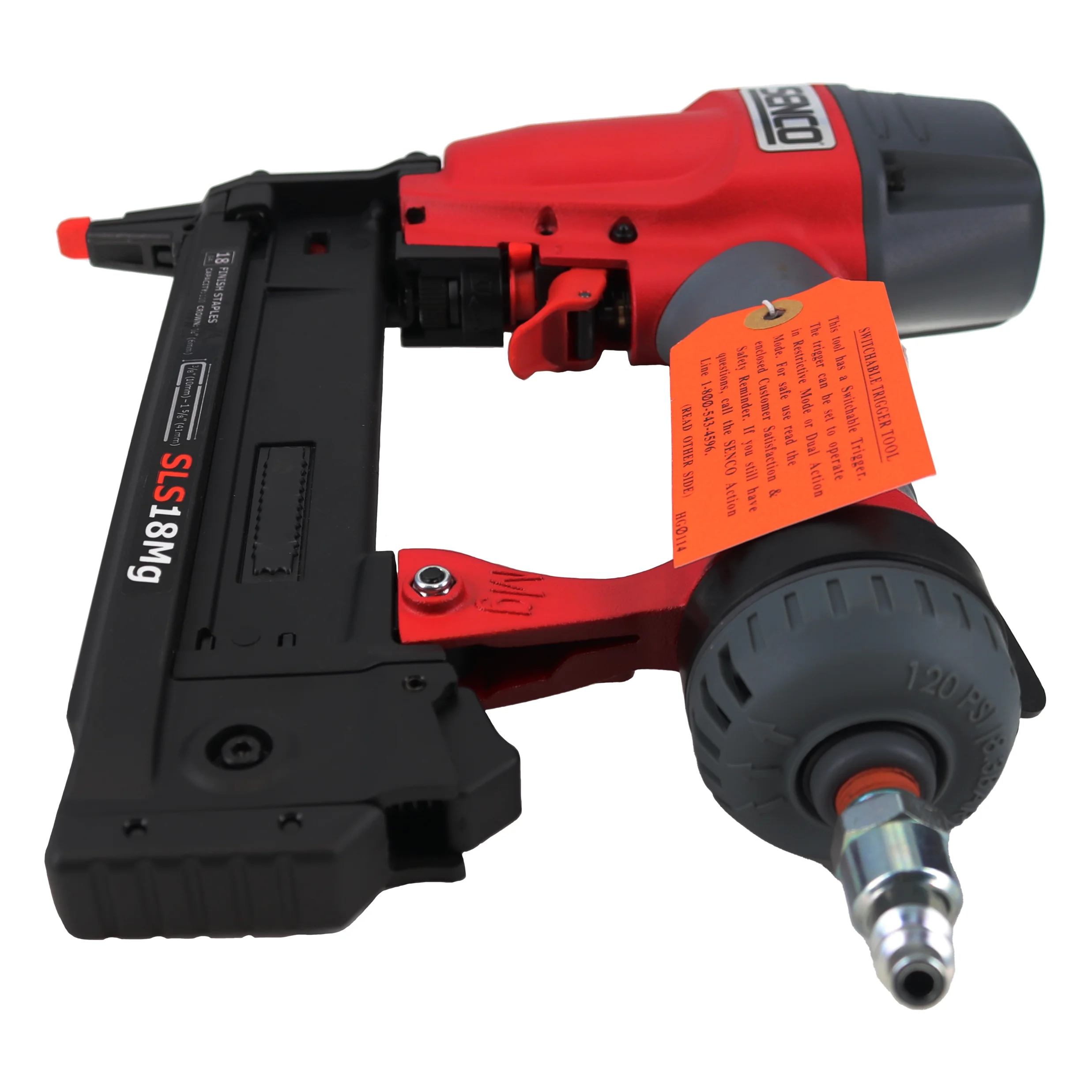 The Senco SLS18MG (model 1W0021N) is a lightweight and durable pneumatic finish stapler designed for professional use. It features a magnesium body that makes it comfortable to hold for extended periods, despite its ability to drive 18-gauge staples from 3/8" to 1-1/2" long. The stapler uses a narrow crown (staple width) of 1/4" and boasts an oil-free design, eliminating the need for messy lubrication. For added convenience, the SLS18MG has a selectable trigger that allows you to switch between single shot (contact trigger) and continuous firing (sequential trigger) modes. The depth of the staple drive can be adjusted without any tools, and the exhaust port rotates a full 360 degrees to keep dust and debris away from your work. A belt hook rotates to accommodate both right and left-handed users, and the ergonomic grip minimizes fatigue. To protect your work surface, the stapler includes a no-mar pad.
