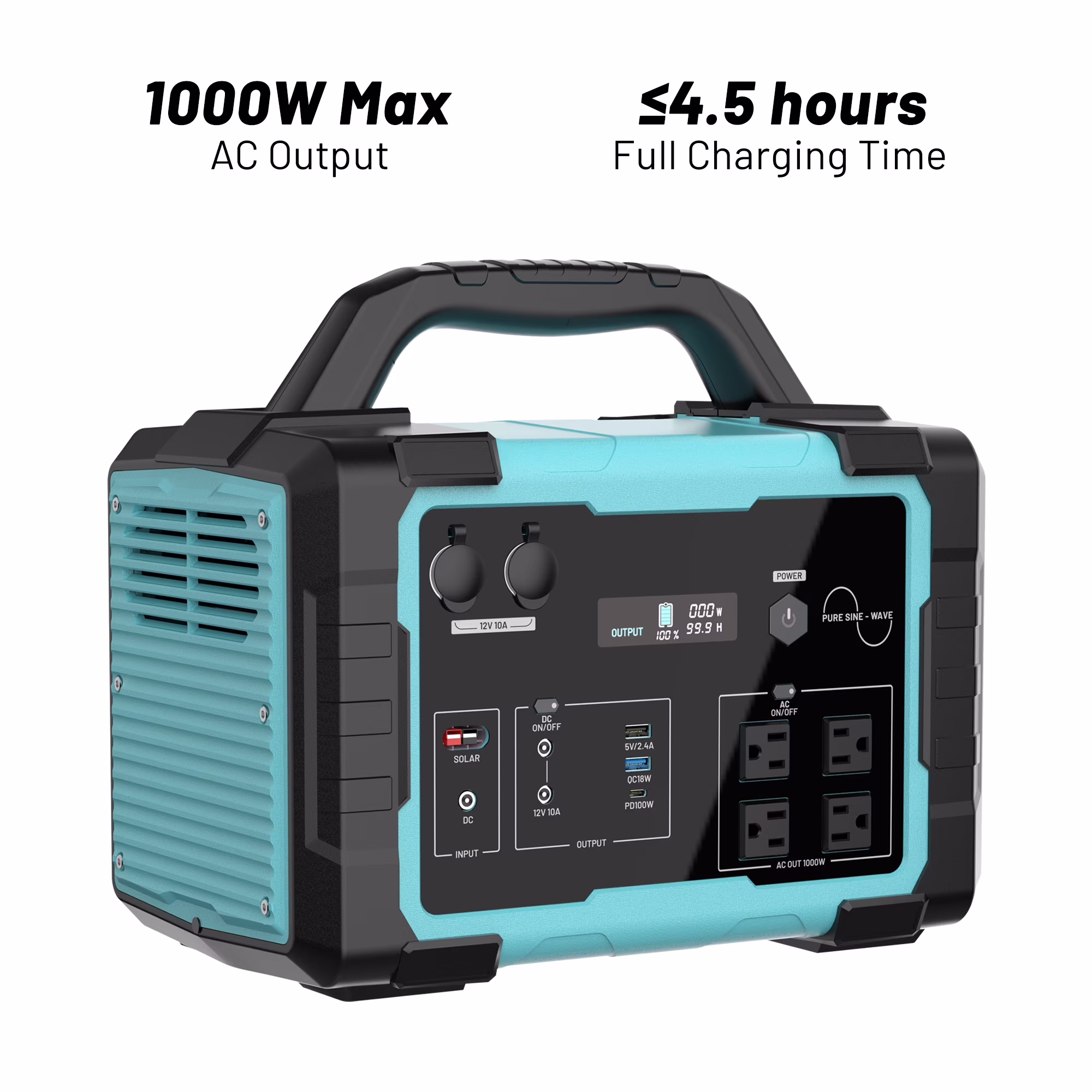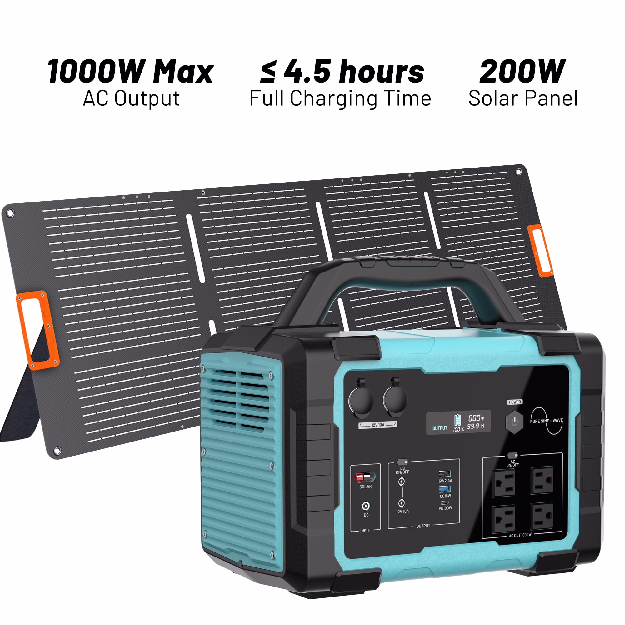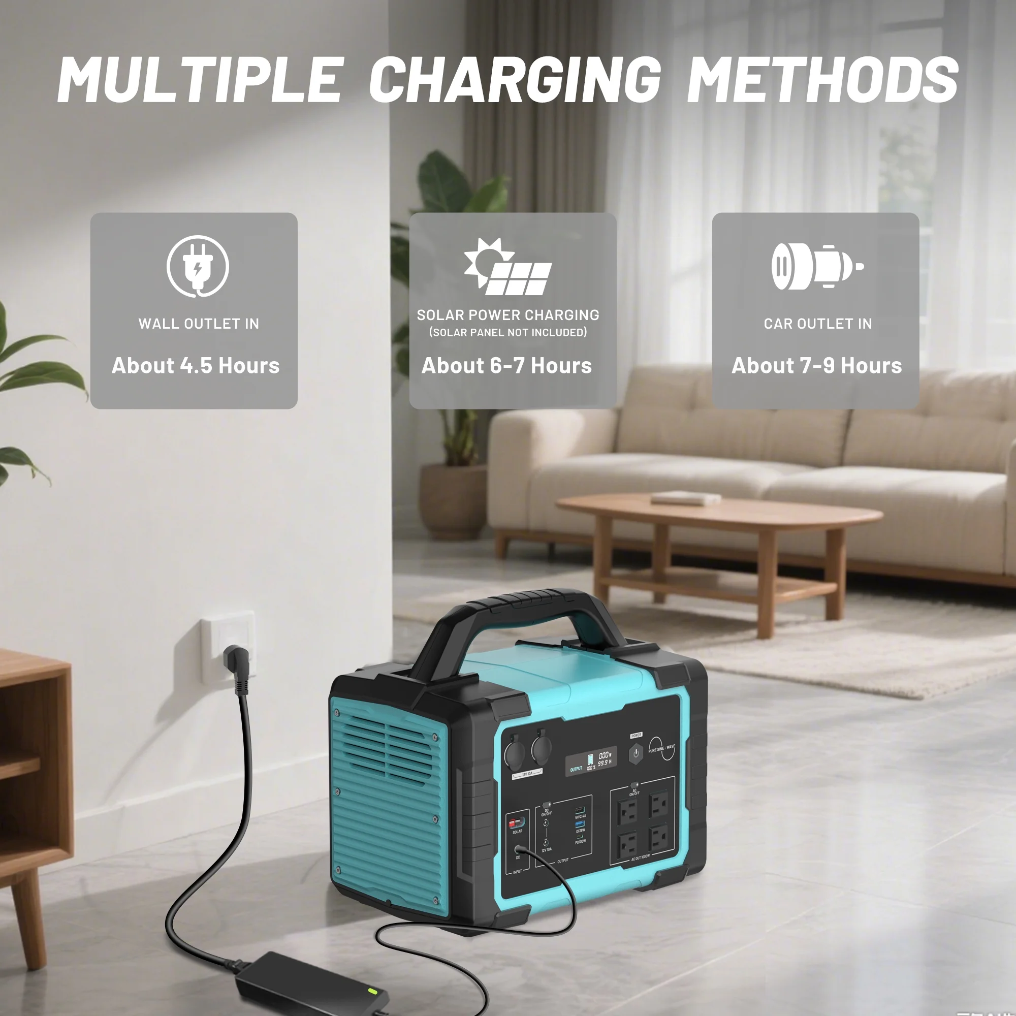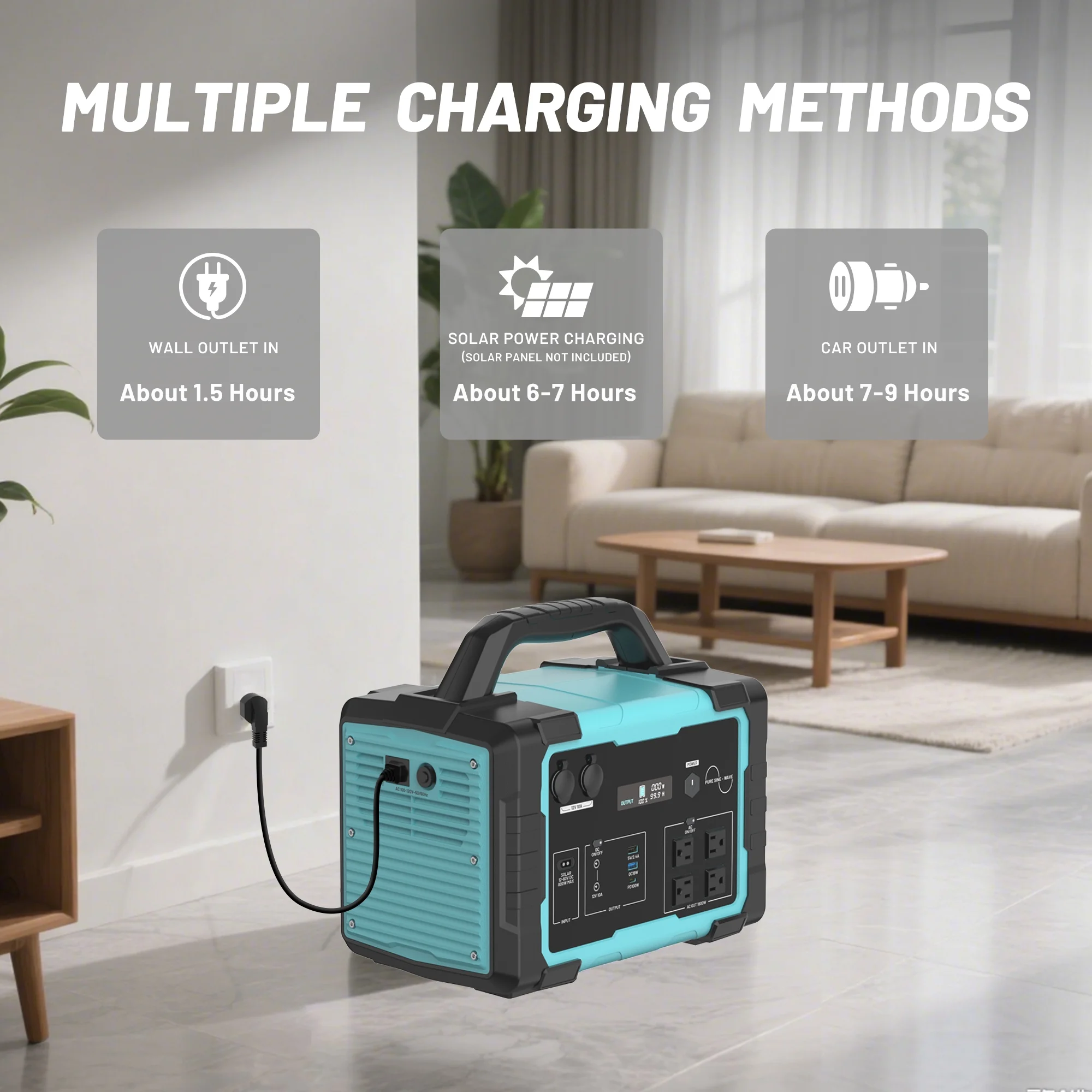 - Fast Charge:The 1000w power station can be charged with AC wall socket in 7-8 hours. with MPPT function, recharge with a 200w solar panel in 6-7 hours.Recharge in 12-13 hours using Car charging.