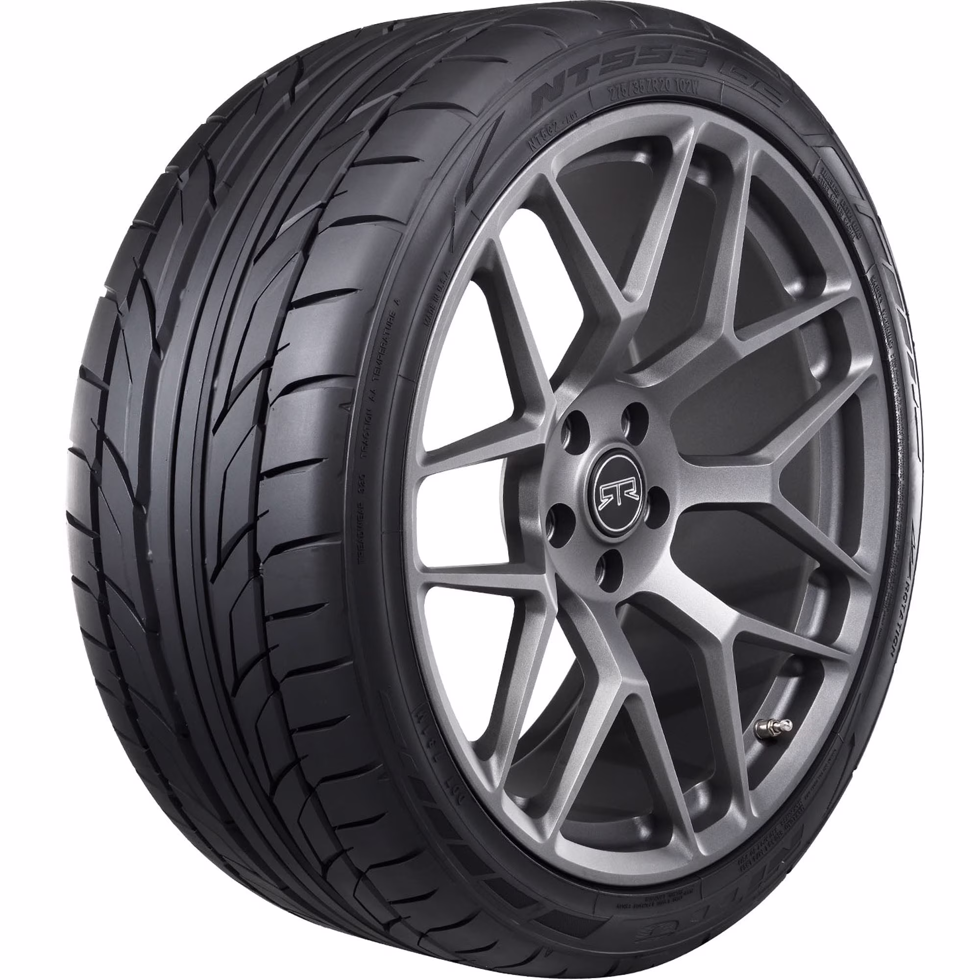 The Nitto NT555 G2 is an ultra-high performance summer tire designed for drivers of modern high-performance vehicles, engineered for increased traction, handling, and wet-braking capabilities. Its cornering performance is enhanced by large, tapered tread blocks that increase stability and grip. For straight-line stability and improved dry traction, the design features twin center ribs. The tire's high stiffness and silica compound, along with reinforced shoulder treadblocks, further improve handling in both wet and dry conditions, while a large circumferential groove aids in hydroplaning resistance.