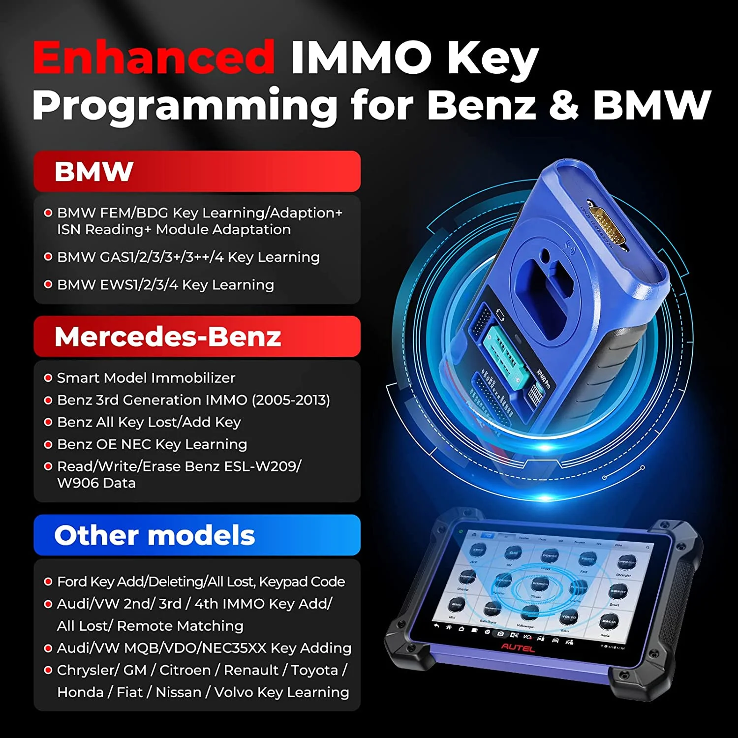 - Compared to IM508, IM608 & IM608 Pro, Autel IM608 II is better in performance & vehicle coverage. Comes with IMKPA & Gbox3 & APB112 to work with XP400 Pro to support 3000+ chip types, read PIN/CS (All Key Lost), backup/restore data, do reset/adaptation/refresh/, extend key generation/add/learning for Benz/Audi/BMW, specialized in Mercedes Benz key data read/write/erase, VW/Audi/BMW/Benz key unlock, Benz OE NEC key learning, etc.