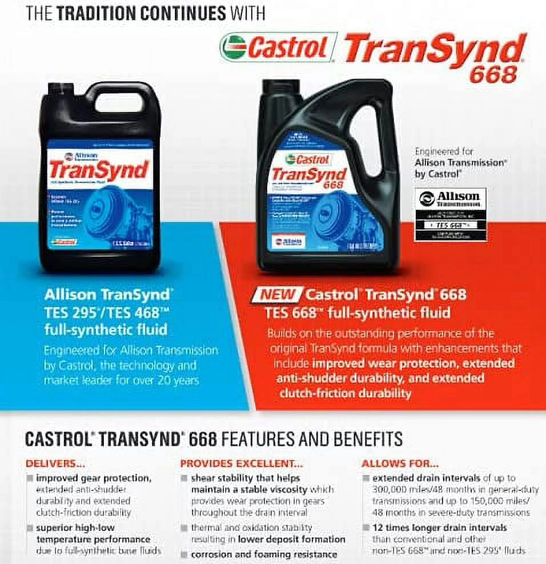 - Allows for extended drain intervals of up to 500, 000 miles / 48 months in normal-duty transmissions