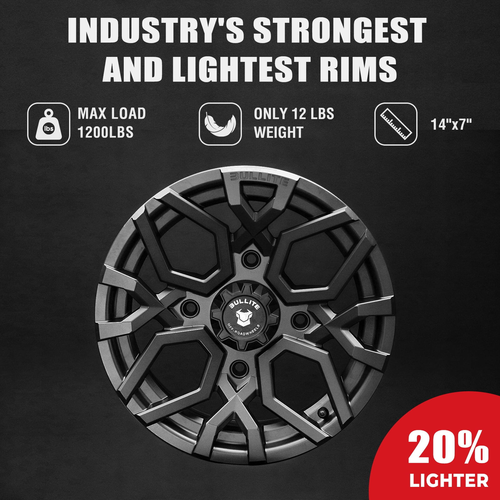 - Sizing and Packaging: Our ATV Wheels Bullite Rims are 14" Diameter, 5+2 Offset, 14x7 Size, 4x156 Bolt Pattern, 132 mm Bore. Valve Stems are Included and Removable bolts on lip. We recommend buy 4 pcs for a set and professional installation as instructions not provided. For your safety, retorque all nut hardware after 25-50 miles. Our products will arrive in a single box.