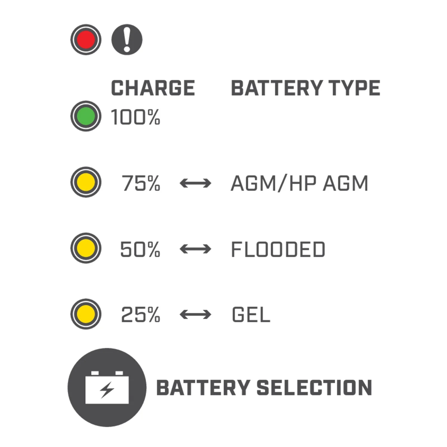 - LED Indicator Lights: Inform of charge stage, maintenance mode status, error notifications and full charge