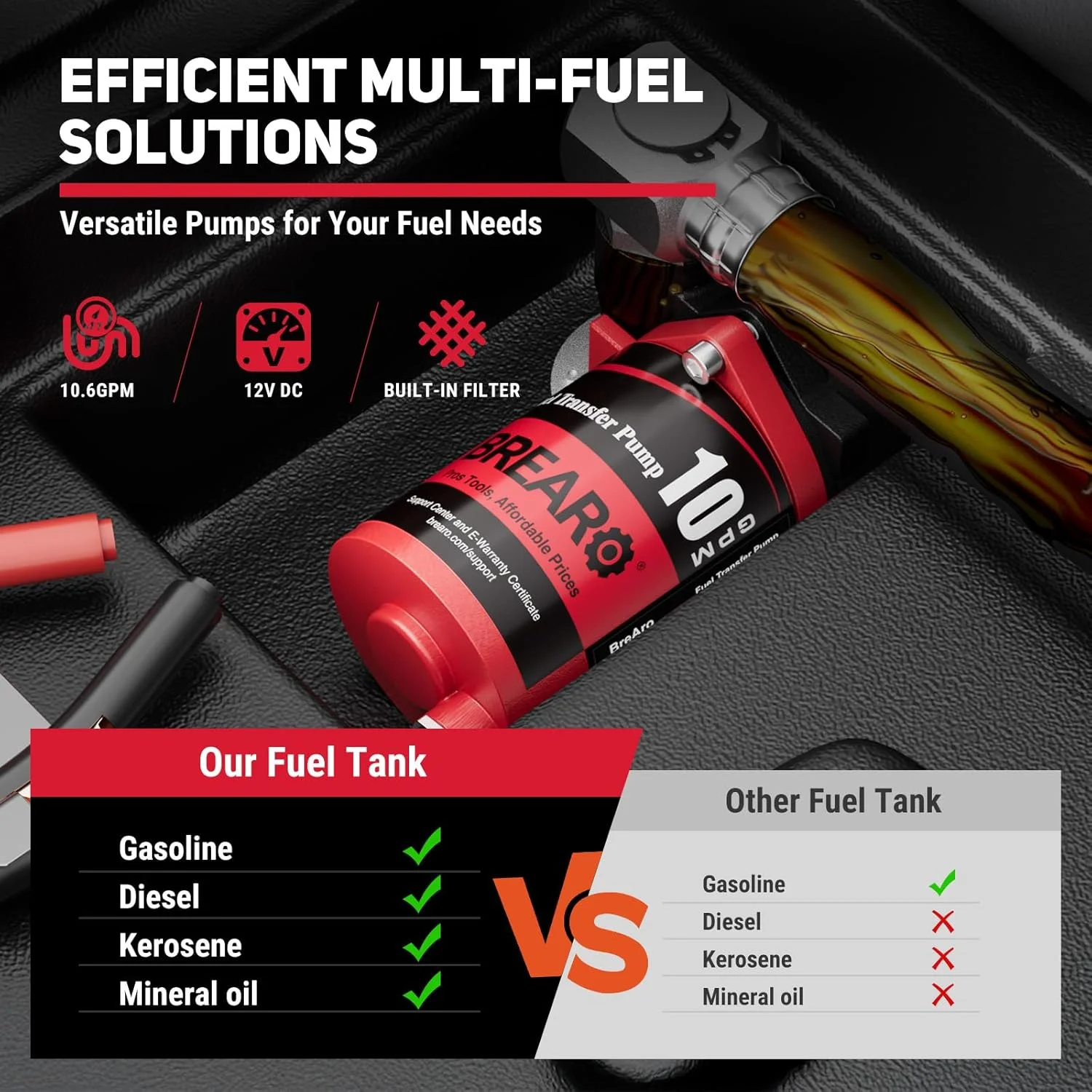 - Efficient pumping system: The diesel transfer tank is equipped with a high-efficiency fuel pump that delivers up to 10.6 gallons per minute (GPM) at 12V. This provides fast and effective fuel delivery, saving you time so you can concentrate on your work rather than waiting to refuel. Plus, the pump's battery cable is 13.1 feet long, allowing for convenient refuelling in a variety of locations