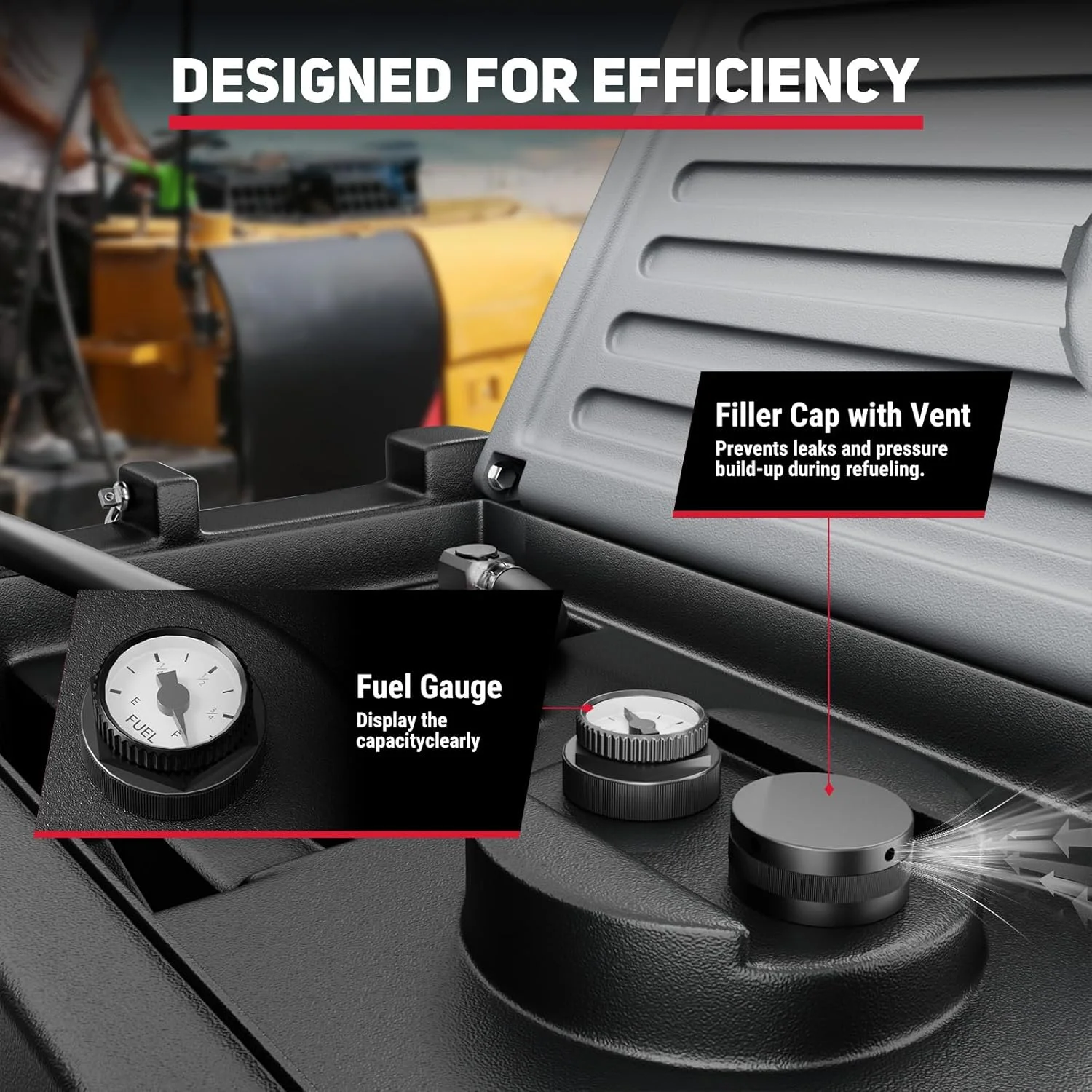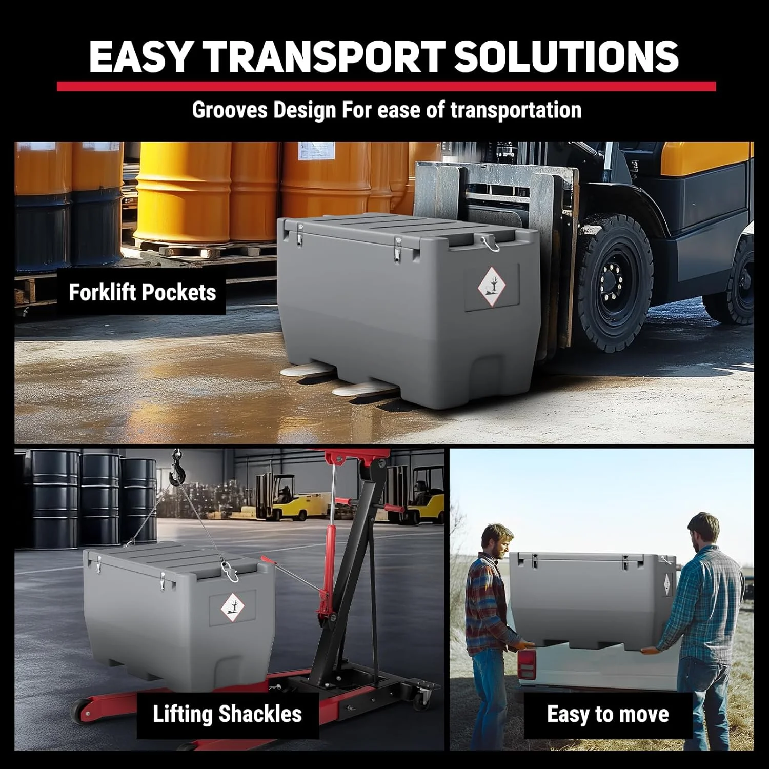 - Portable and Convenient: Lightweight when empty, this portable fuel tank with pump is easy to handle and transport. Its integrated forklift pocket design ensures stable lifting onto a vehicle when full, making it an excellent choice for mobile refueling needs. The compact design allows for easy operation, making it a perfect companion for job sites, farms, or any outdoor activity