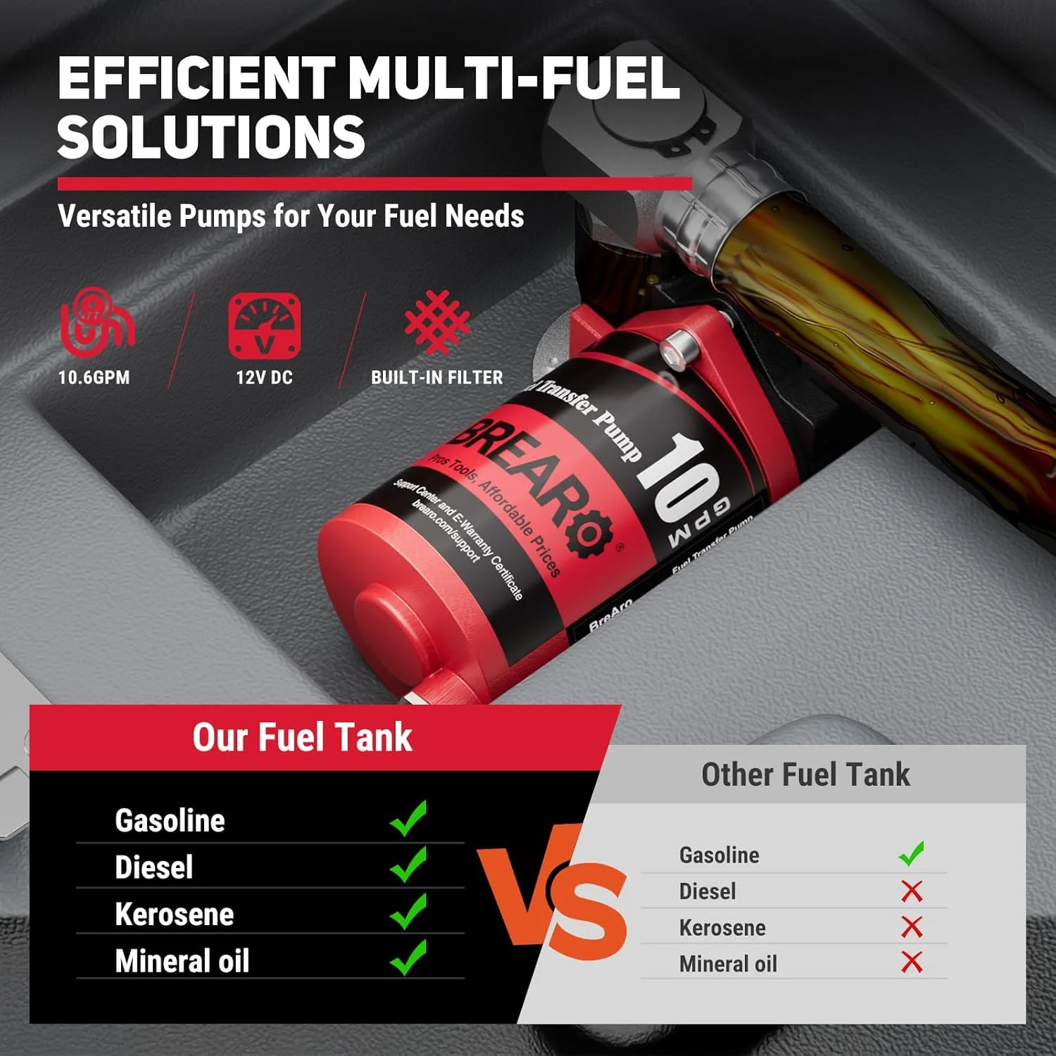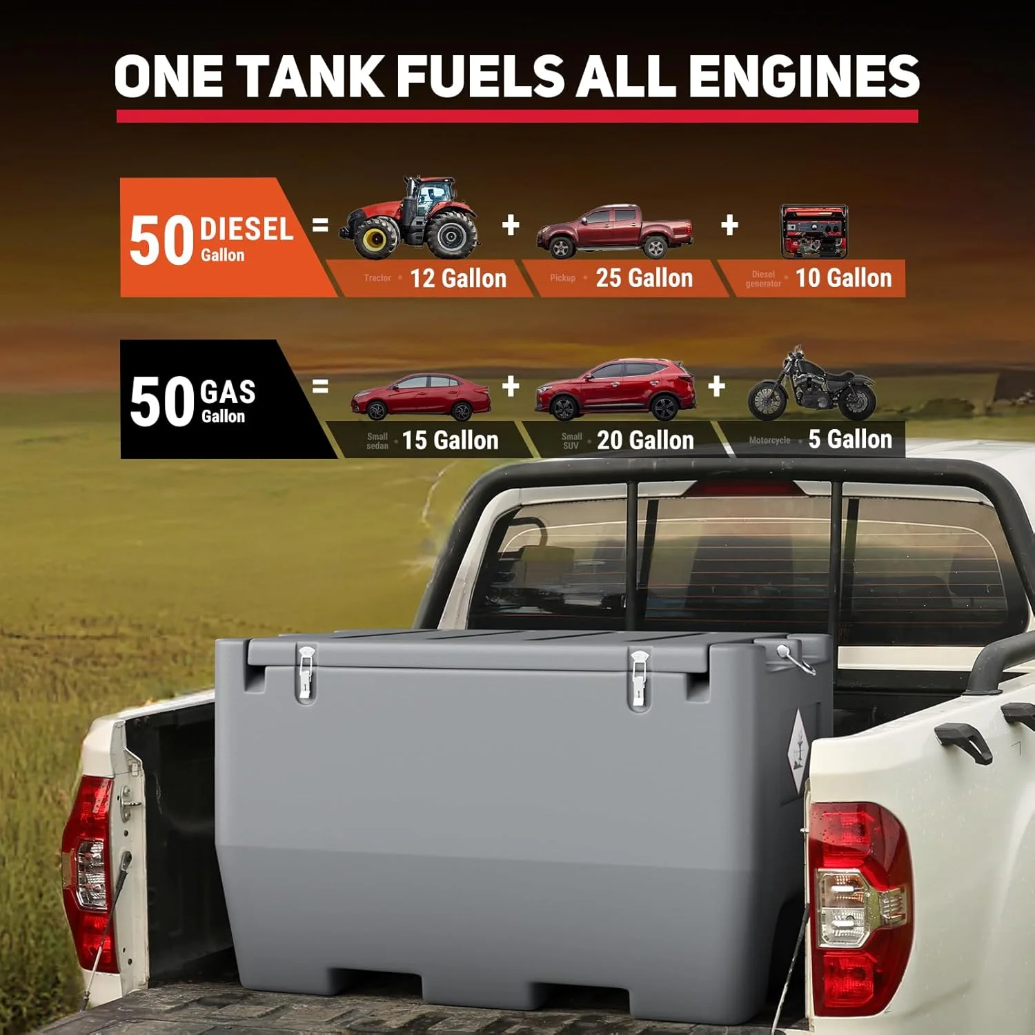 - ?50-Gallon Versatile Fuel Tank: This fuel tank is equipped with a transfer pump suitable for various fuels, including gasoline and diesel, and features a built-in filter to ensure clean fuel delivery. Its 50-gallon capacity provides great convenience for long trips and work, eliminating the hassle of using multiple small containers. It's ideal for tractors, trucks, vehicles, generators, and lawn mowers, meeting all your refueling needs