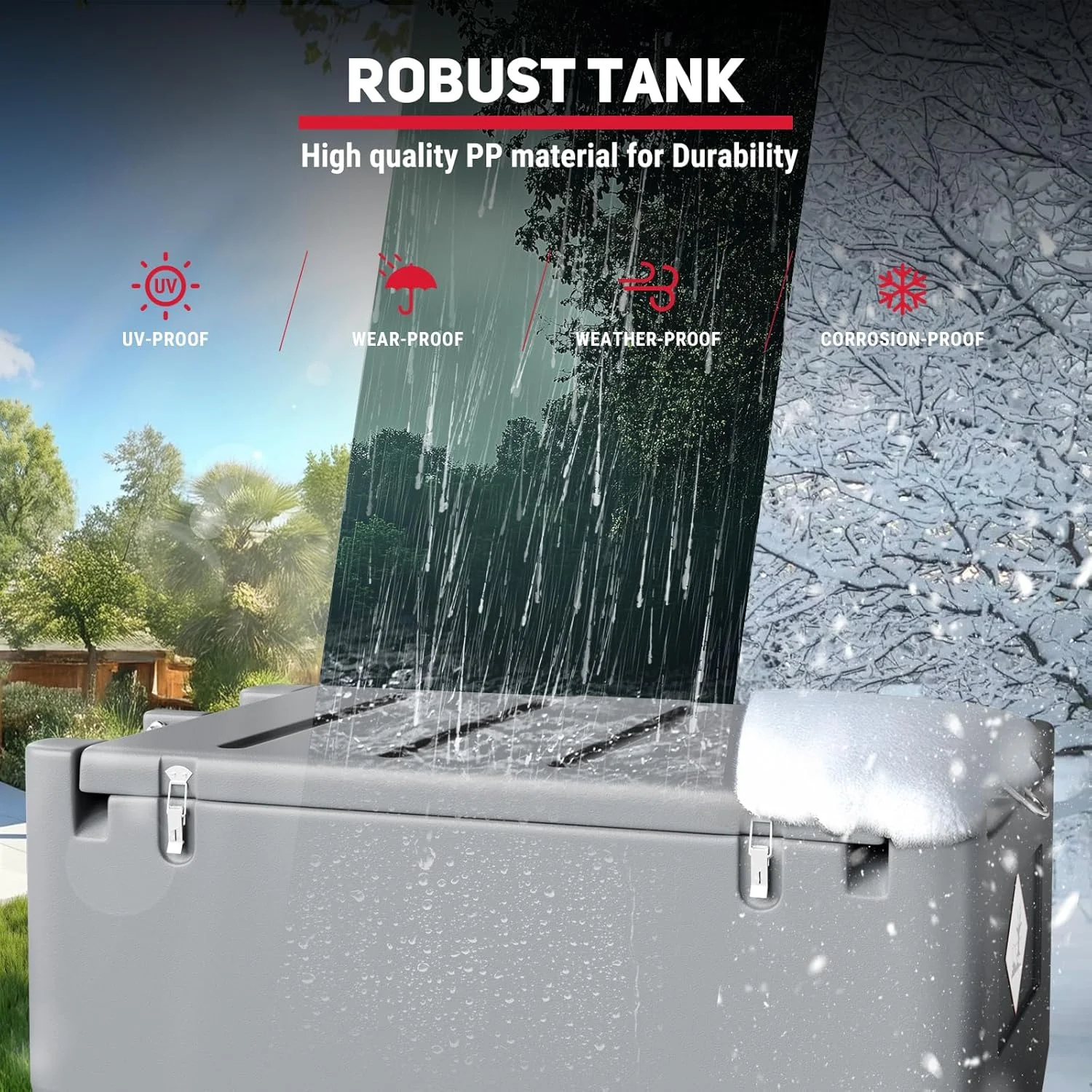 - Durable construction: Constructed from high quality polyethylene, this portable diesel tank is designed to withstand harsh conditions. Its rugged construction resists scratches, dents and other wear and tear, ensuring long-lasting performance even in extreme climates such as high temperatures, rain and snow, as well as demanding