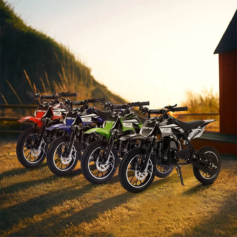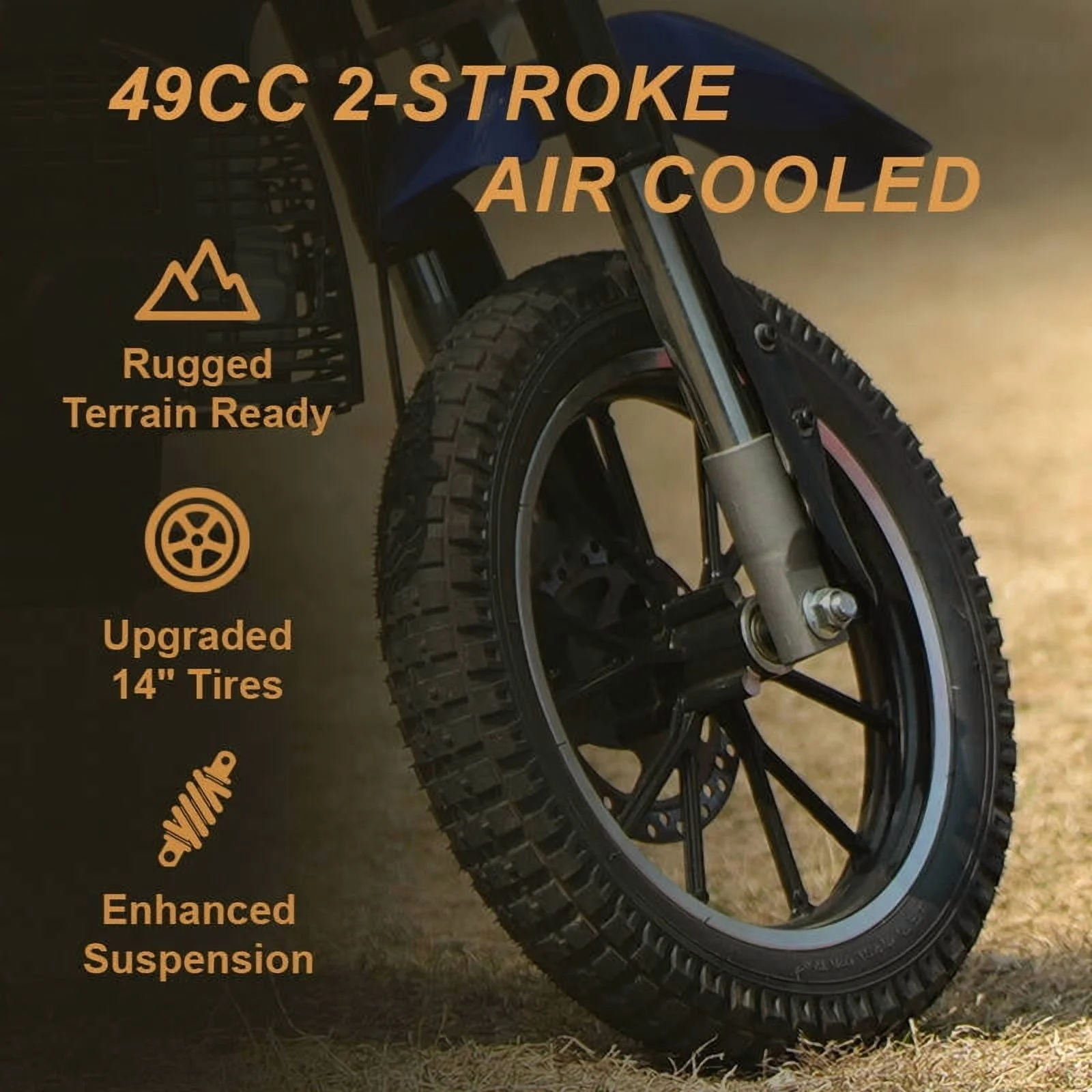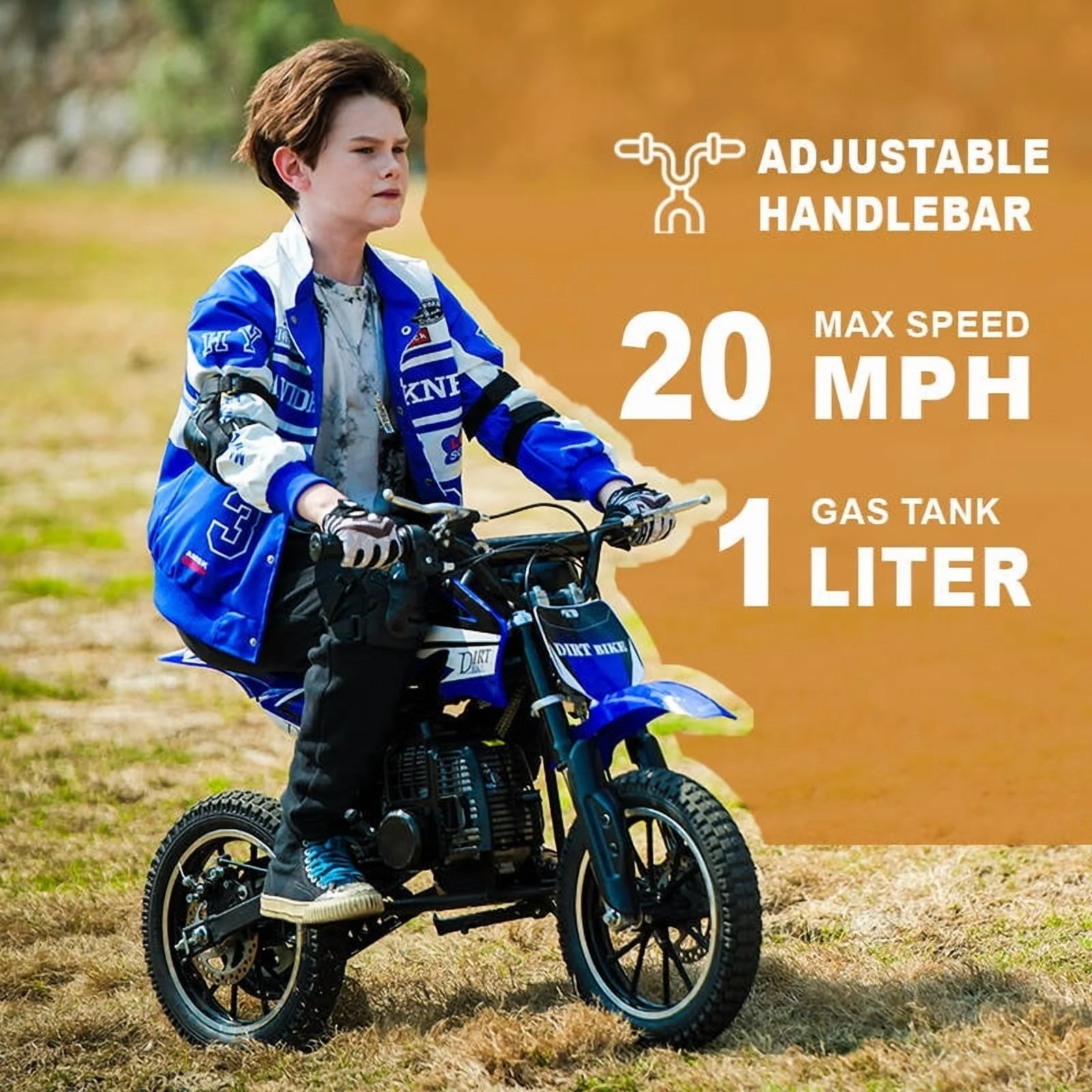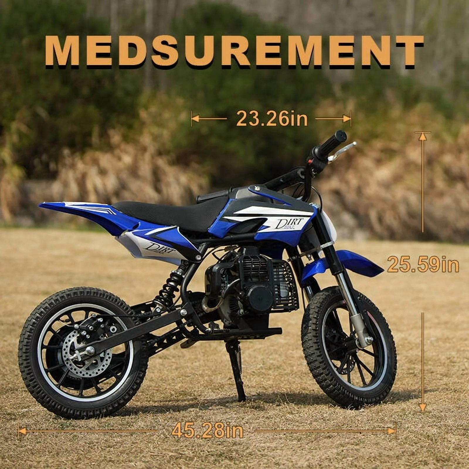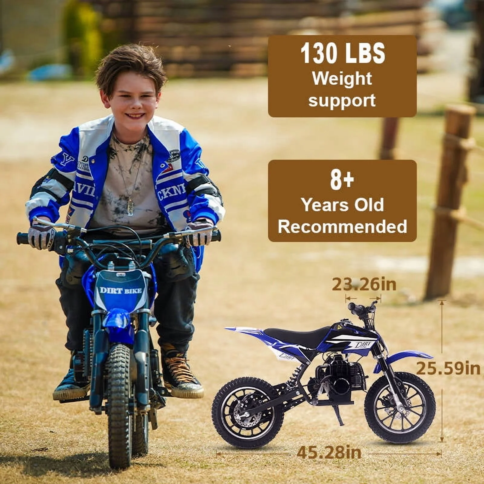 - Powerful & Reliable 2-Stroke Engine Equipped with a high-performance 50cc 2-stroke dirt bike, this kids dirt bike offers nearly double the power of a standard 4-stroke engine. The air-cooled, EPA-approved motor ensures smooth acceleration, while the easy pull-start and upgraded carburetor make setup and riding a breeze.