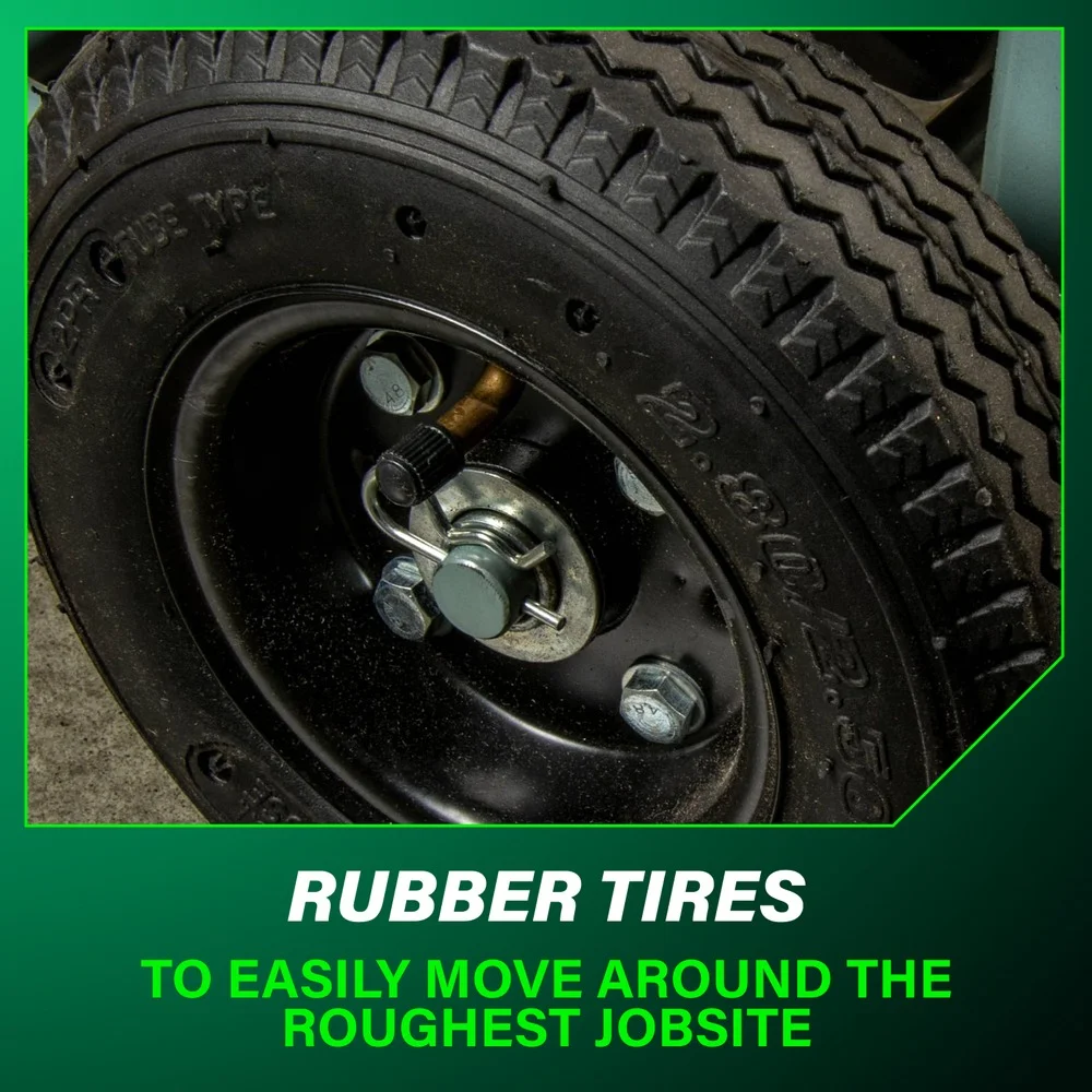 - Easy mobility: Rubber tires smoothly move around the roughest job site