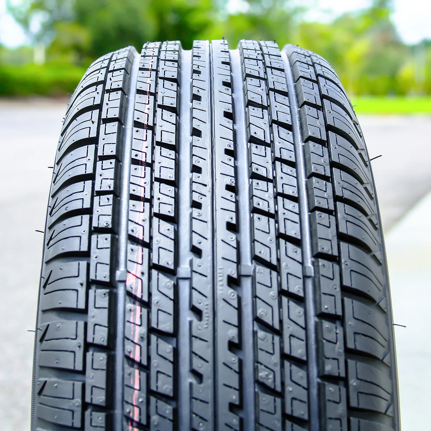 The ribbed tread design maintains surface contact at all times. It helps to ensure a safer forward motion, upgrading steering responsiveness and driving stability. This increases the tire's steering response time and accuracy to the driver's commands, while its structure is stabilized as well. The shoulder blocks, with the sipe placement, firmly grip the road, enhancing cornering and maneuvering abilities. The notch pattern generates friction at the moment of braking, significantly shortening the tire's stopping distance.